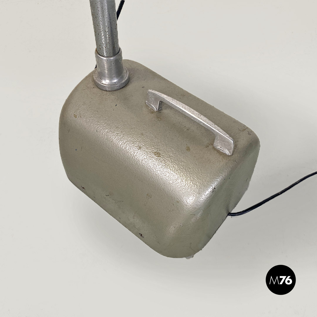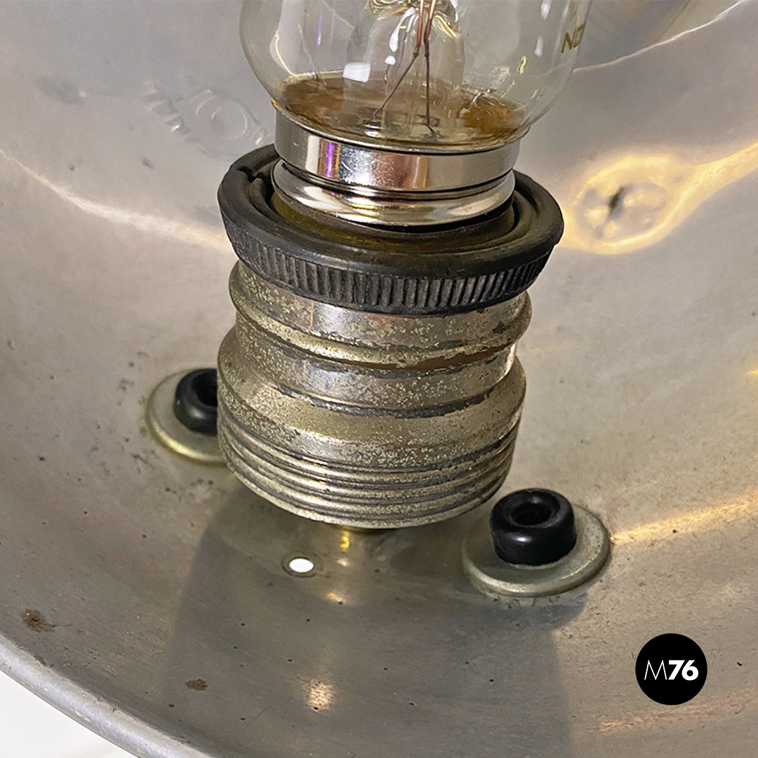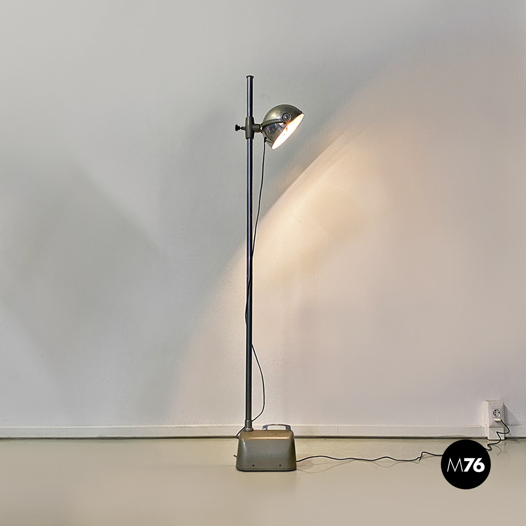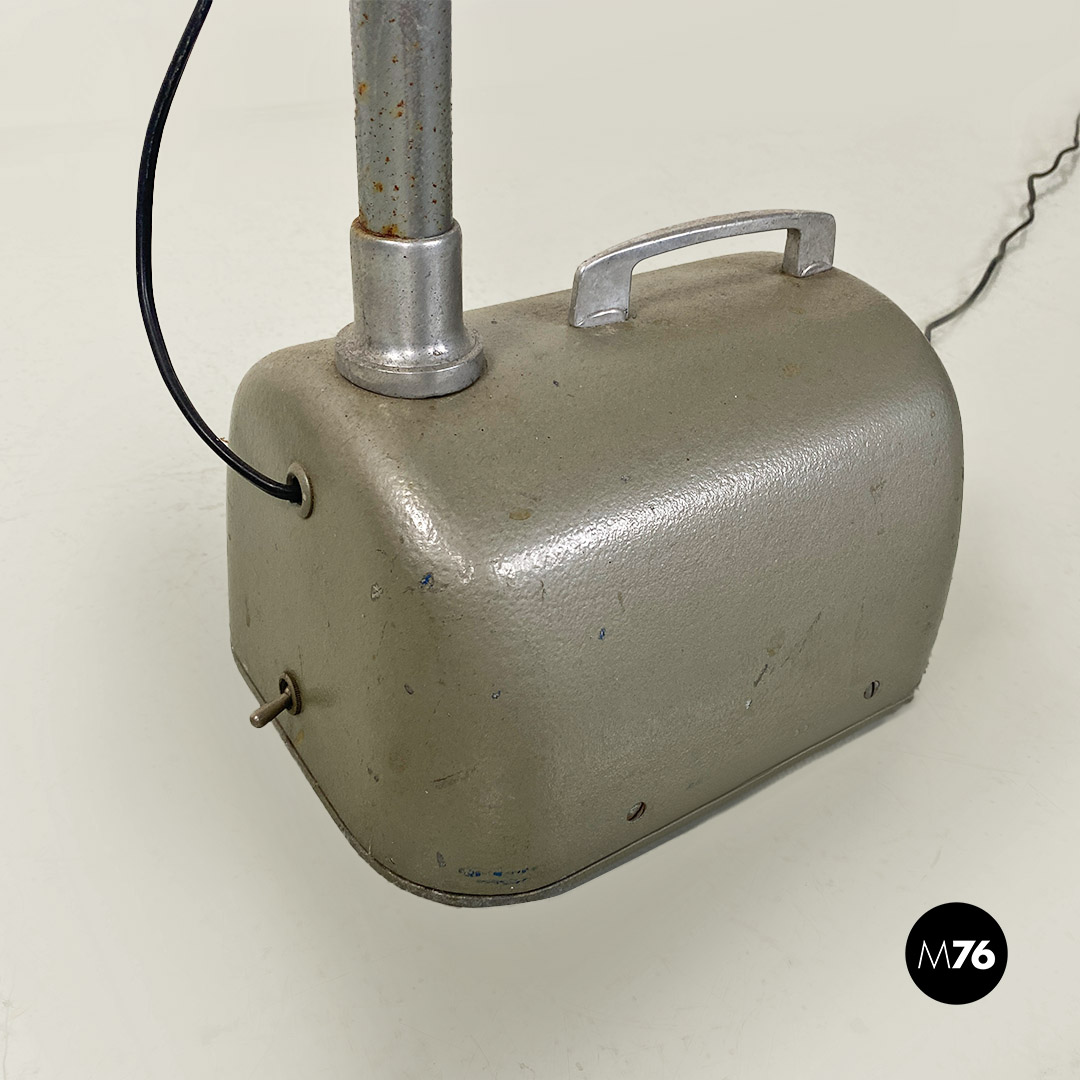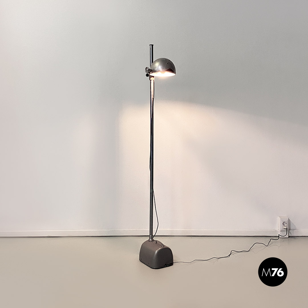 Lampada da terra industriale di provenienza tedesca con base in metallo con maniglia in acciaio e interruttore sul retro stelo sempre in acciaio a sezione tonda su cui scorre e si fissa il paralume tramite una manopola. Paralume semisferico e orientabile in tutte le direzioni.