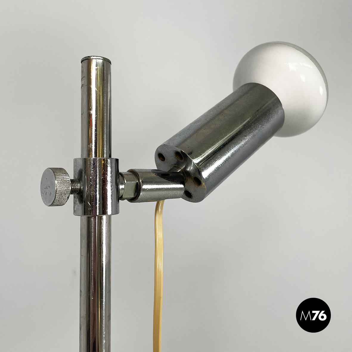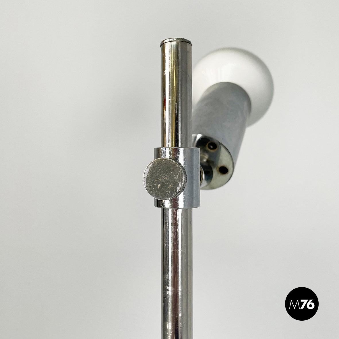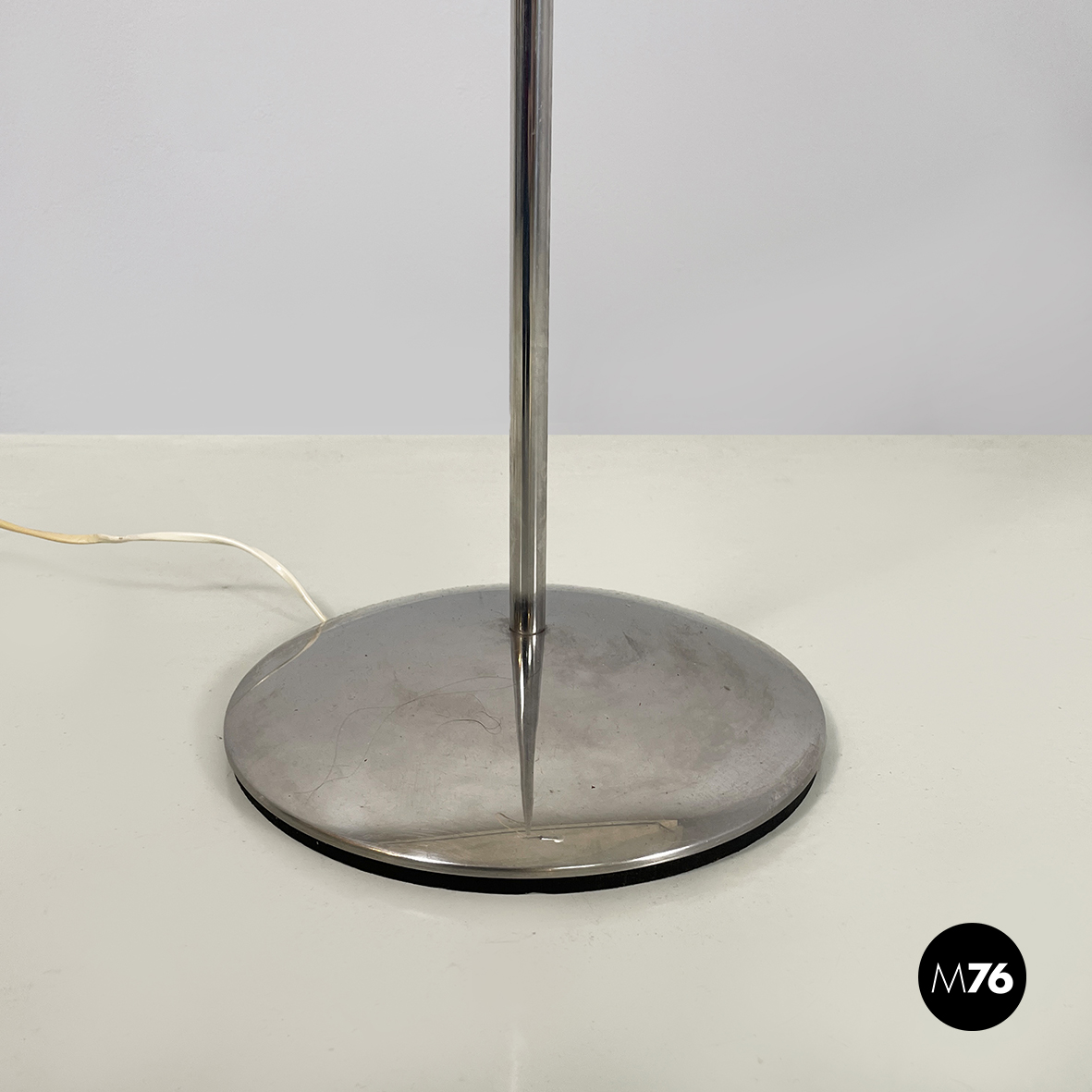 Lampada da terra orientabile interamente in metallo cromato. Il diffusore cilindrico può essere regolato in altezza e in inclinazione. La struttura è composta da un tondino di metallo cromato. La base tonda è leggermente incurvata.