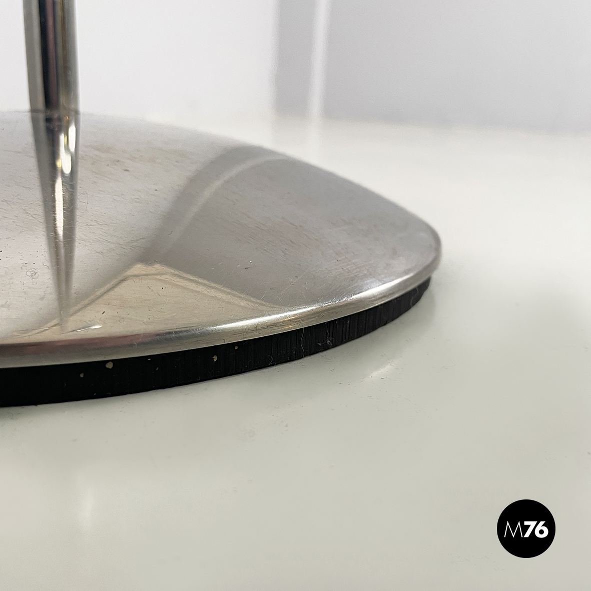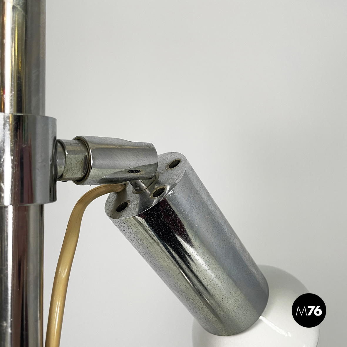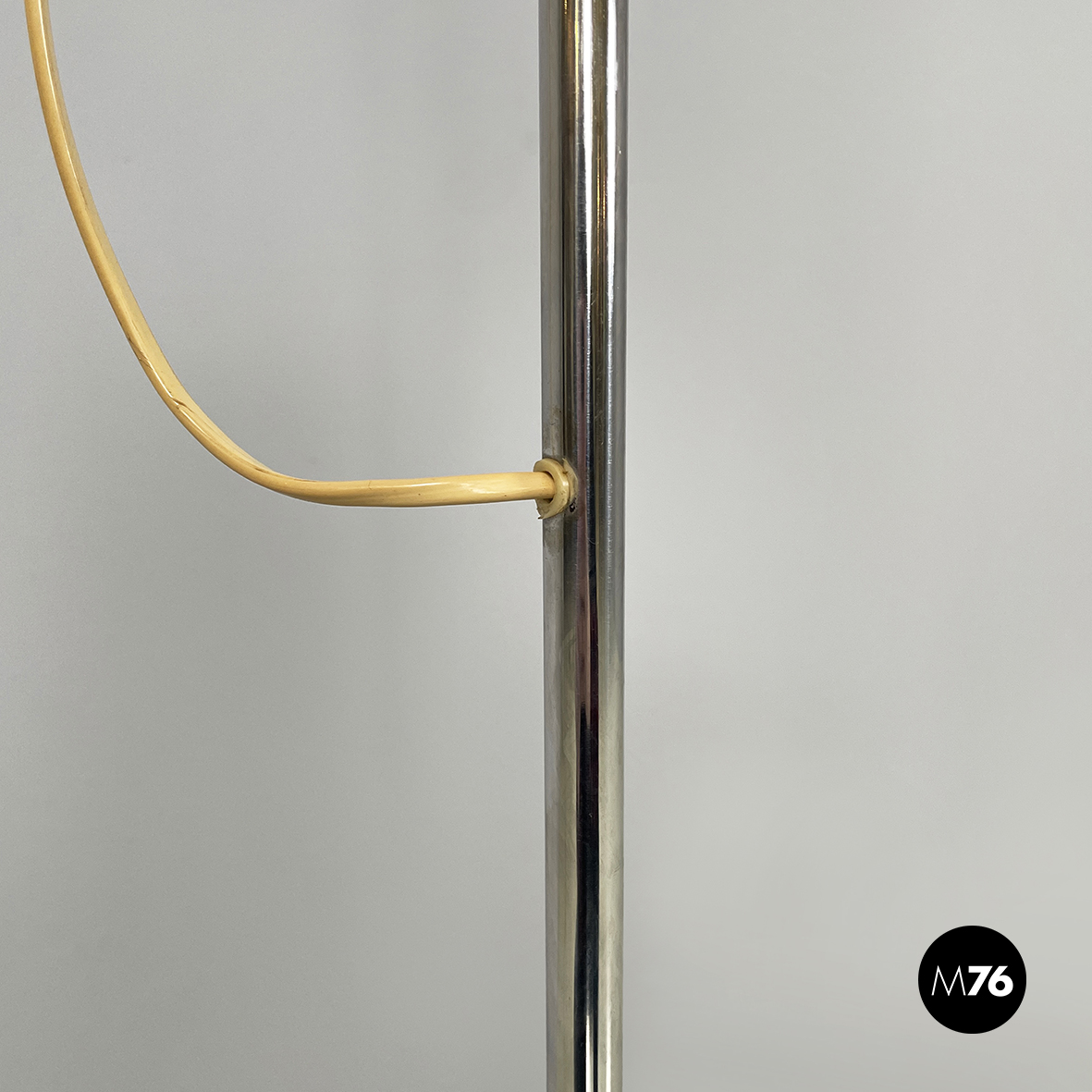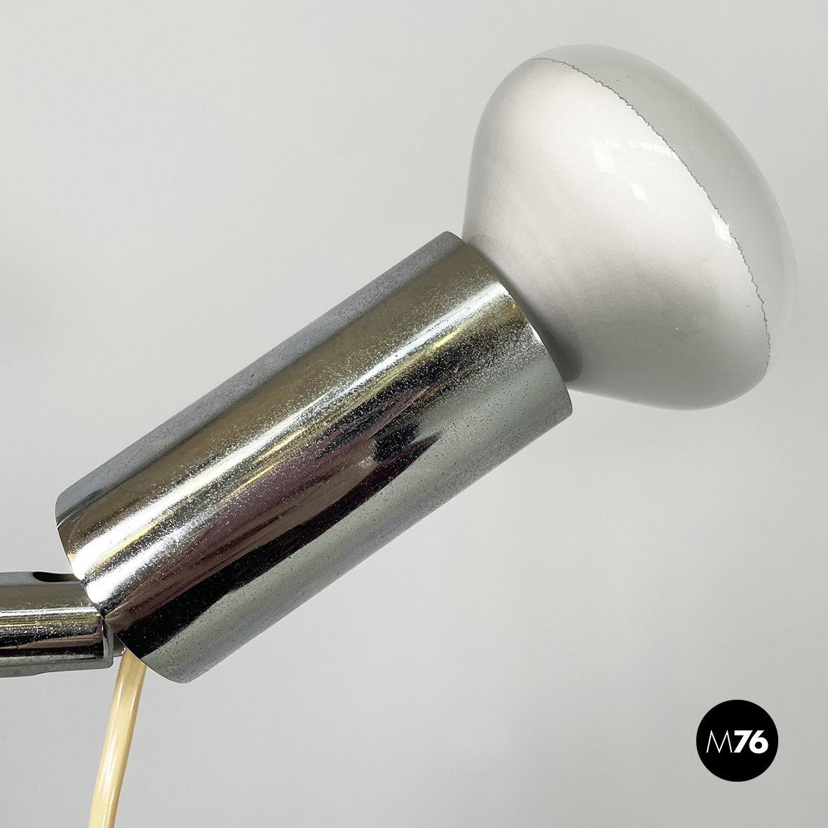 Lampada da terra orientabile interamente in metallo cromato. Il diffusore cilindrico può essere regolato in altezza e in inclinazione. La struttura è composta da un tondino di metallo cromato. La base tonda è leggermente incurvata.