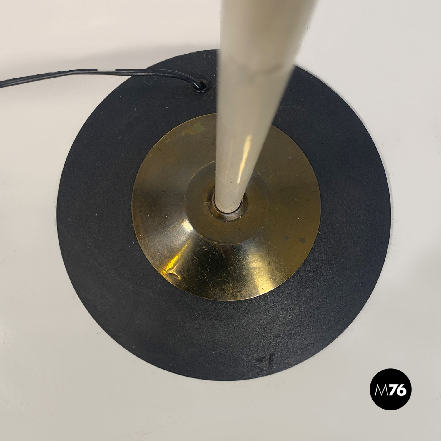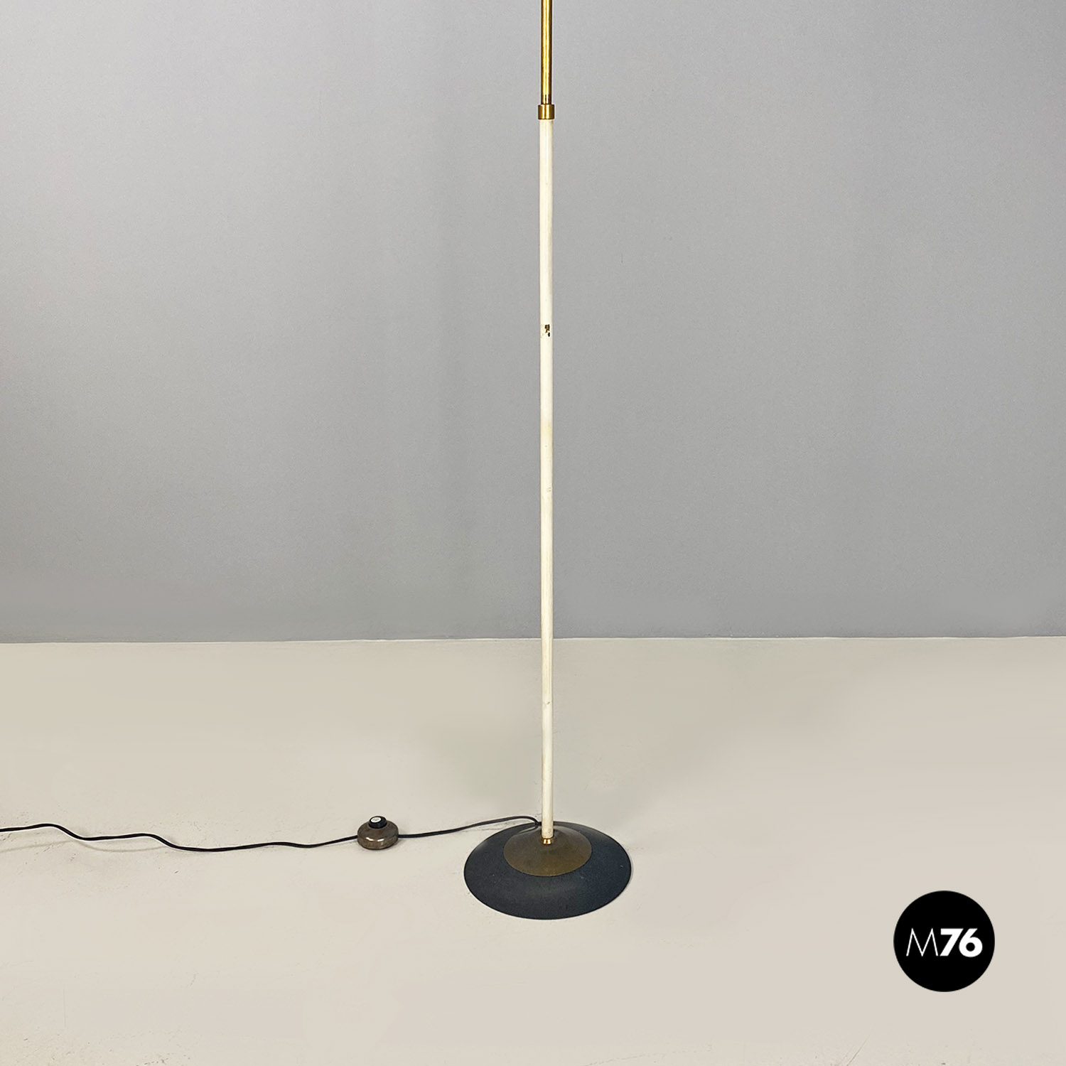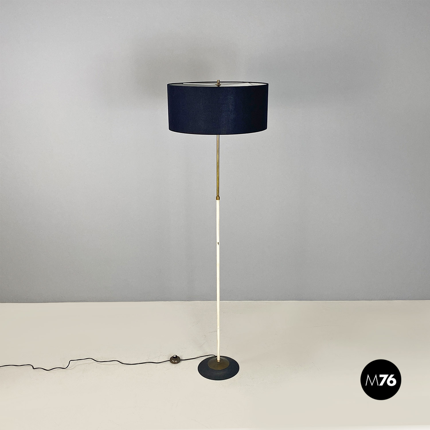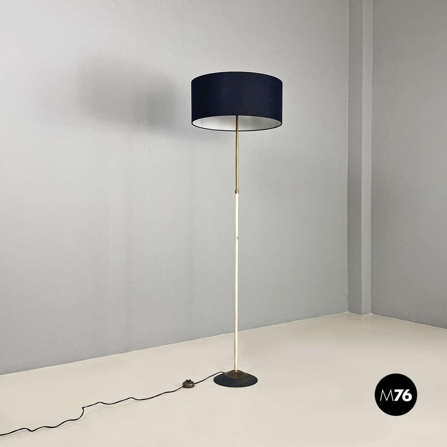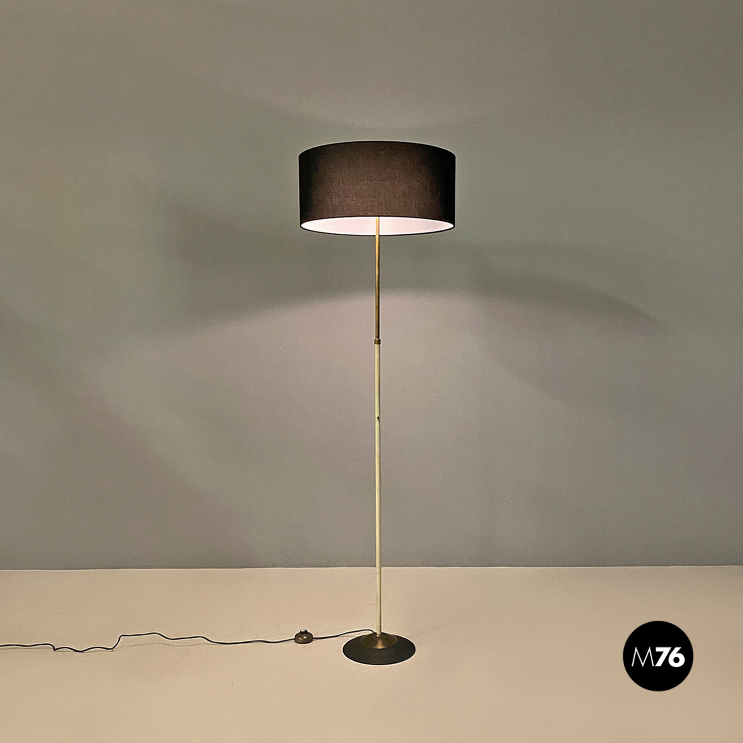Lampada da terra con stelo in ottone parte bassa smaltata bianca e base circolare in metallo nero e ottone e con paralume cilindrico in tessuto nero.