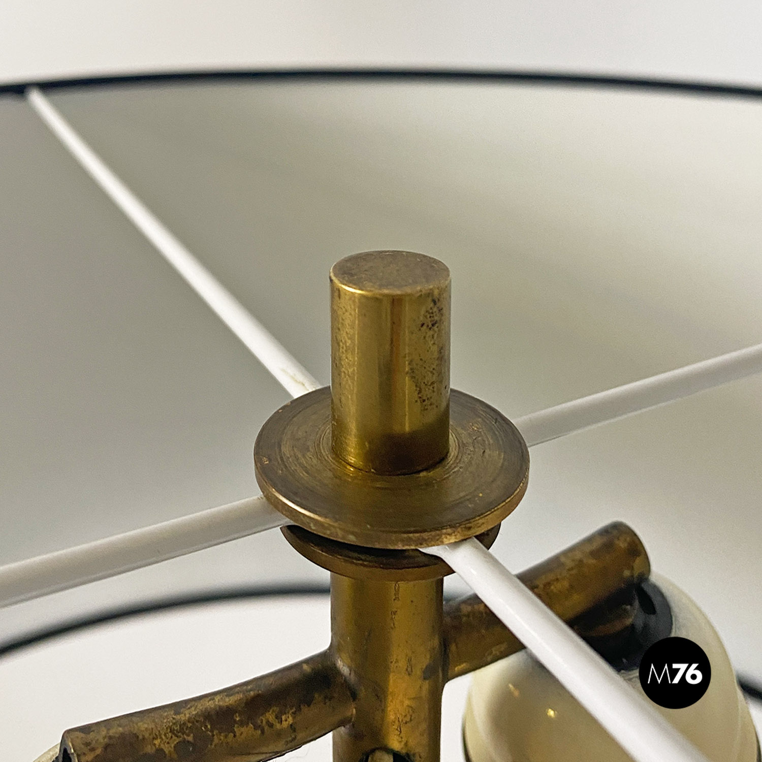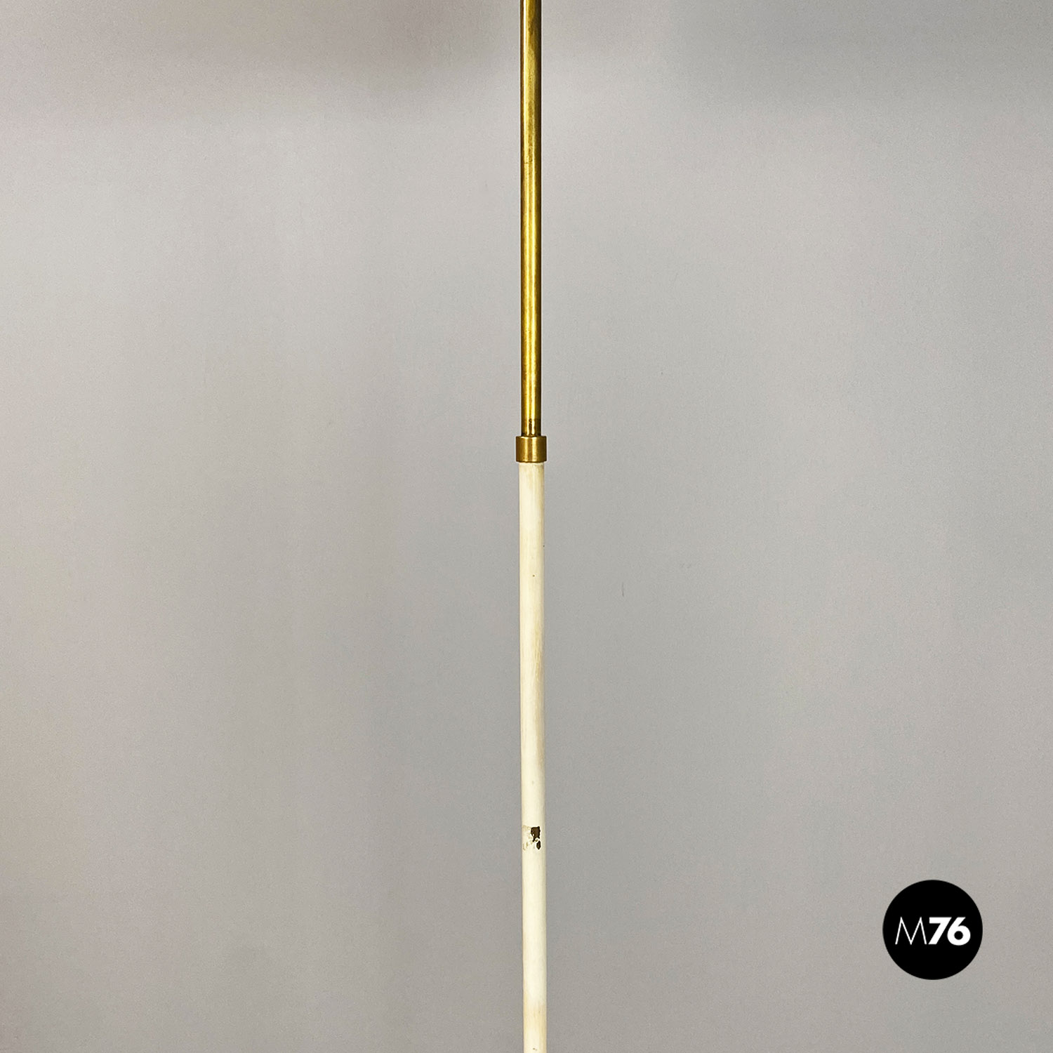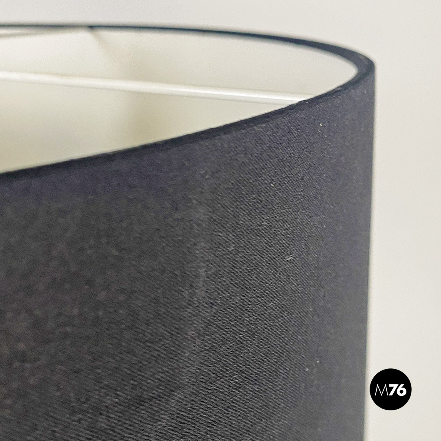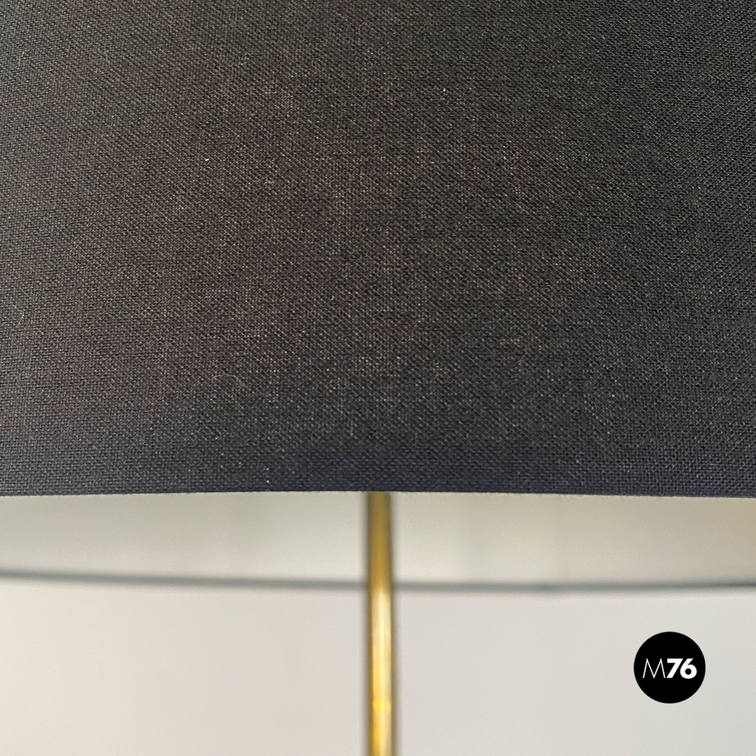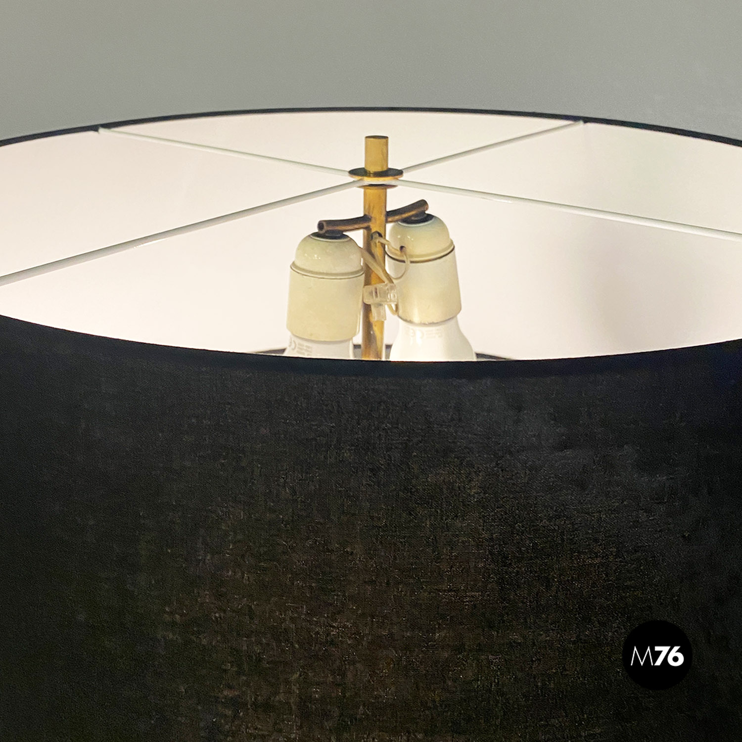 Lampada da terra con stelo in ottone parte bassa smaltata bianca e base circolare in metallo nero e ottone e con paralume cilindrico in tessuto nero.