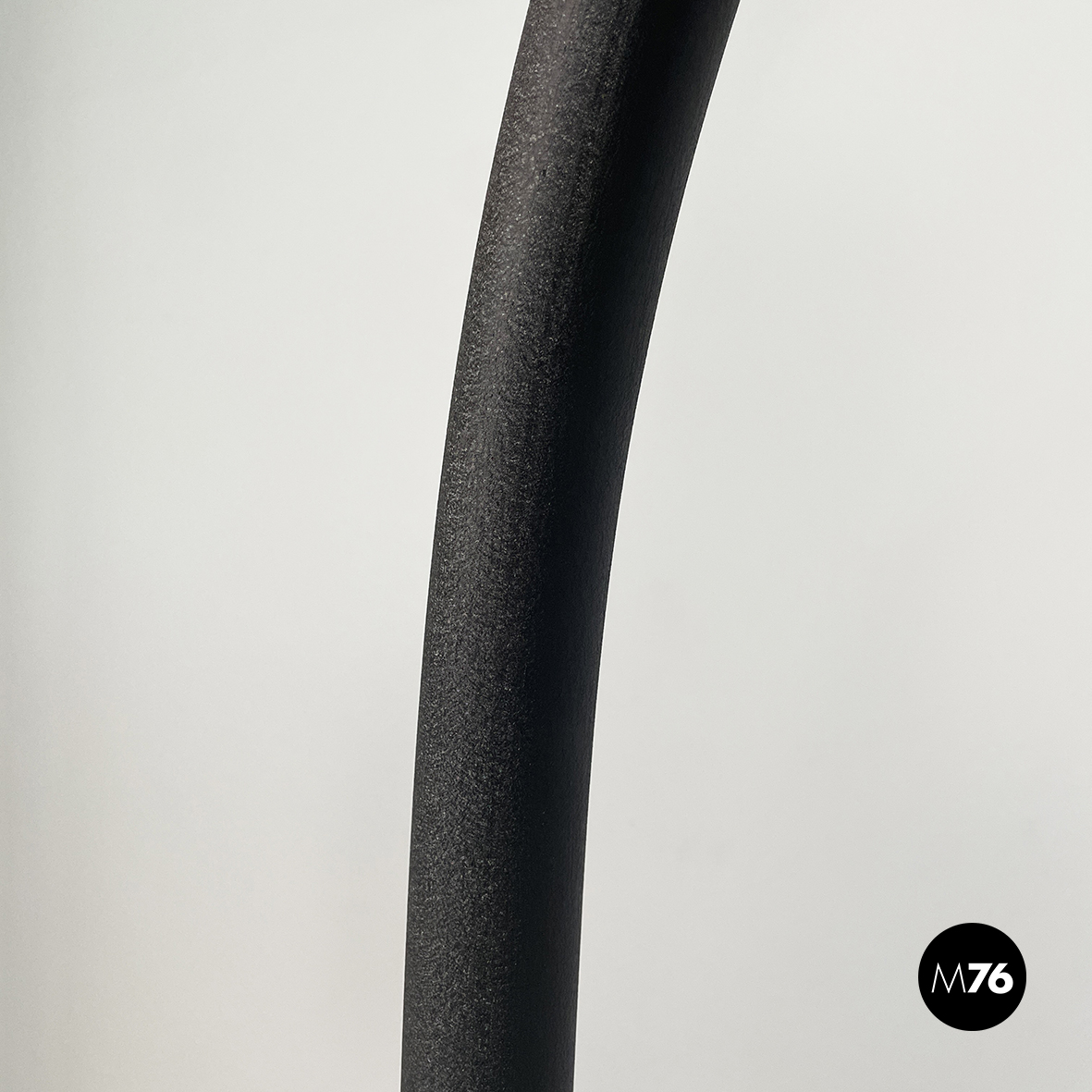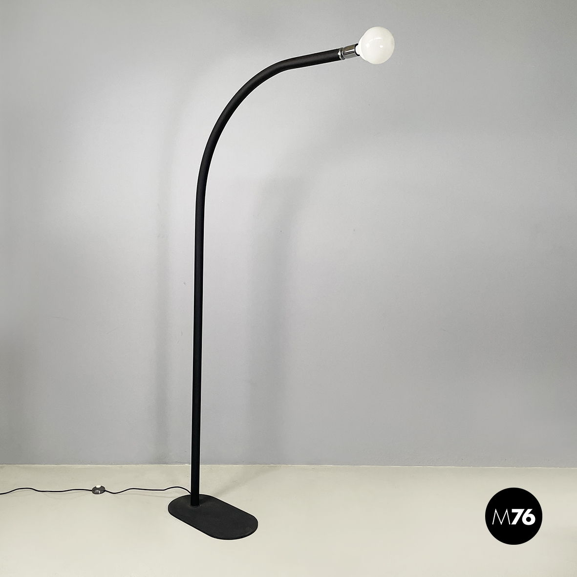 Lampada da terra con base ovale in metallo goffrato nero. La lampadina è a vista e il porta-lampadina è in metallo. La struttura a sezione tonda è ad arco ed è anche essa in metallo goffrato nero.