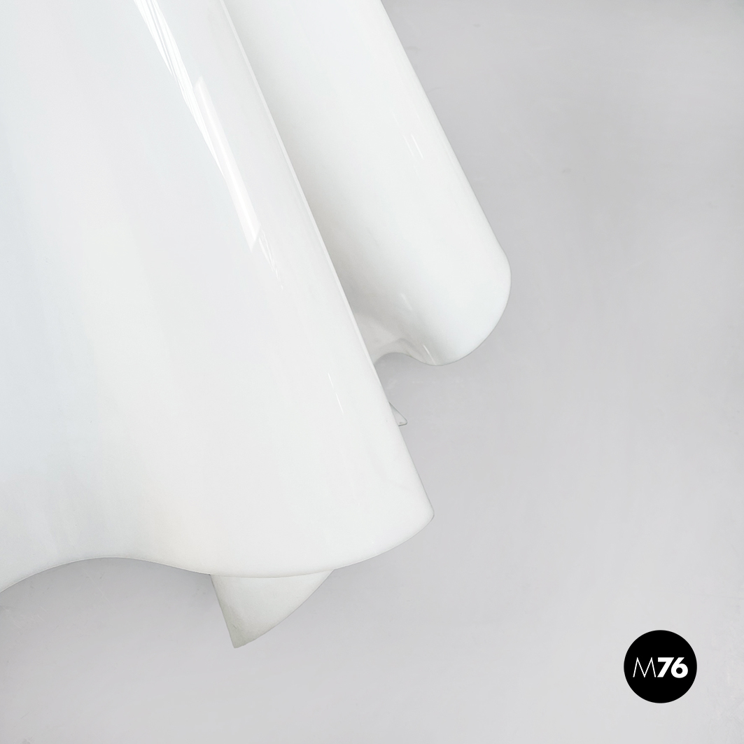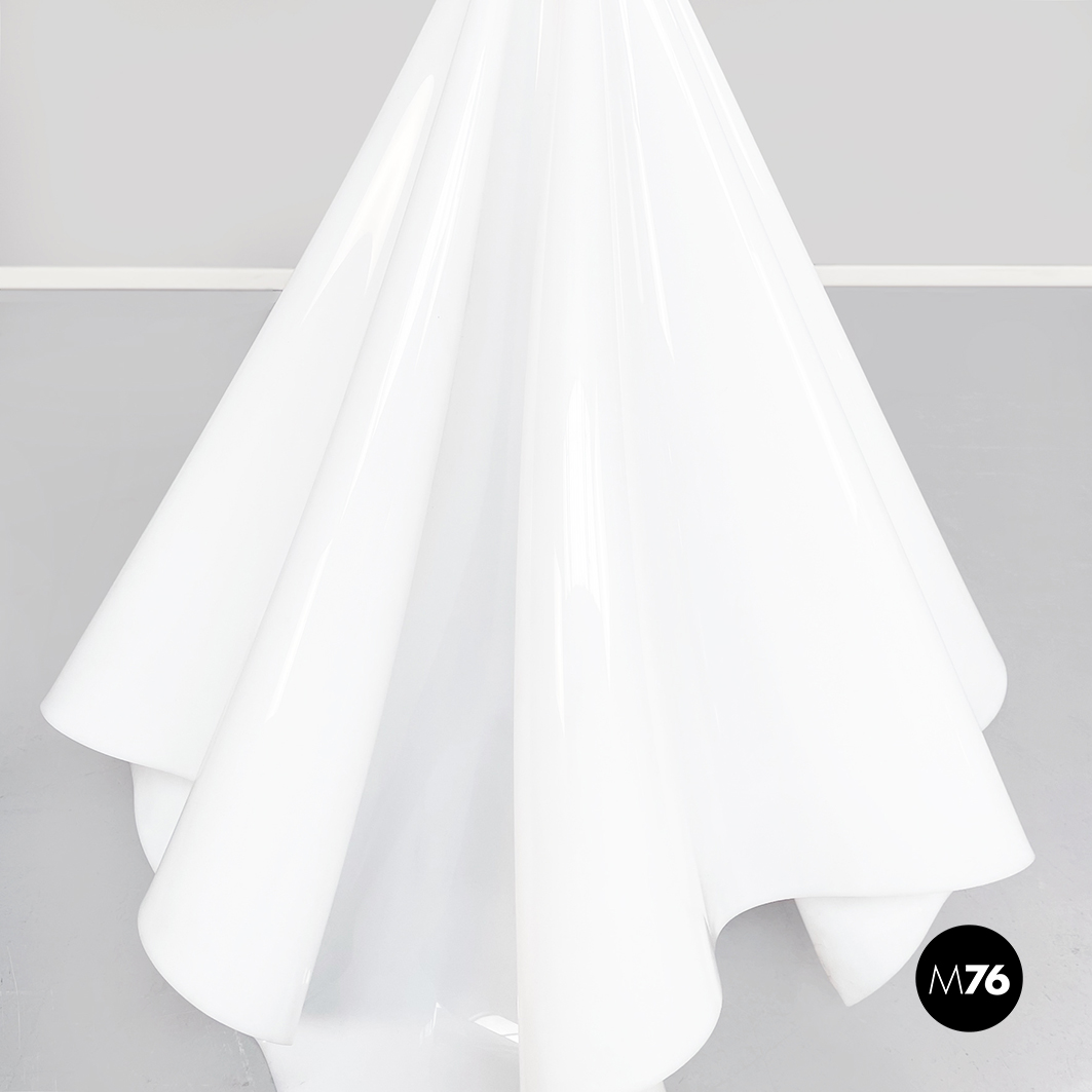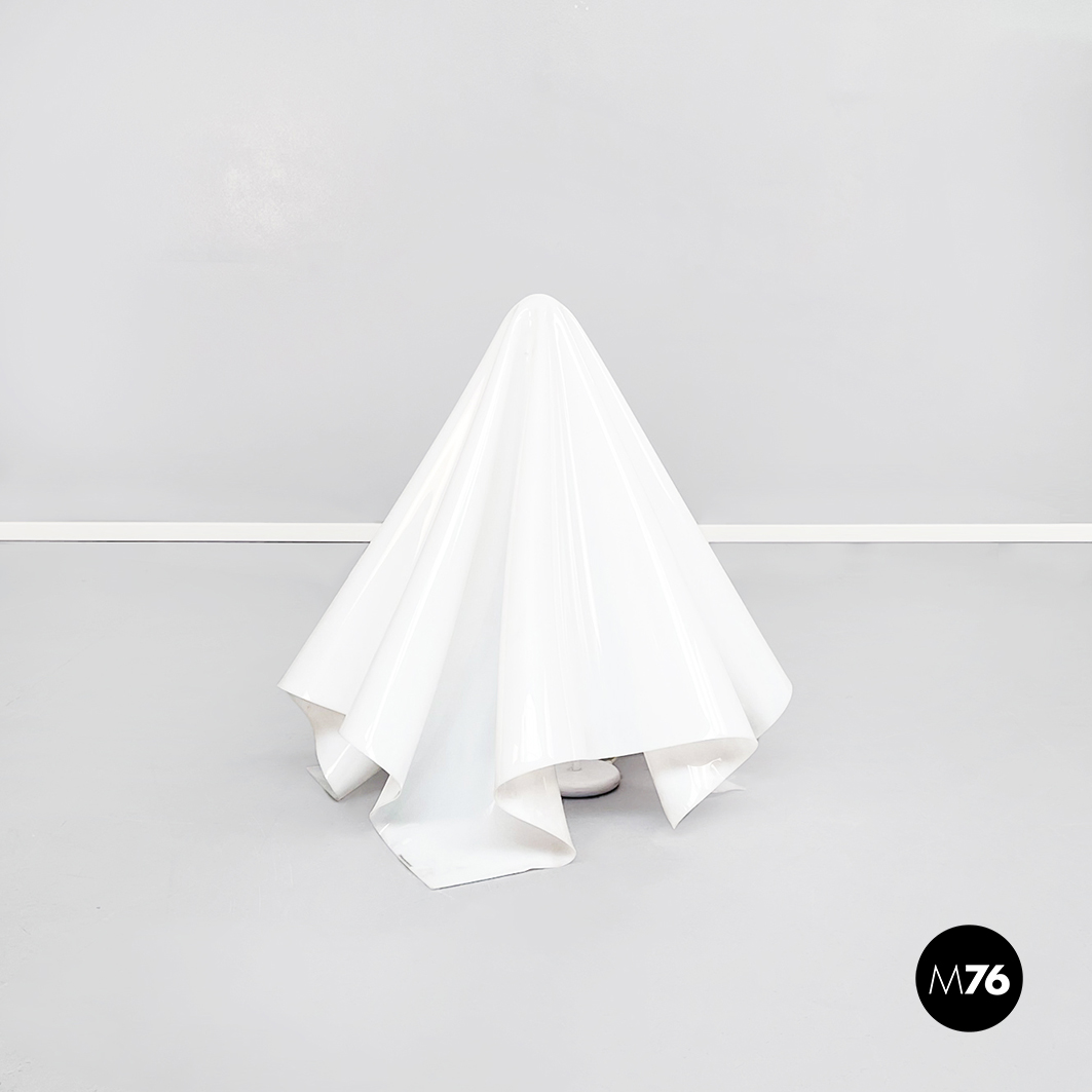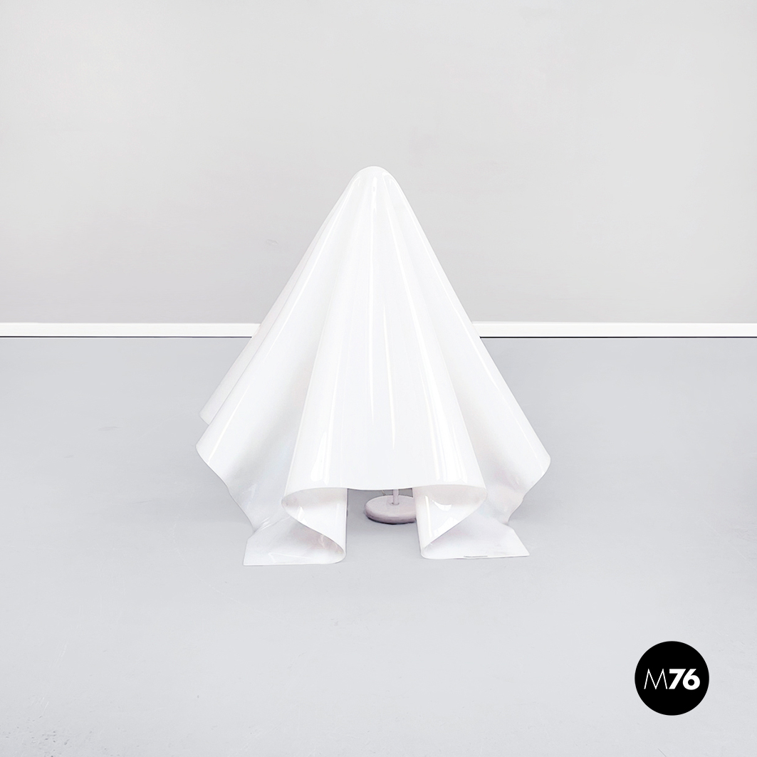 Lampada da terra Fantasma con paralume in vetro acrilico bianco che ha la forma di un telo fluttuante appoggiato a terra. La base è un asta con piedino tondo in metallo verniciato bianco. La struttura del paralume quindi si auto-sostiene e sembra fluttuare come un fantasma.
