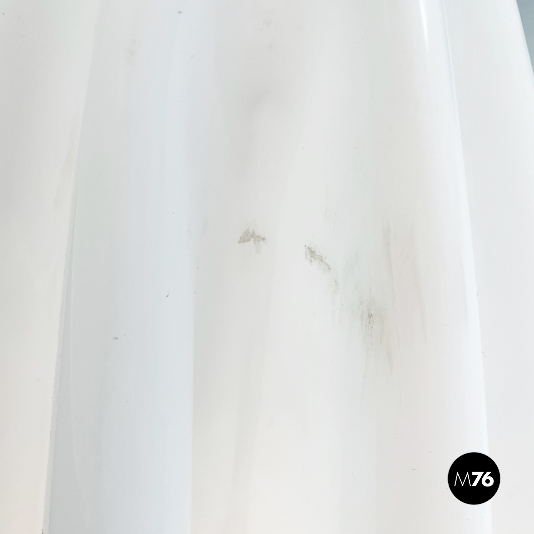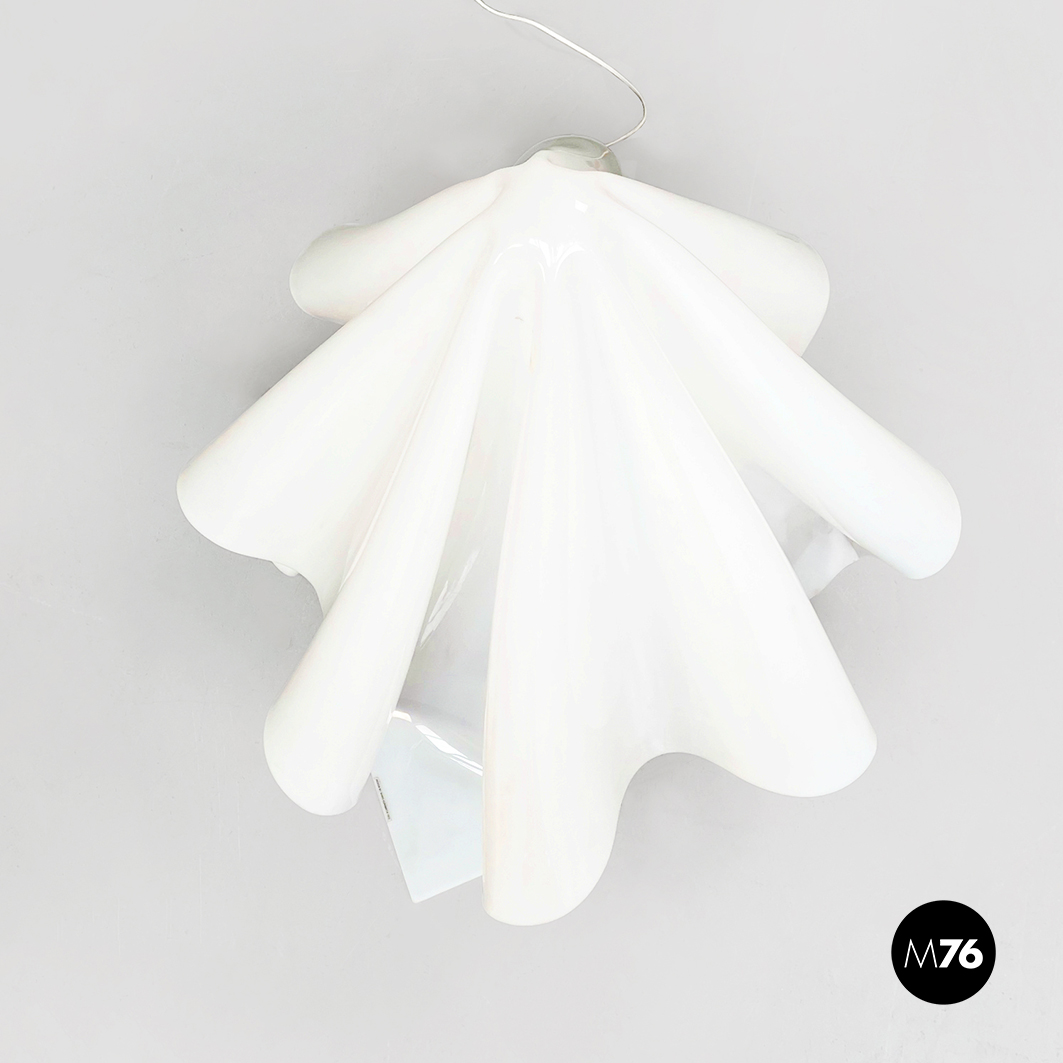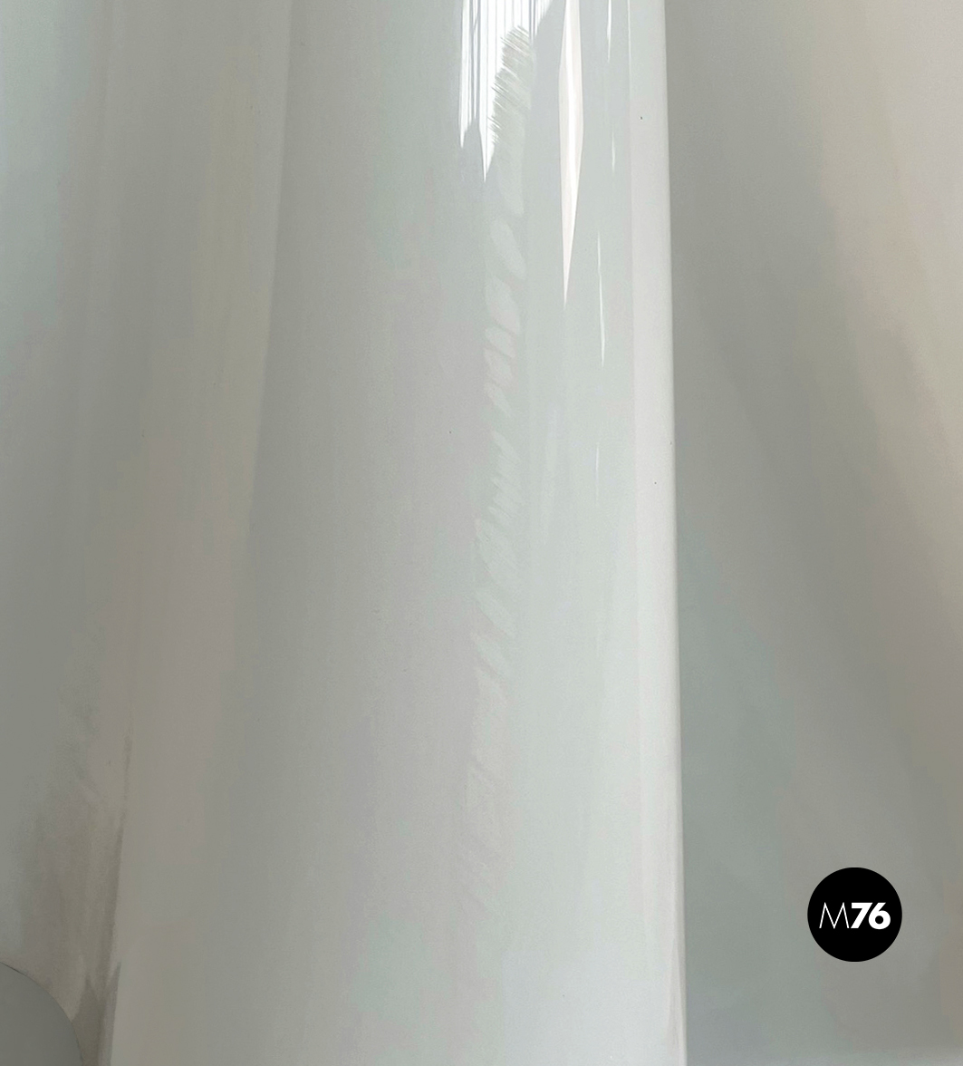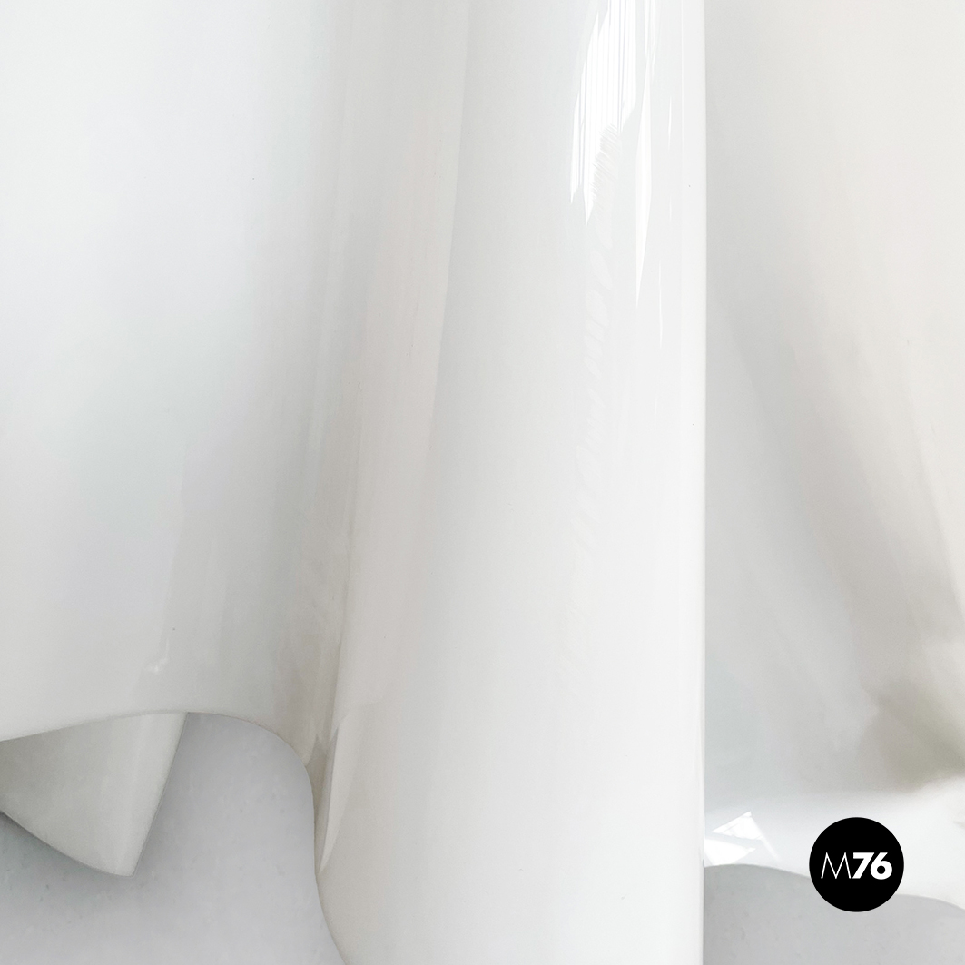 Lampada da terra Fantasma con paralume in vetro acrilico bianco che ha la forma di un telo fluttuante appoggiato a terra. La base è un asta con piedino tondo in metallo verniciato bianco. La struttura del paralume quindi si auto-sostiene e sembra fluttuare come un fantasma.