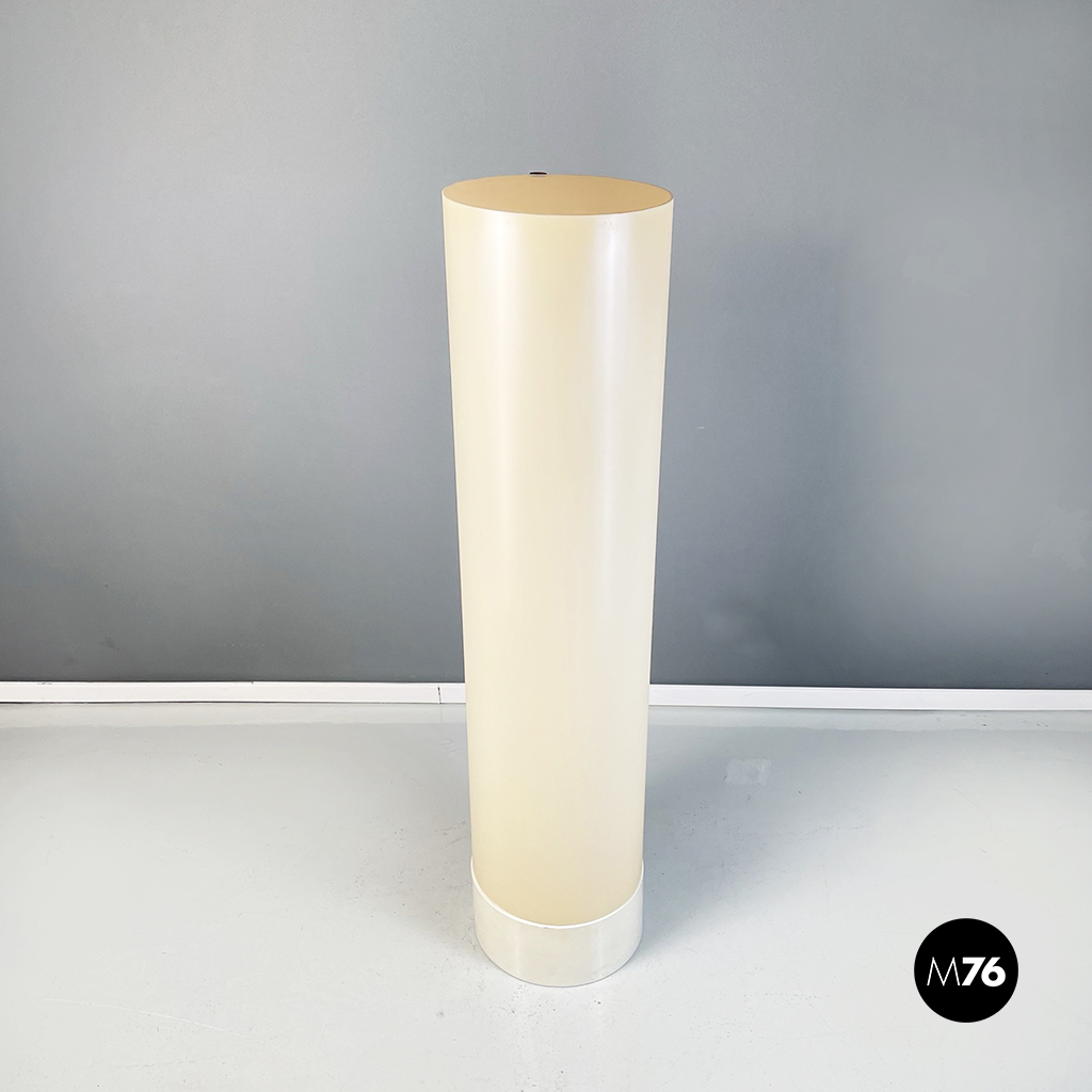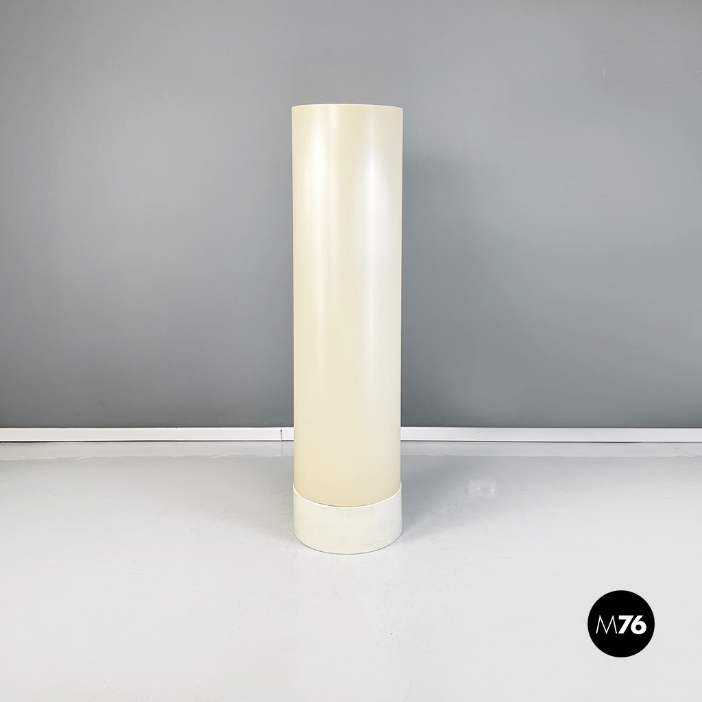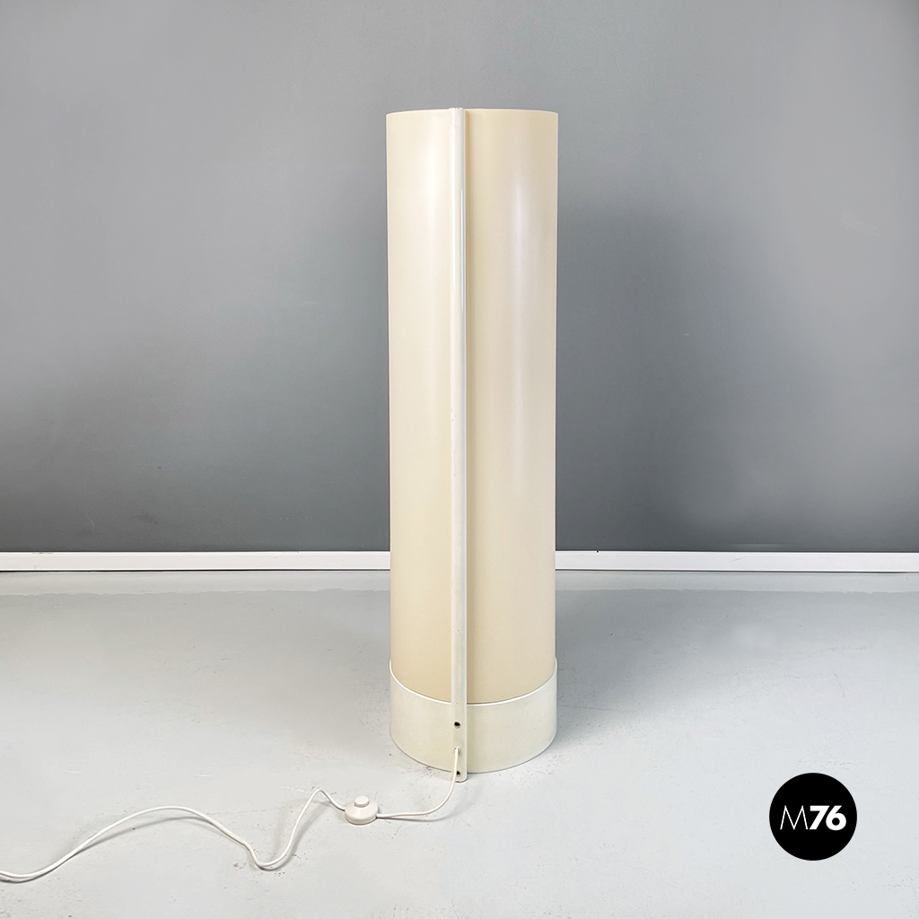 Lampada da terra modello Flu a base tonda in metallo verniciato bianco. Il paralume cilindrico in PVC color bianco crema è sostenuto da due tubolari uno interno e uno esterno.