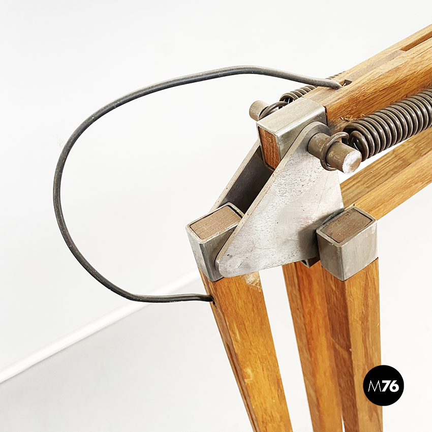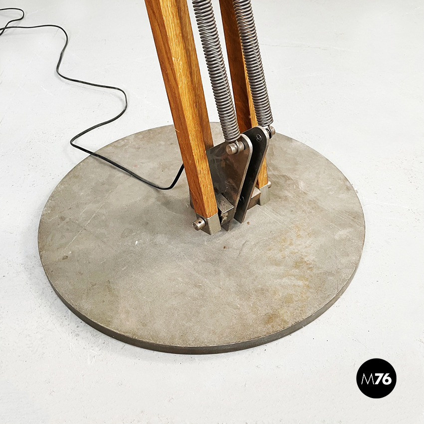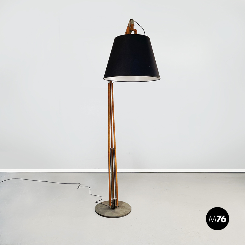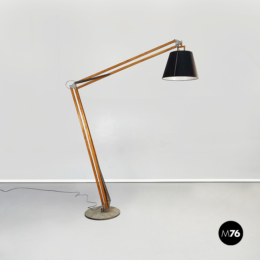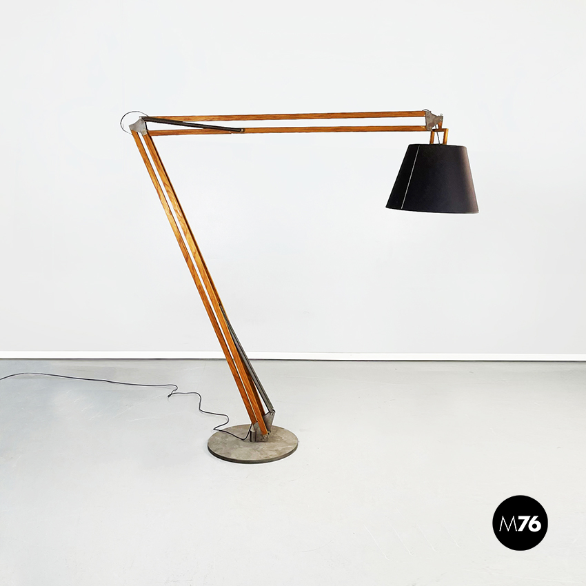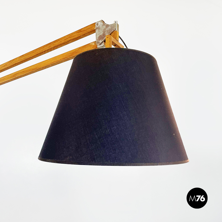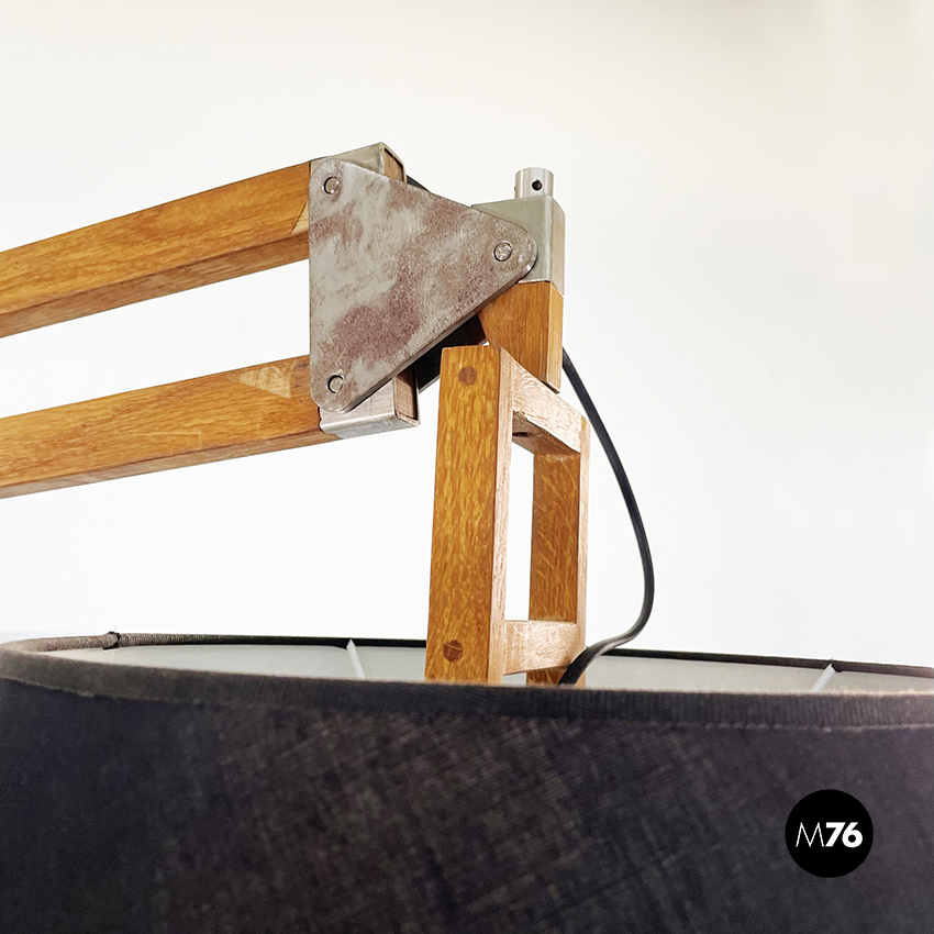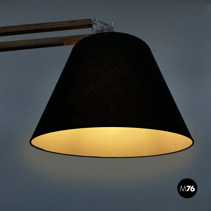 Lampada da terra modello Golia con base tonda in ferro e struttura in legno. La struttura è composta da due bracci con sistema a pantografo che permette di mantenere le posizioni desiderate. Il paralume è in tessuto nero. Interruttore presente sul braccio collegato alla base. Può ruotare di 360°.