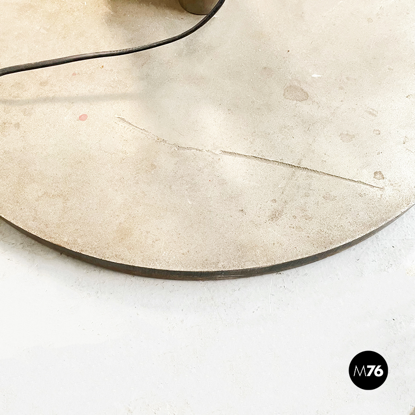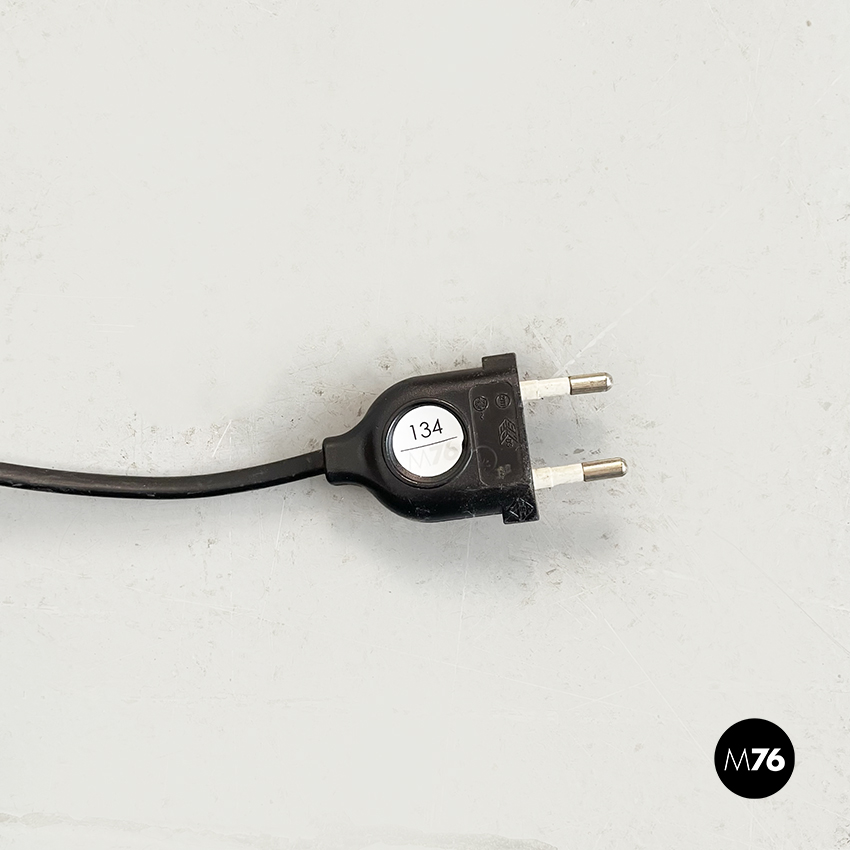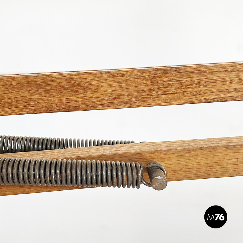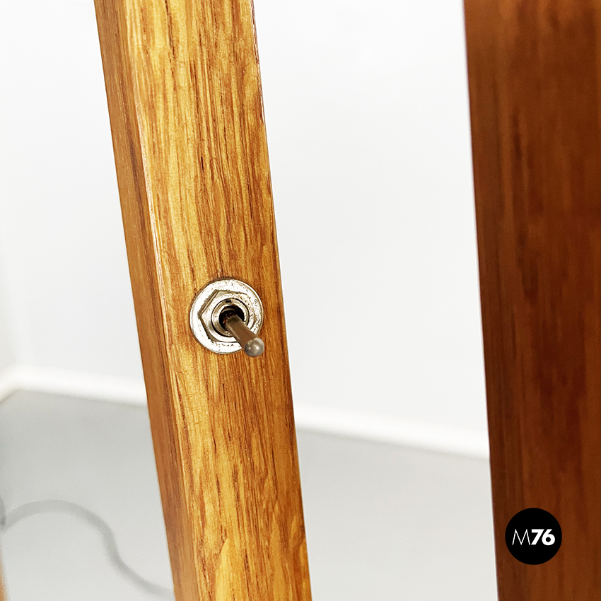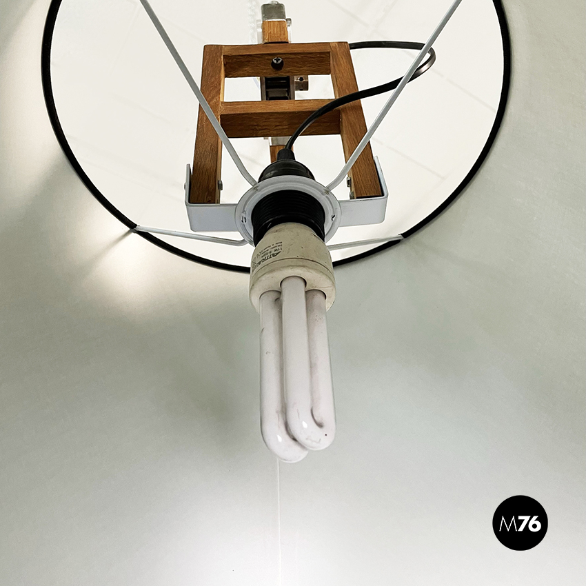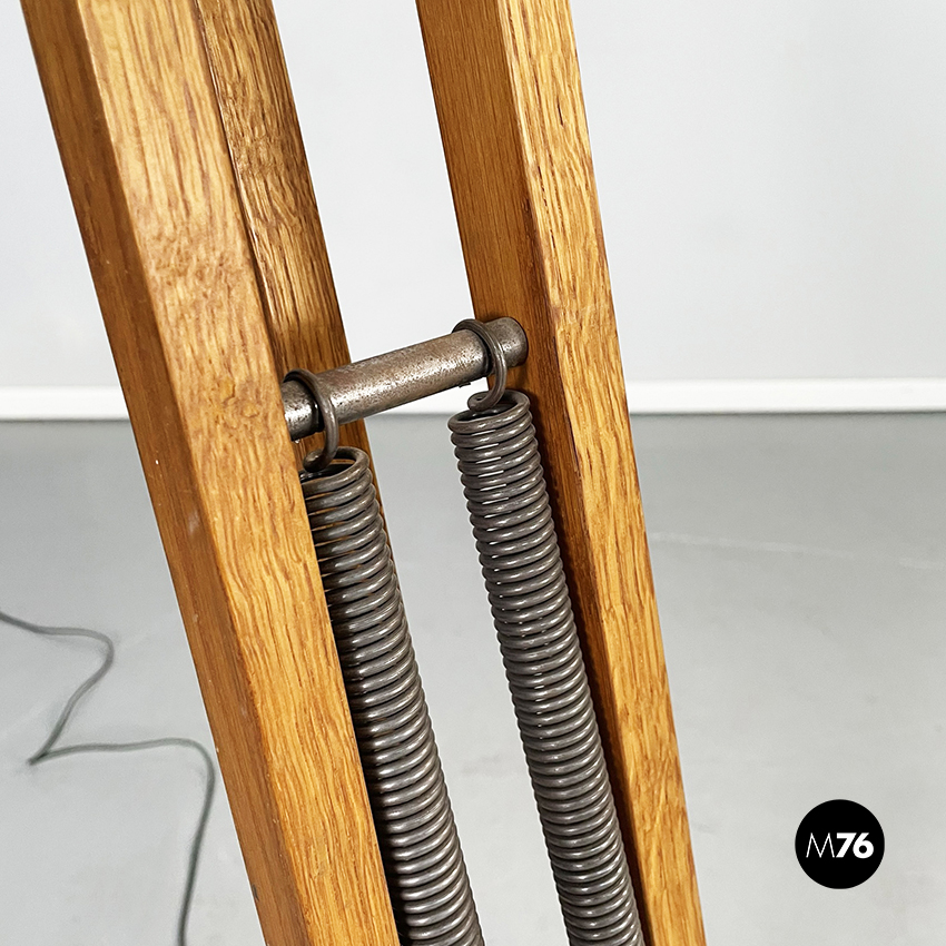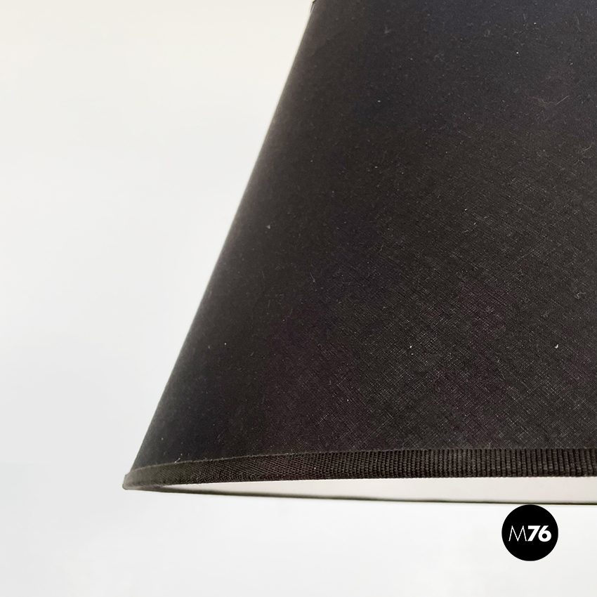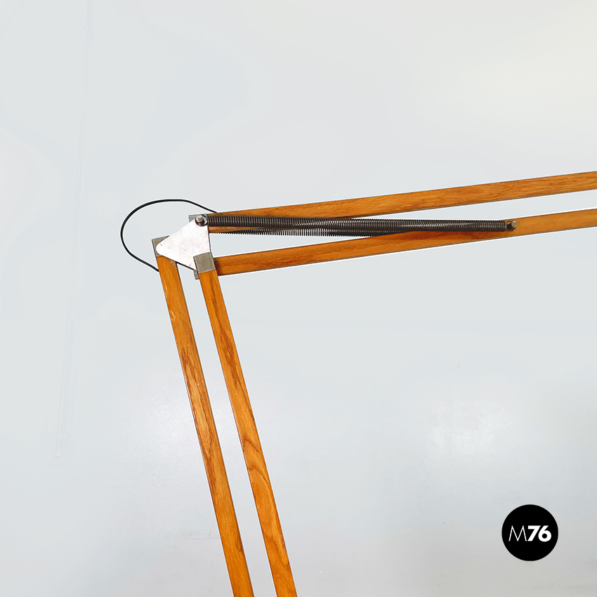 Lampada da terra modello Golia con base tonda in ferro e struttura in legno. La struttura è composta da due bracci con sistema a pantografo che permette di mantenere le posizioni desiderate. Il paralume è in tessuto nero. Interruttore presente sul braccio collegato alla base. Può ruotare di 360°.