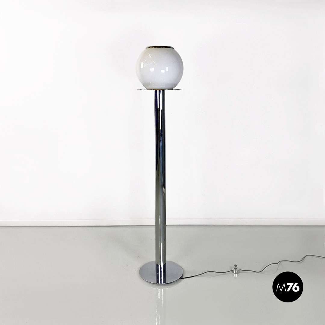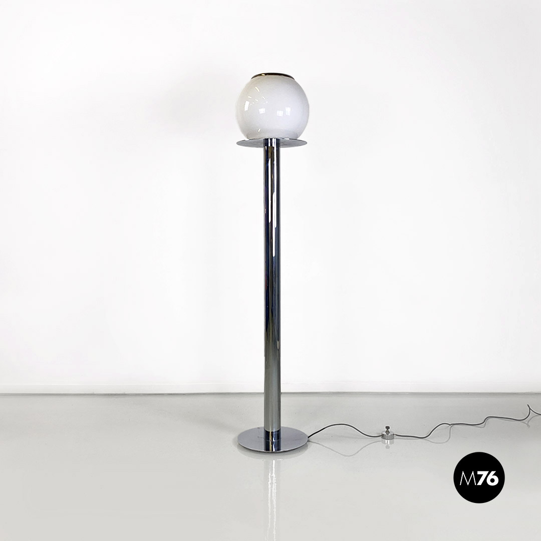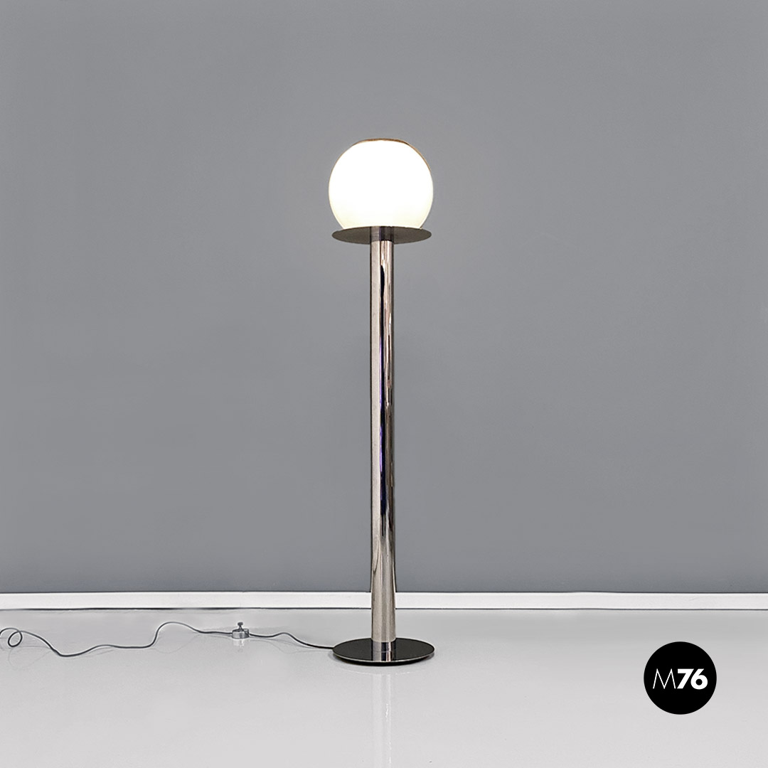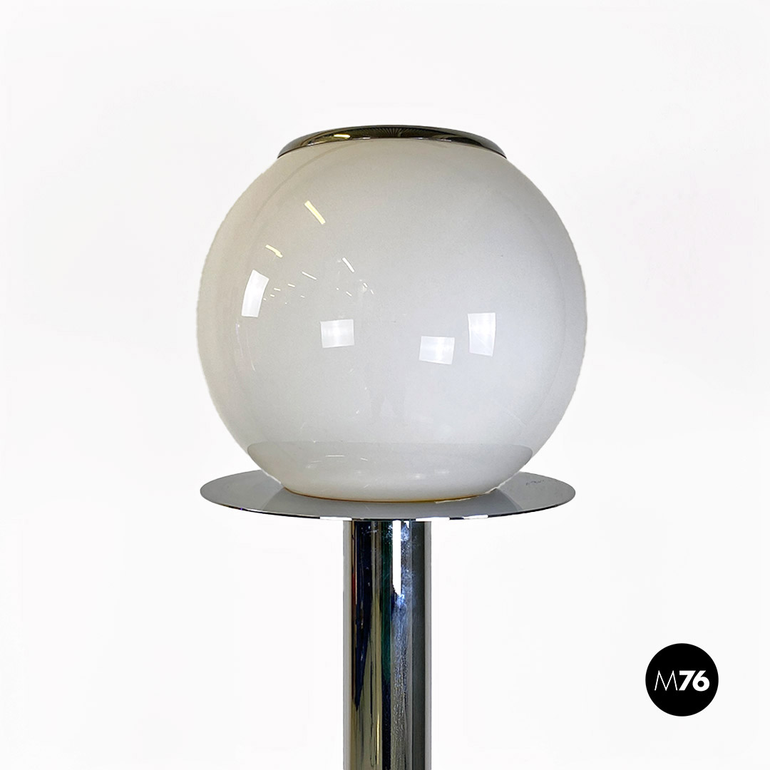 Lampada da terra con struttura in acciaio cromato con base piatta di forma tonda speculare nella parte alta su cui è fissato un diffusore sferico in vetro opaline con apertura per l’inserimento della lampadina. Il bordo della sfera è rifinito con un anello in acciaio.