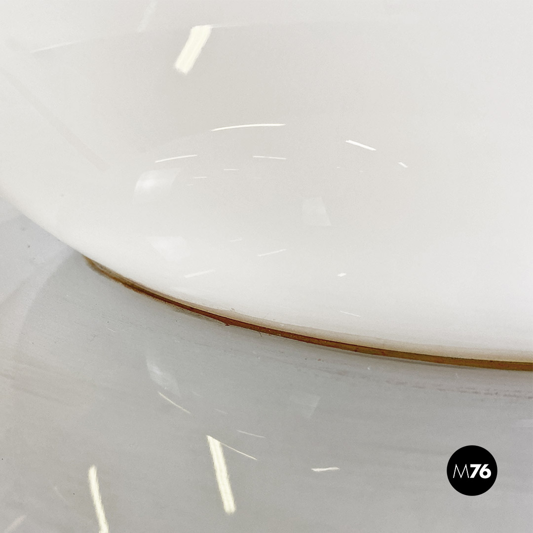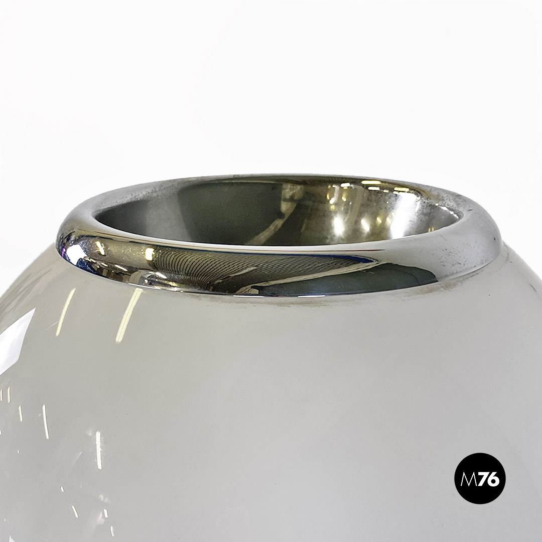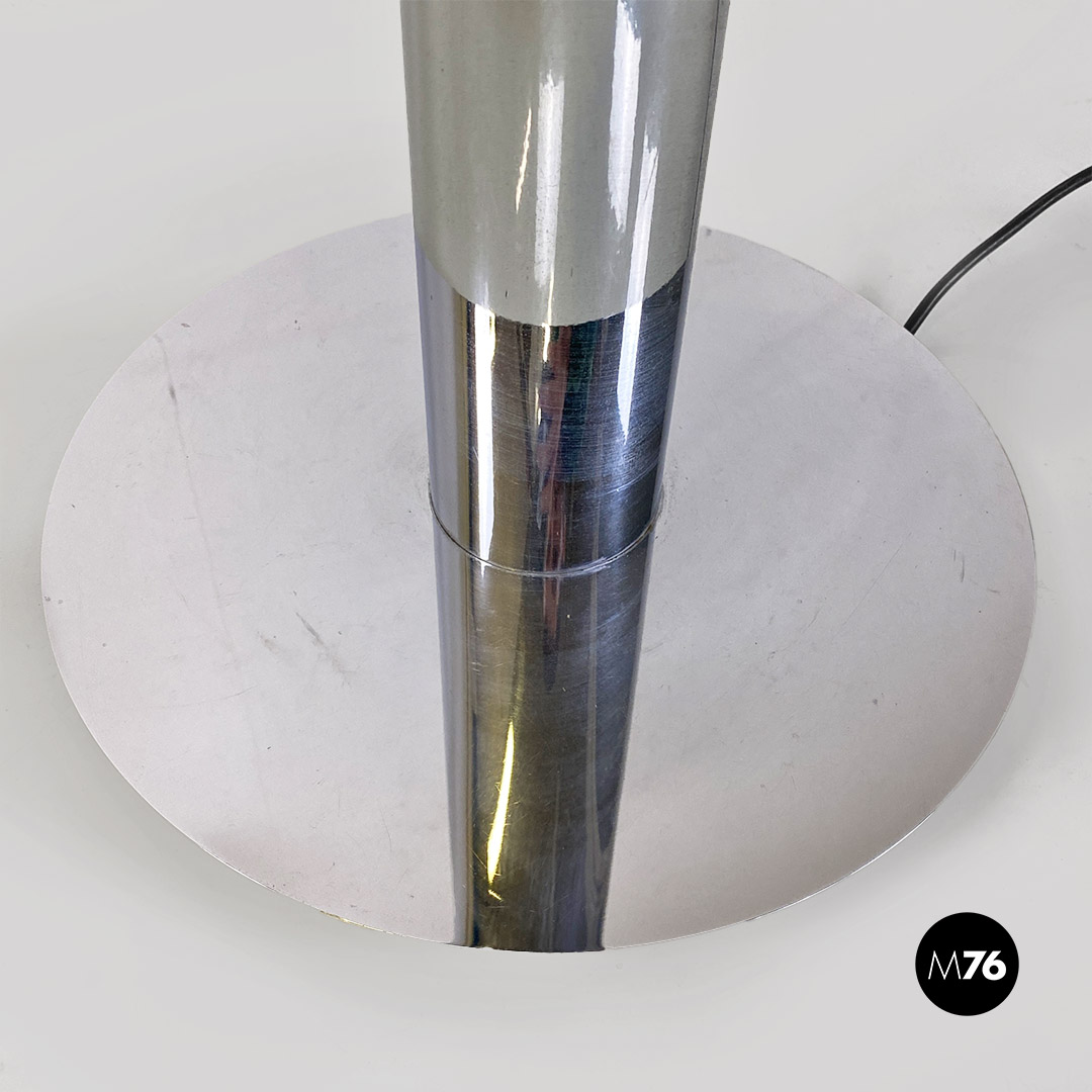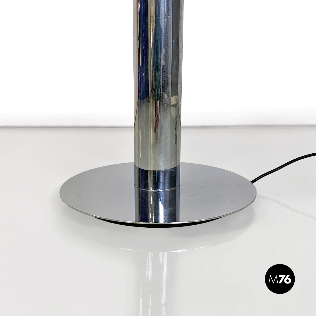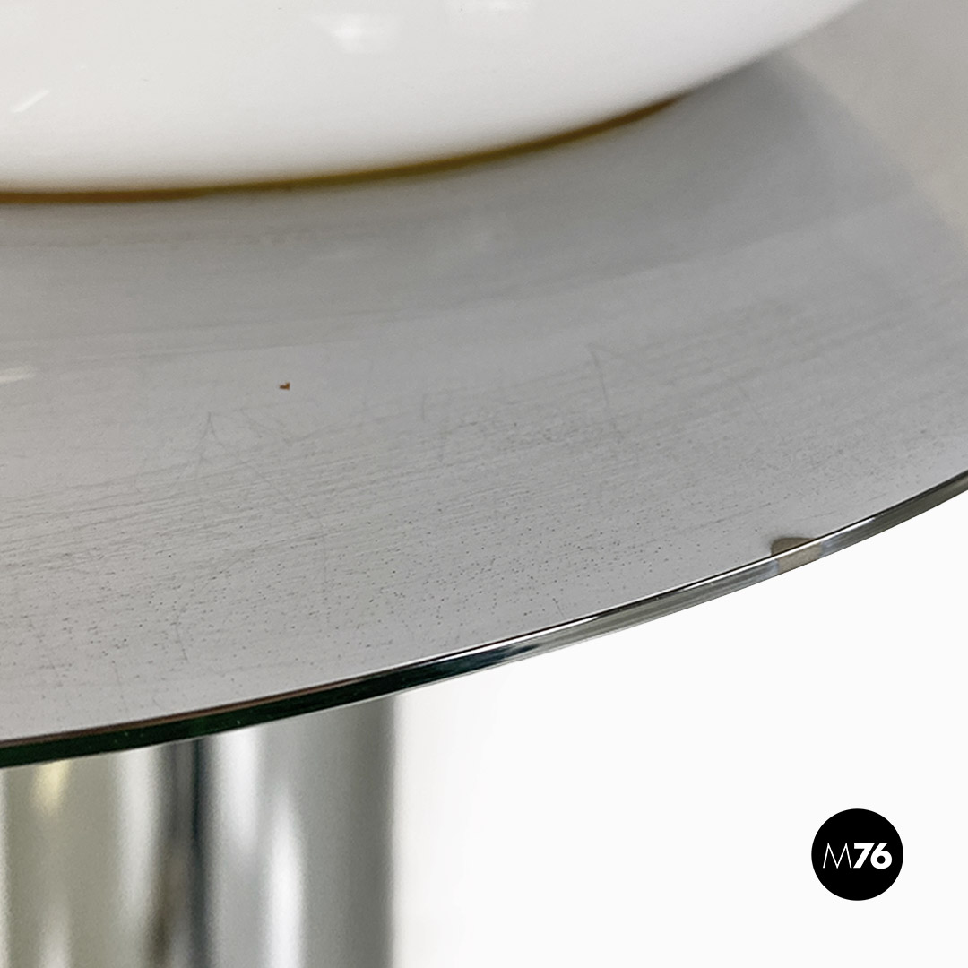 Lampada da terra con struttura in acciaio cromato con base piatta di forma tonda speculare nella parte alta su cui è fissato un diffusore sferico in vetro opaline con apertura per l’inserimento della lampadina. Il bordo della sfera è rifinito con un anello in acciaio.