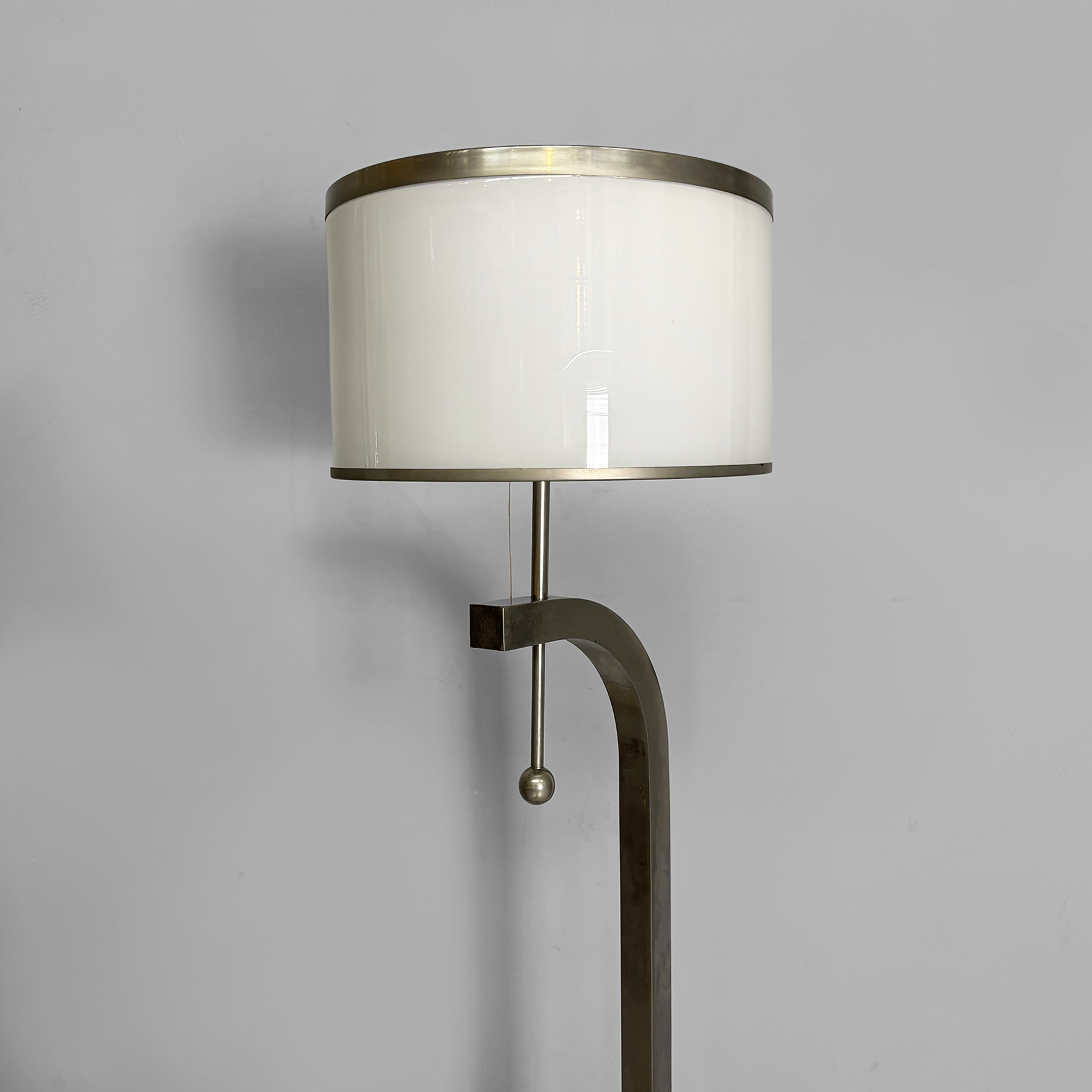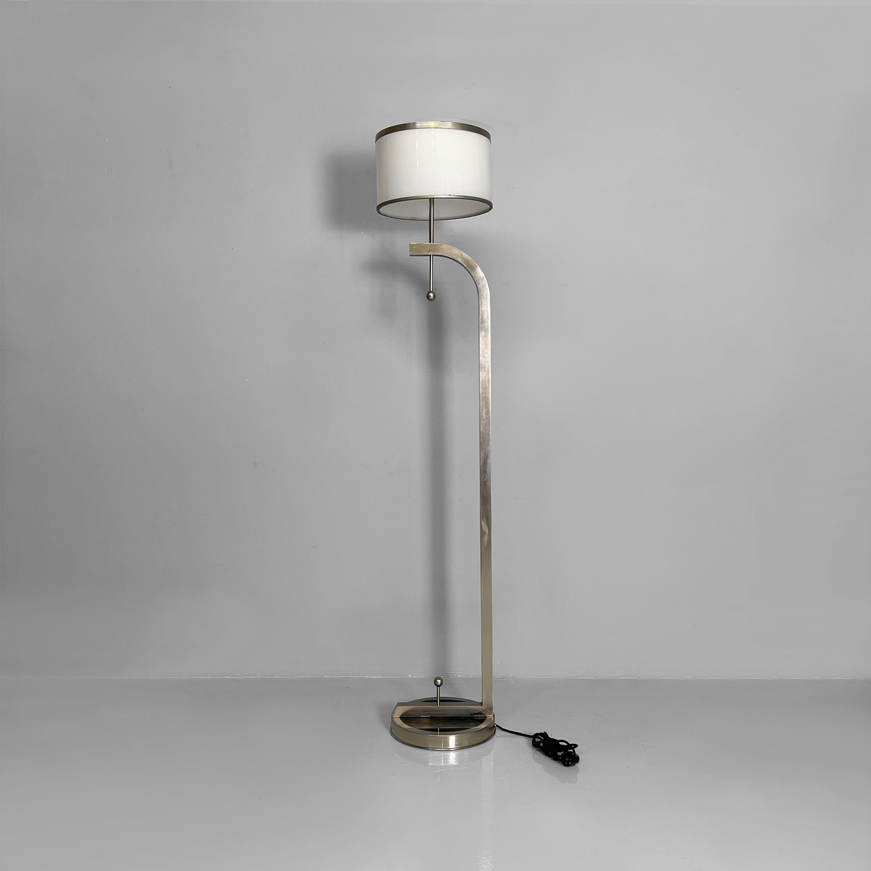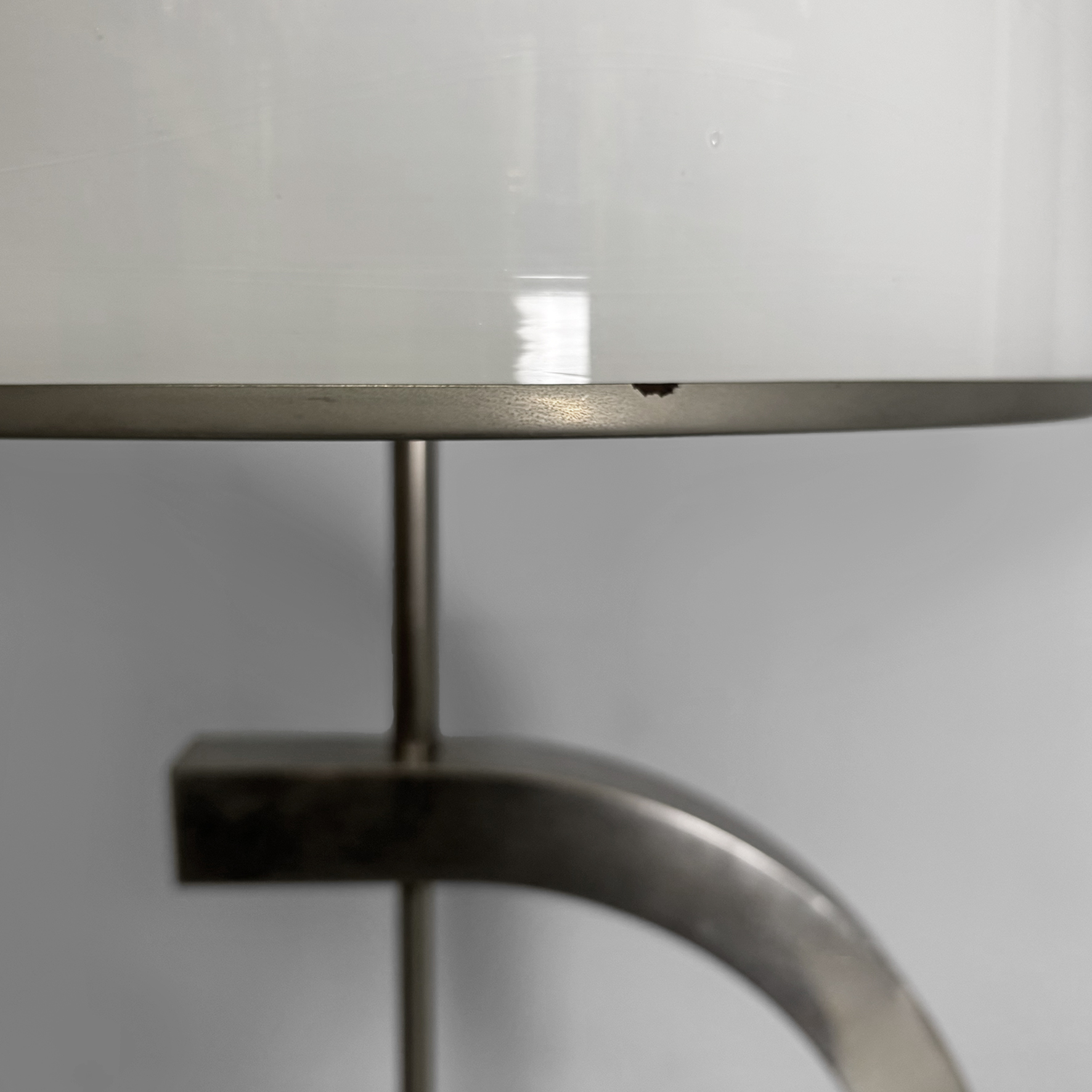 Lampada da terra con paralume a base tonda in vetro bianco con due fonti luminose, attacco E27. La struttura curva in acciaio della lampada poggia su una base in cui è integrato un disco di vetro nero. Interruttore a corda. Art Deco.