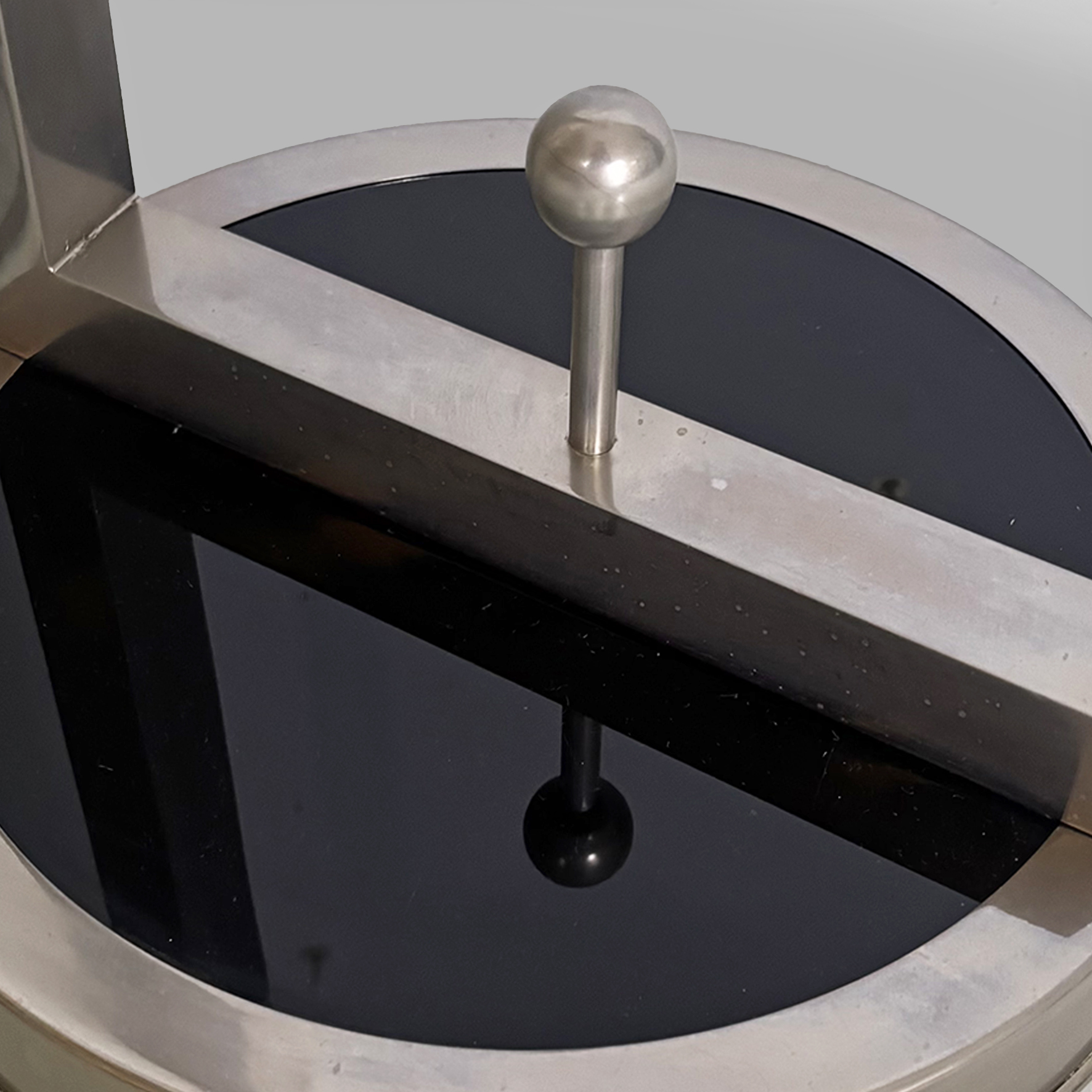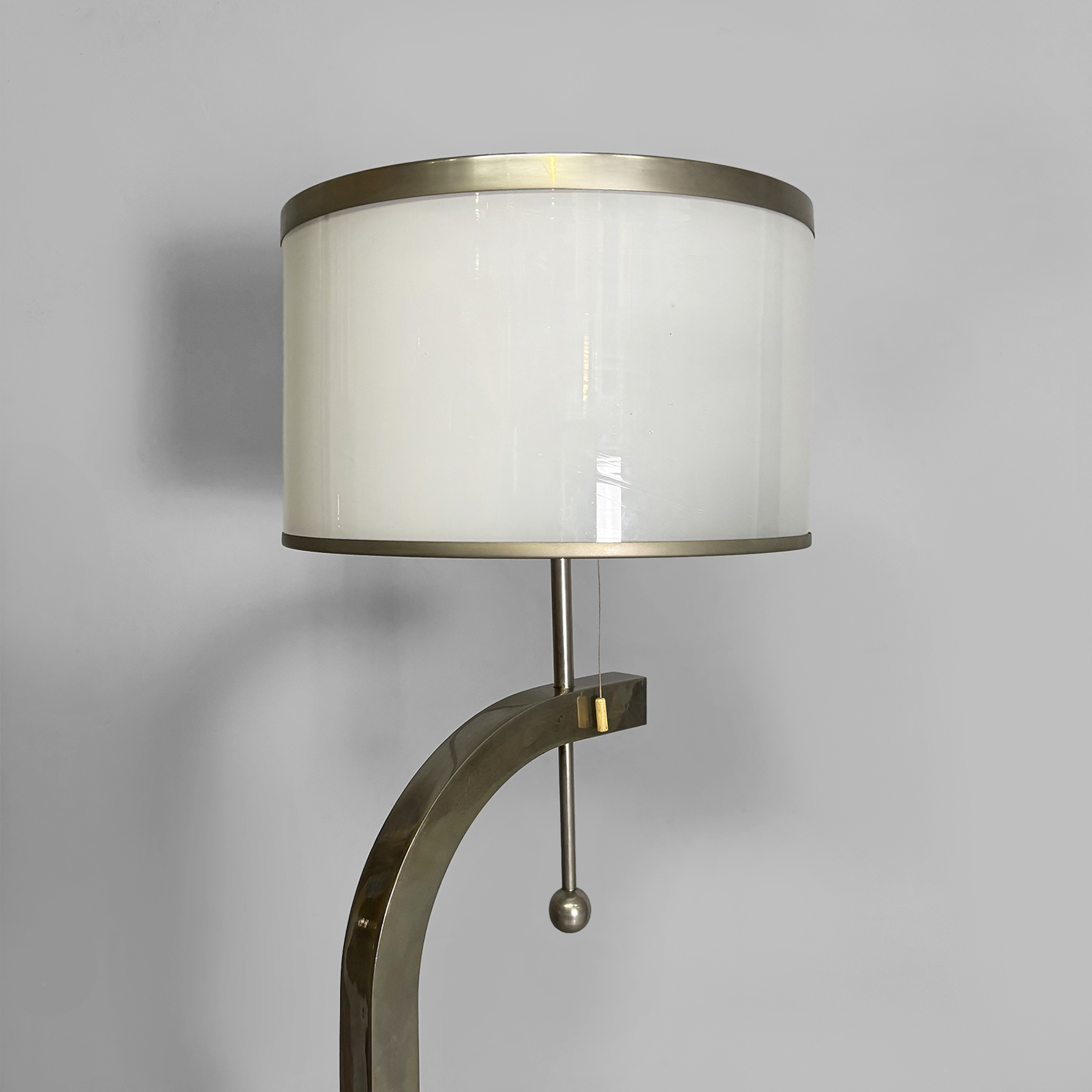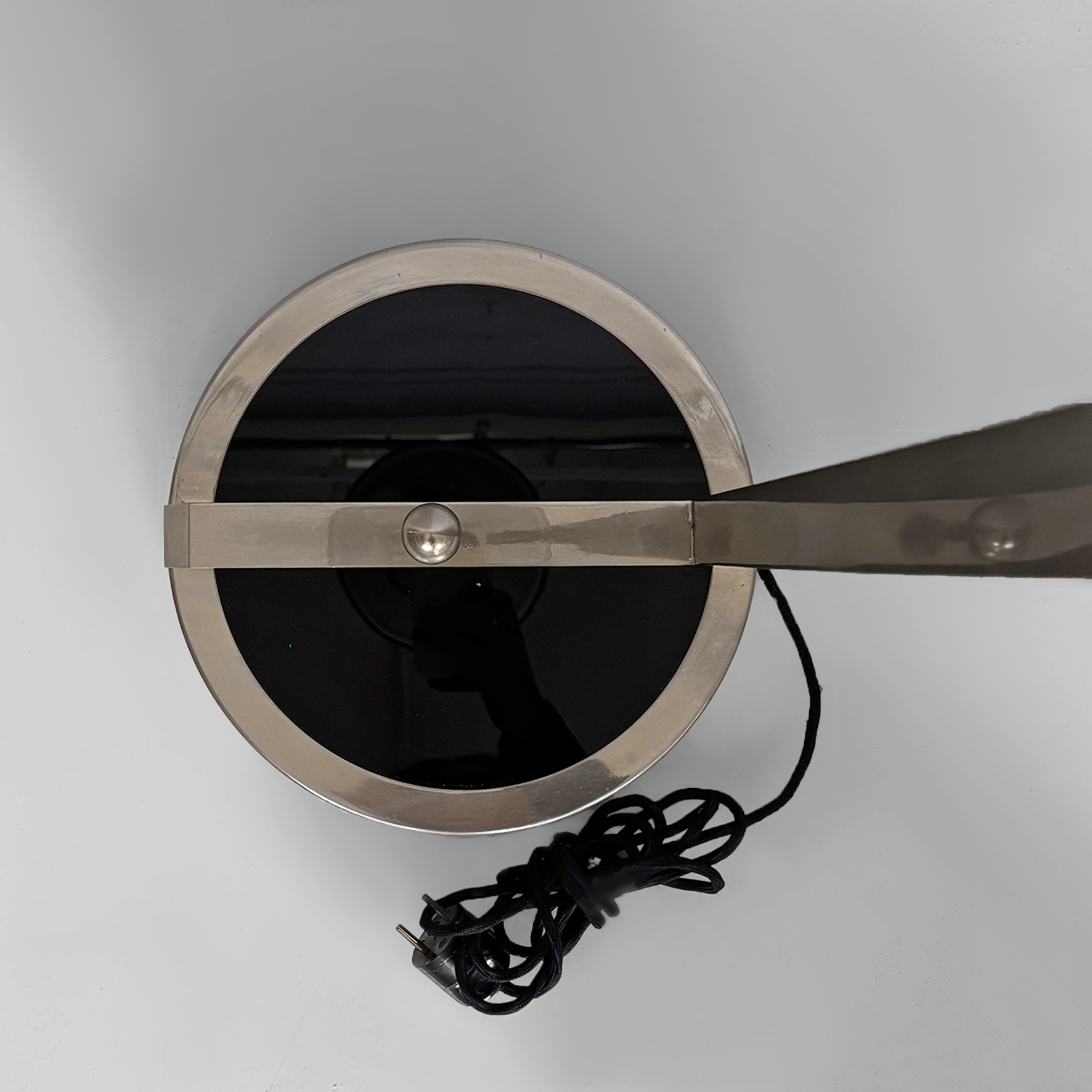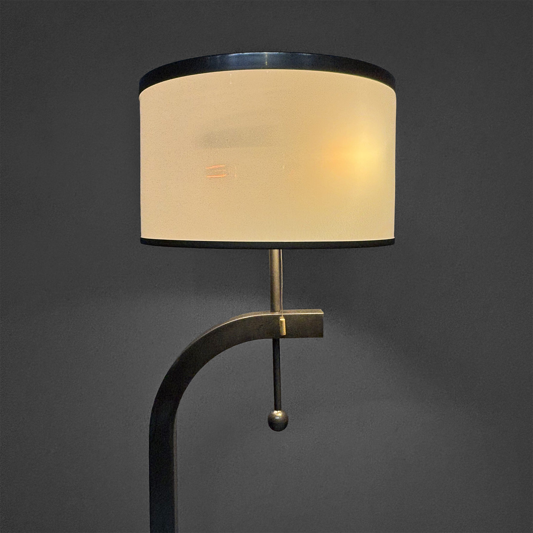 Lampada da terra con paralume a base tonda in vetro bianco con due fonti luminose, attacco E27. La struttura curva in acciaio della lampada poggia su una base in cui è integrato un disco di vetro nero. Interruttore a corda. Art Deco.