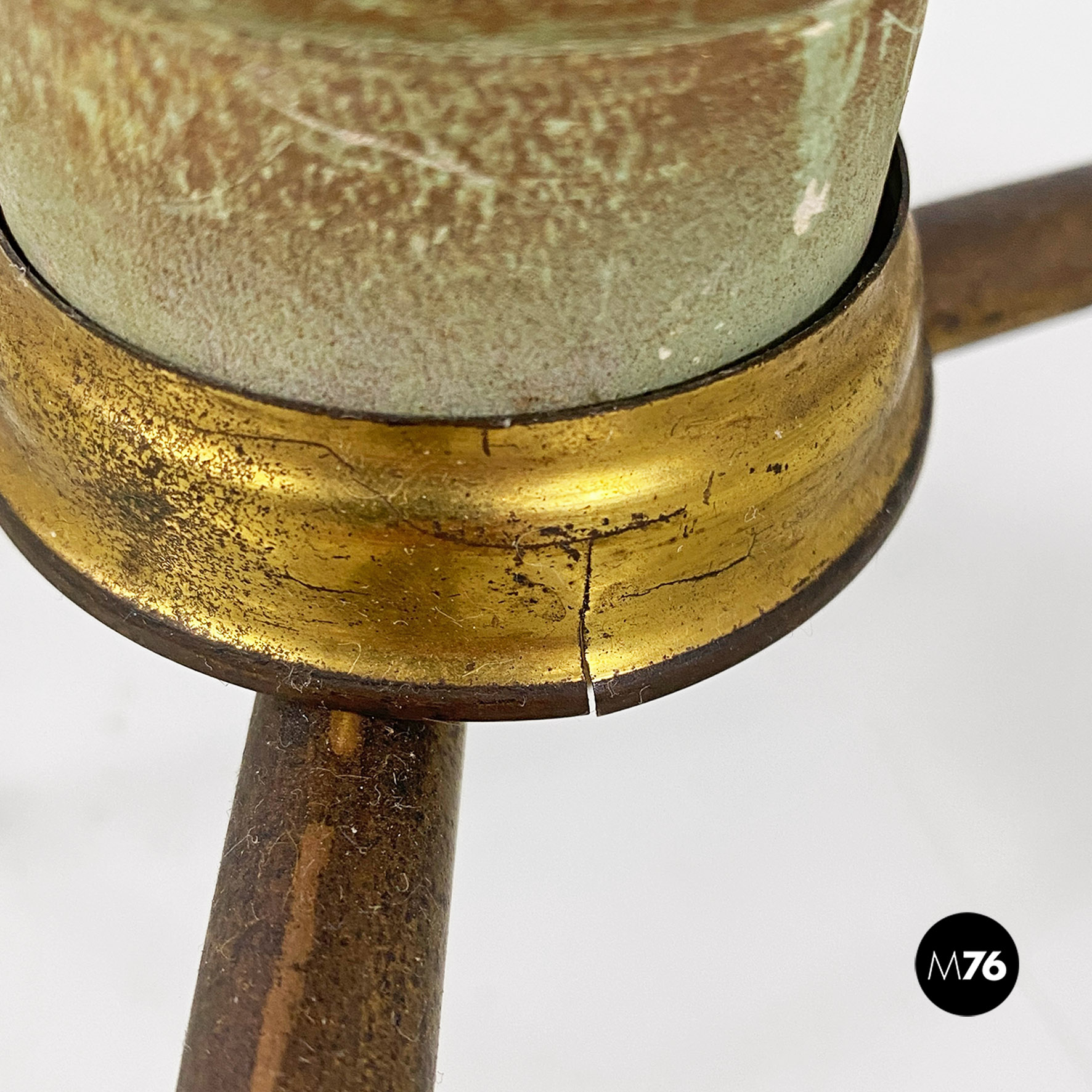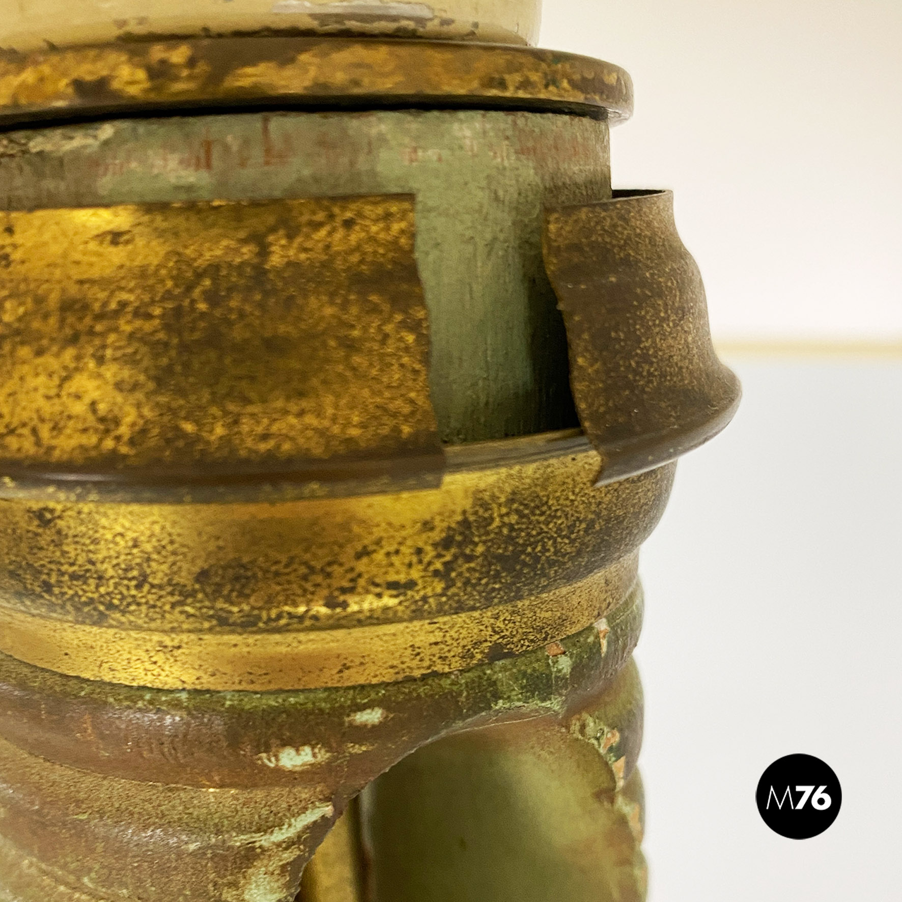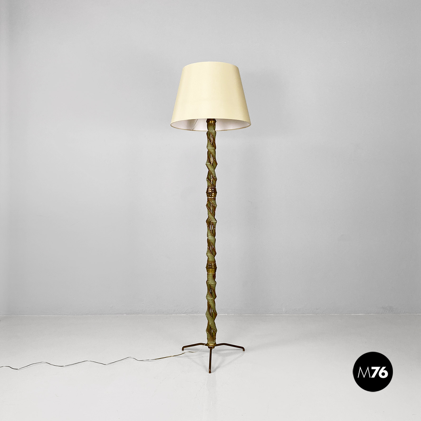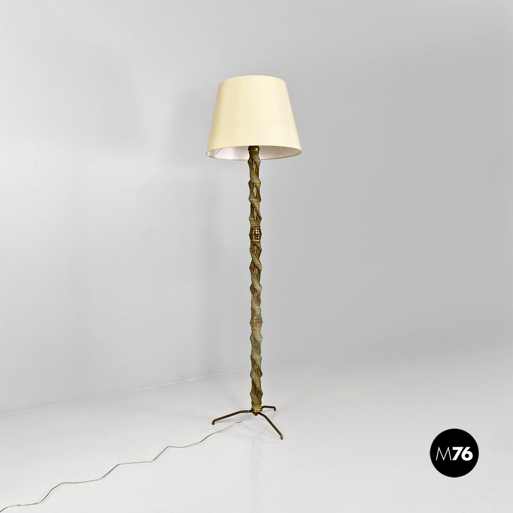 Lampada da terra con struttura portante in tondino di ottone composta da uno stelo centrale tre punti luce e tre razze. Intorno allo stelo si trova una struttura decorativa che si “attorciglia” su tutta la lunghezza dello stelo ed è in legno dipinto di verde e marrone con fasce in ottone.