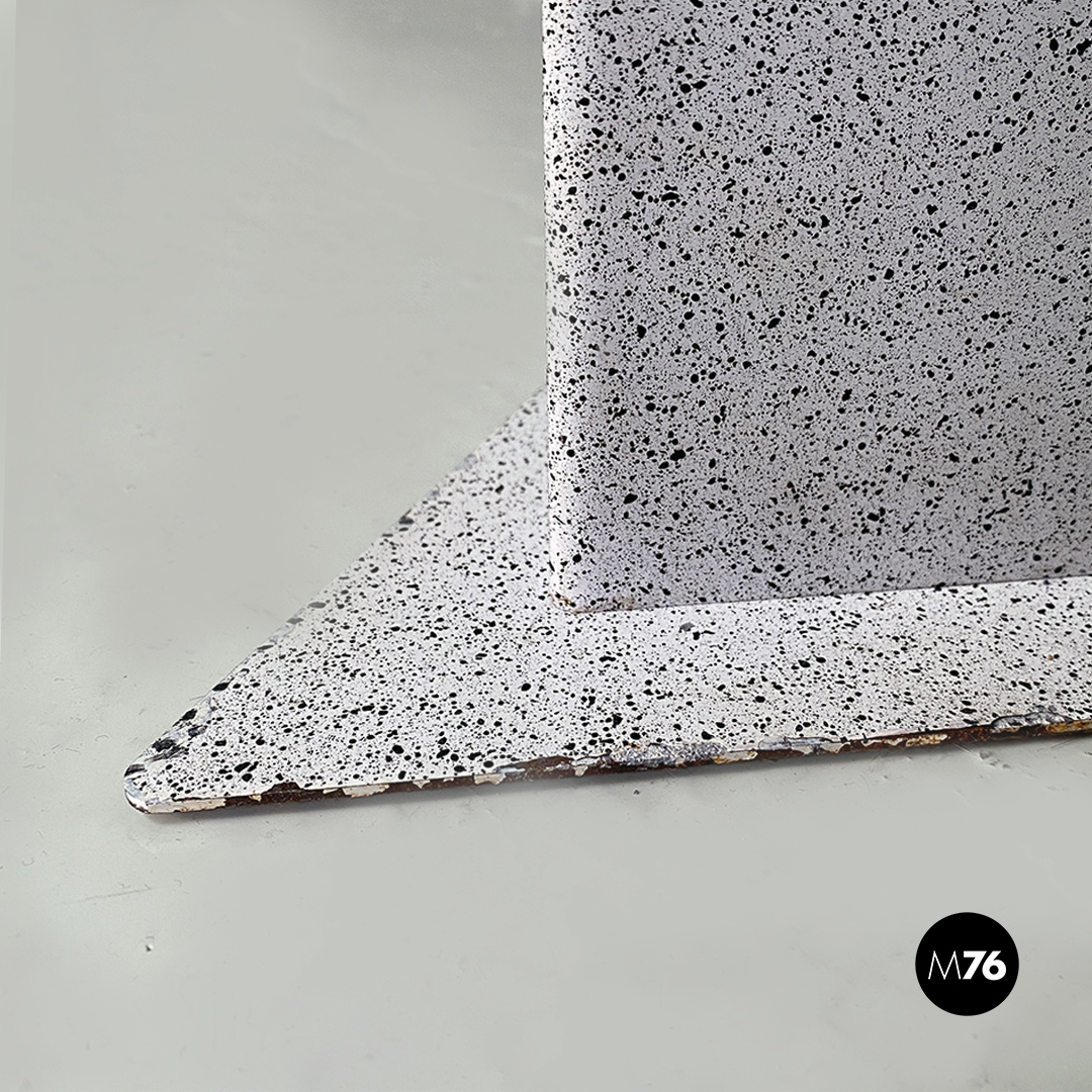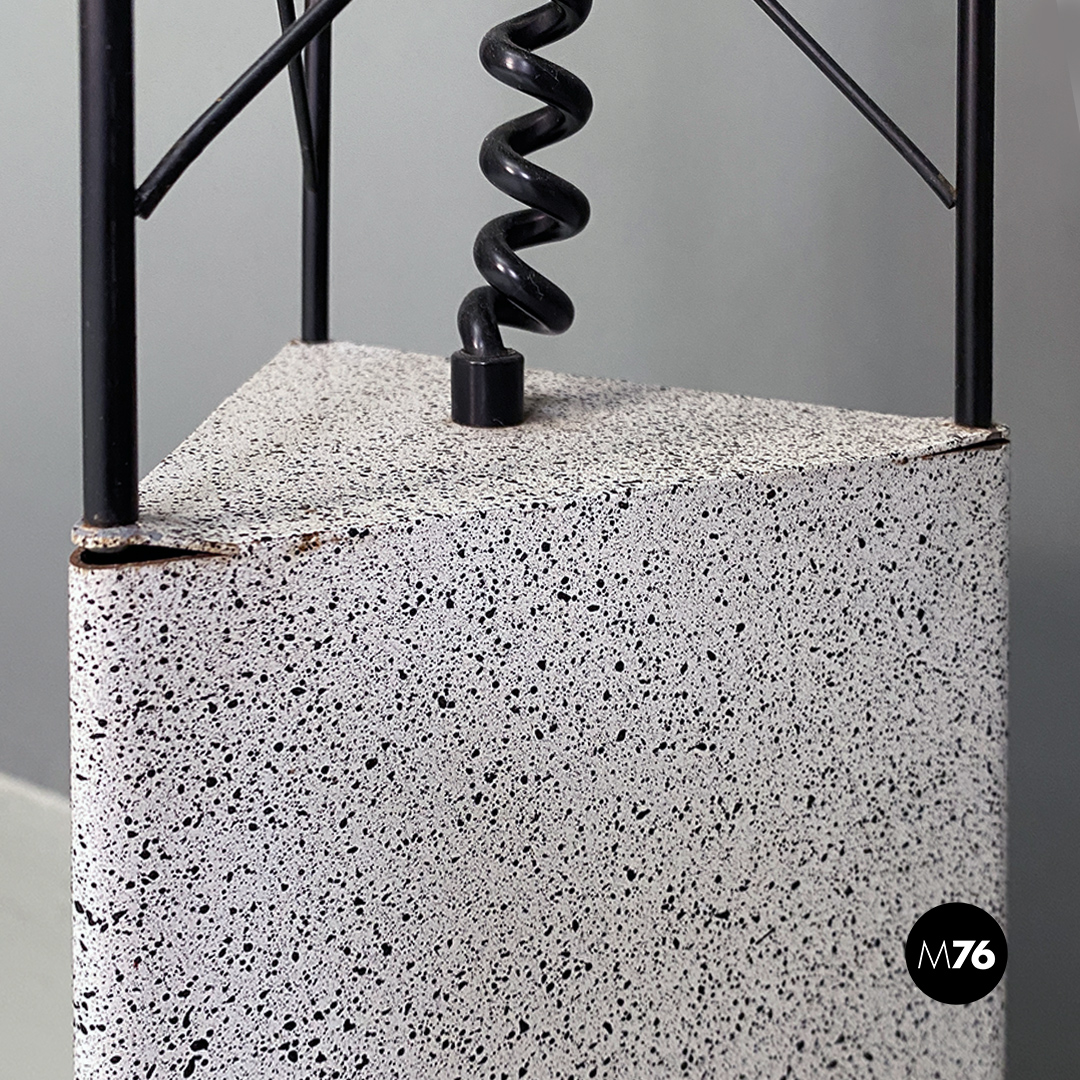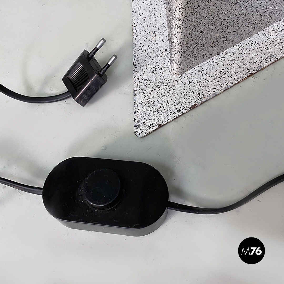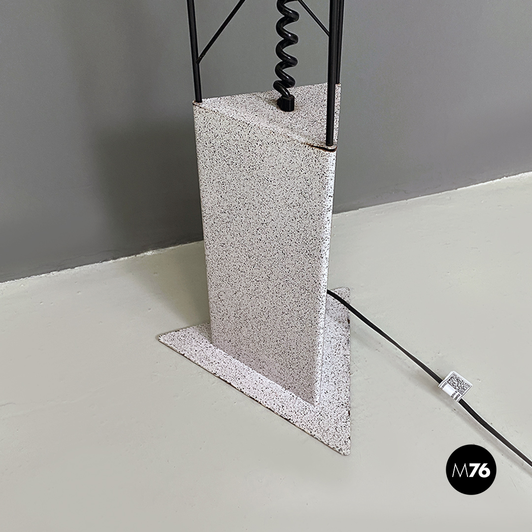Lampada da terra con base a sezione triangolare in lamiera verniciata effetto pietra parte superiore in tondino metallico nero e impianto elettrico con cavo a molla.