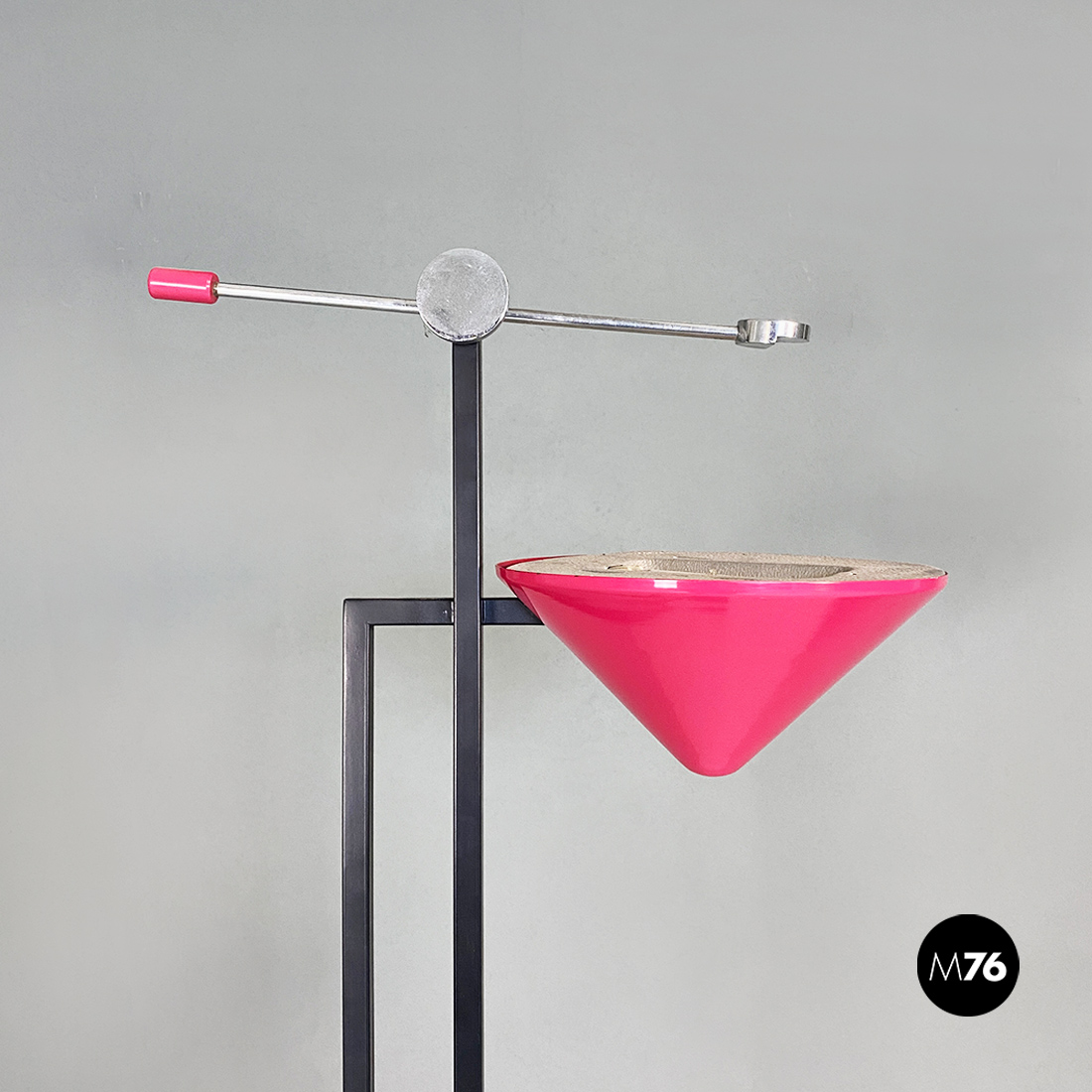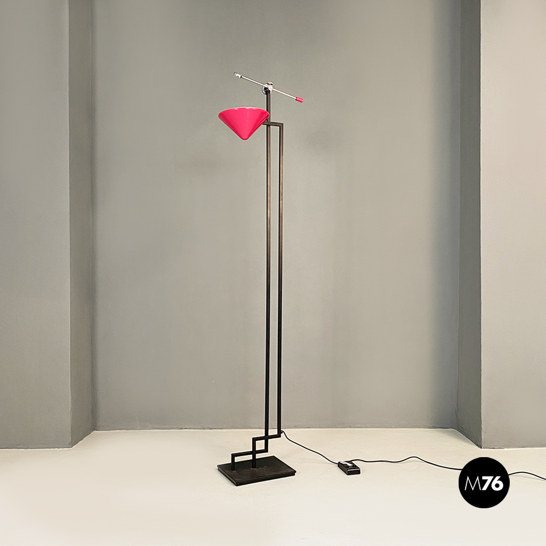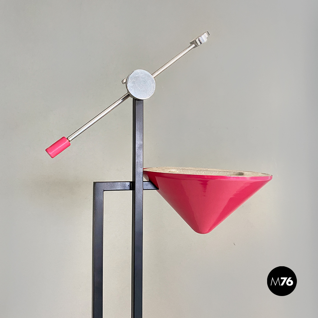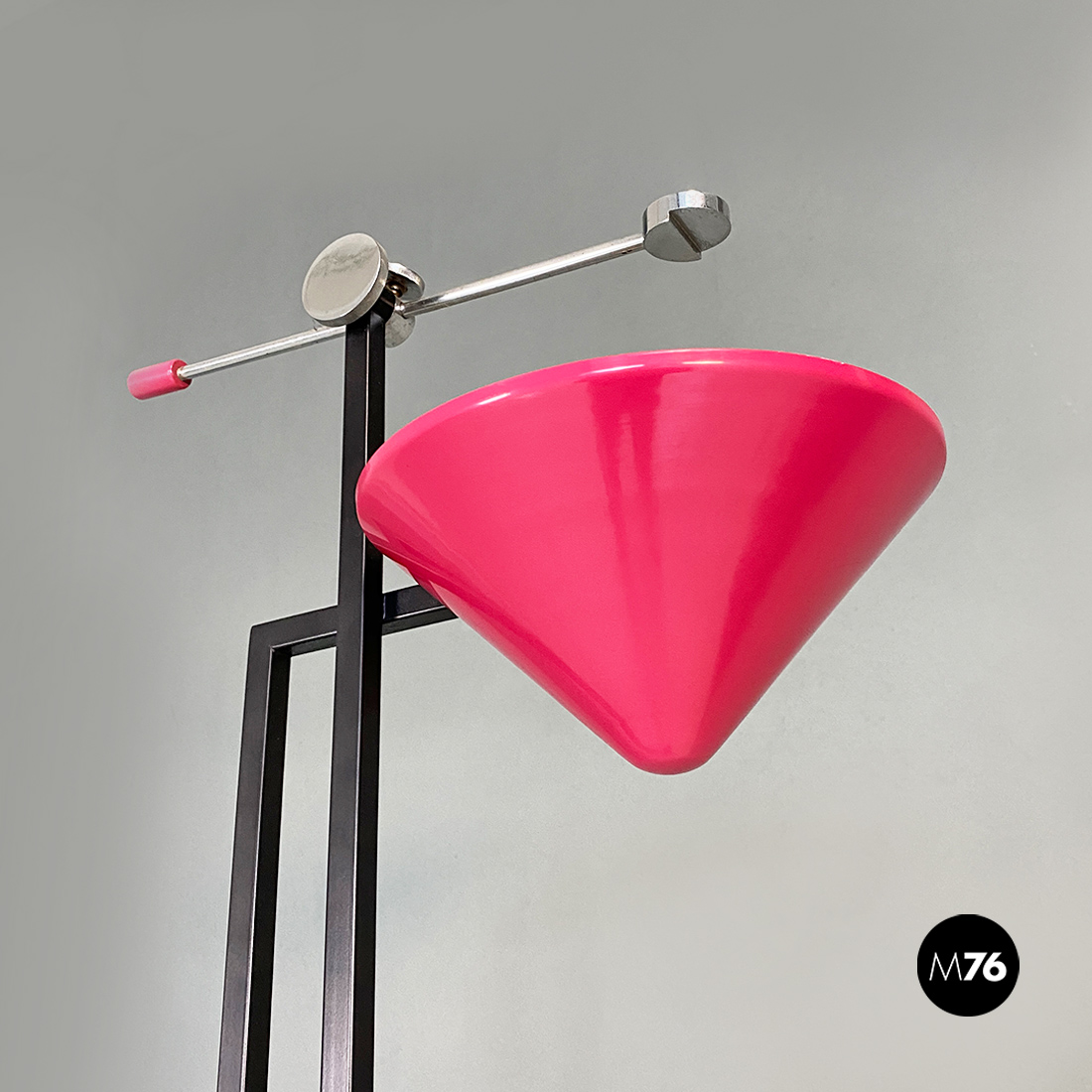 Lampada da terra con base rettangolare in metallo nero stelo doppio a sezione quadrata sempre in metallo nero e diffusore di forma conica rovesciato in metallo color magenta. Sul paralume è posta una asta con posizione regolabile in acciaio cromato con un piccolo tondino a fare da terminale.