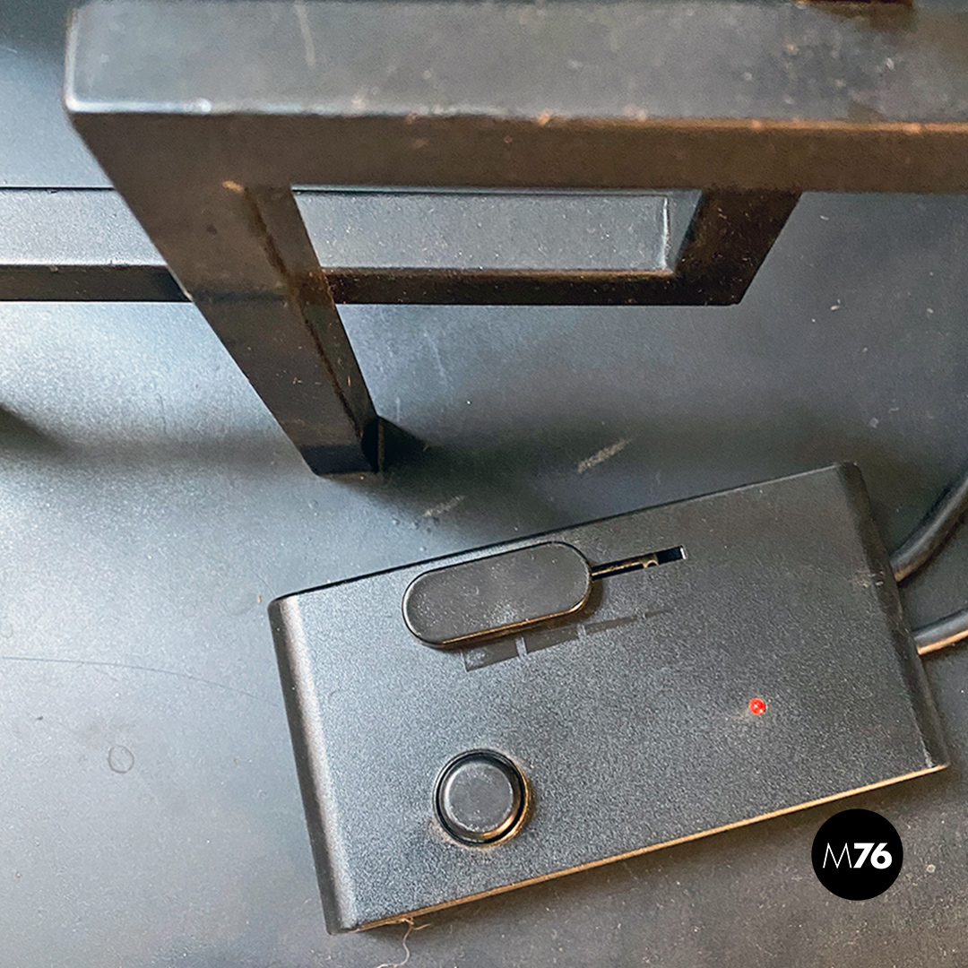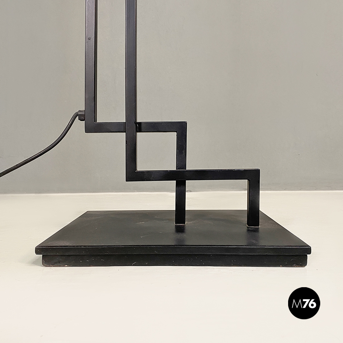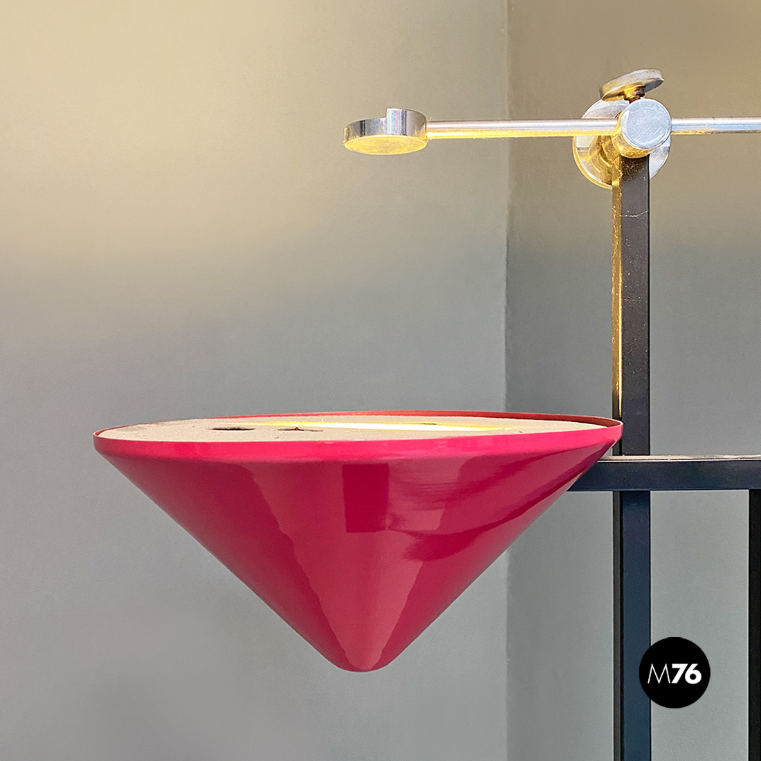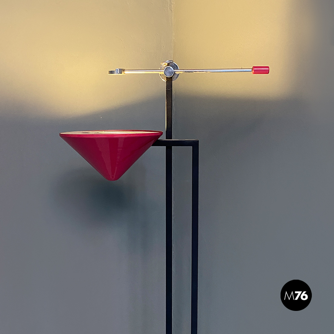 Lampada da terra con base rettangolare in metallo nero stelo doppio a sezione quadrata sempre in metallo nero e diffusore di forma conica rovesciato in metallo color magenta. Sul paralume è posta una asta con posizione regolabile in acciaio cromato con un piccolo tondino a fare da terminale.