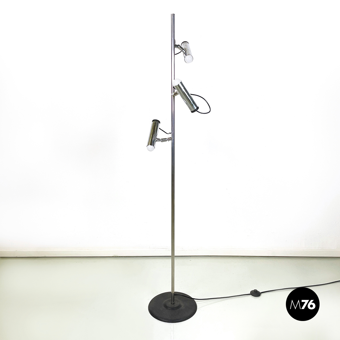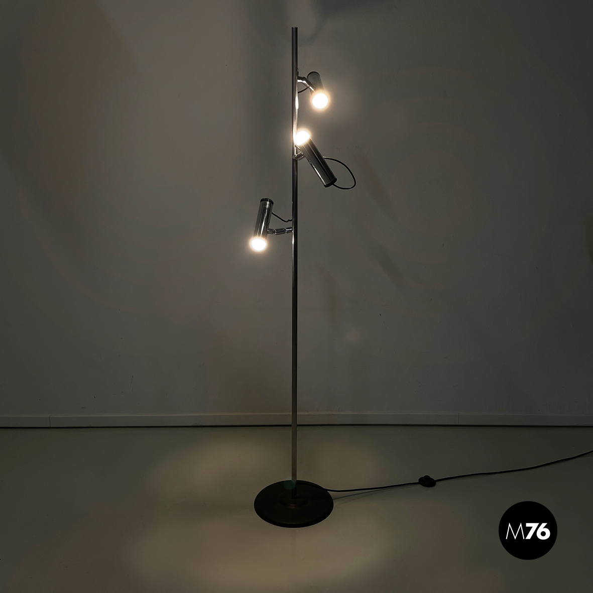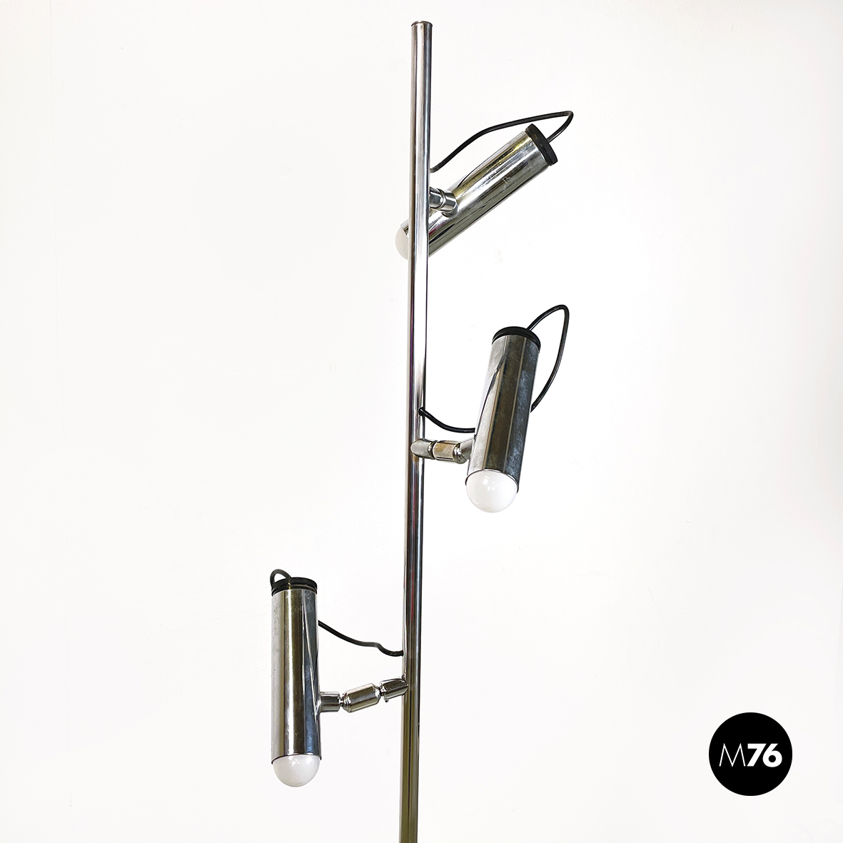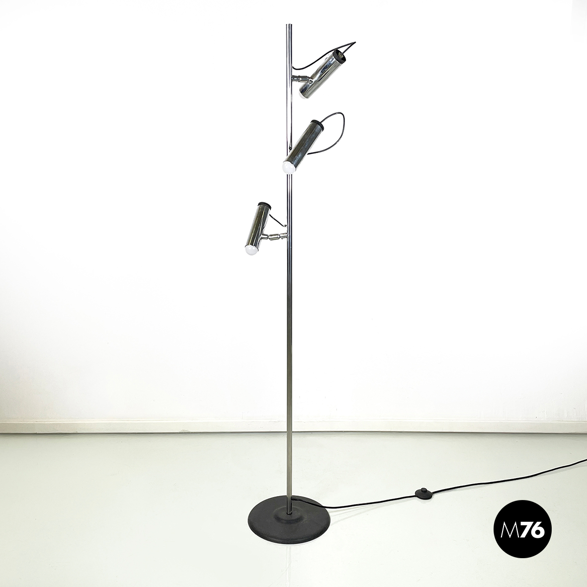 Lampada da terra a tre luci orientabili a base tonda in metallo verniciato nero. La struttura centrale è composta da un tondino verticale di metallo cromato. I diffusori cilindrici anche essi in metallo cromato sono collegati alla struttura grazie a dei bracci orientabili.
