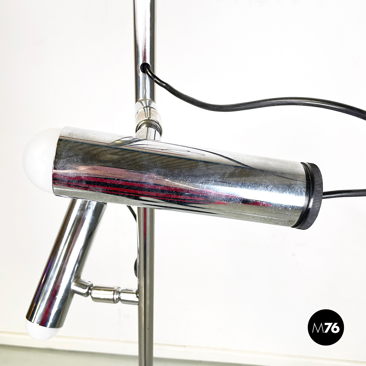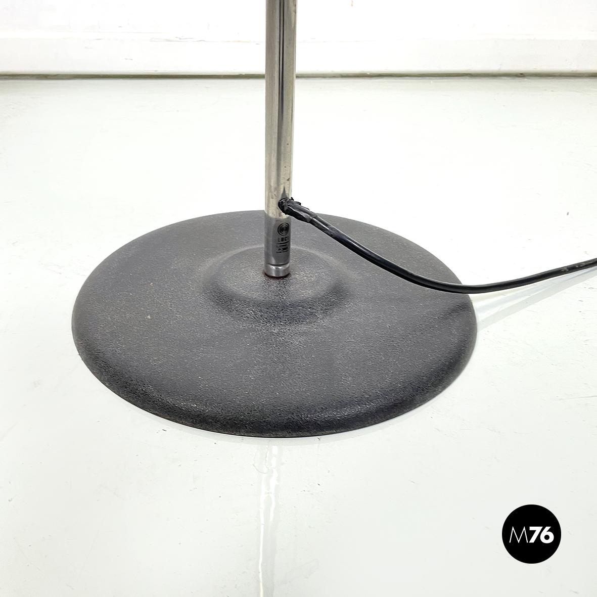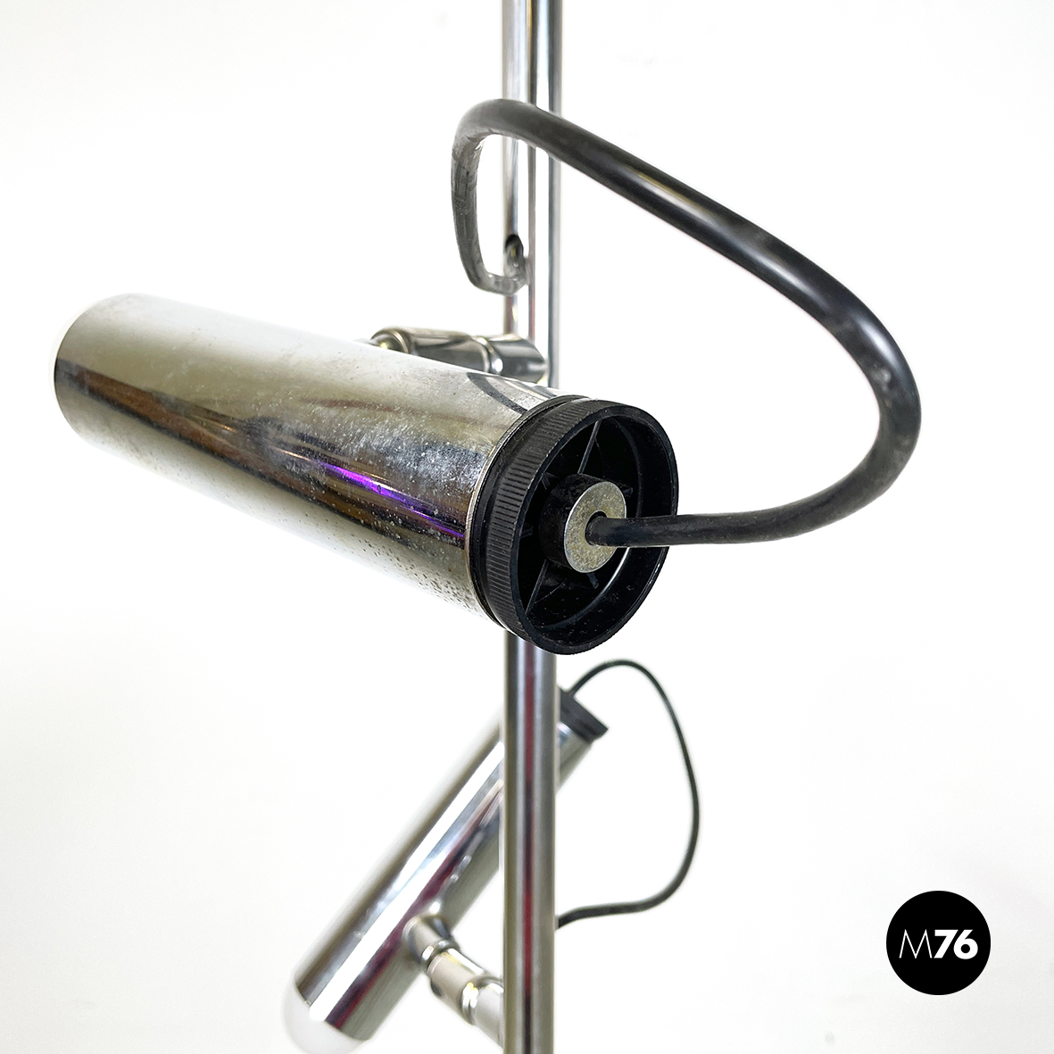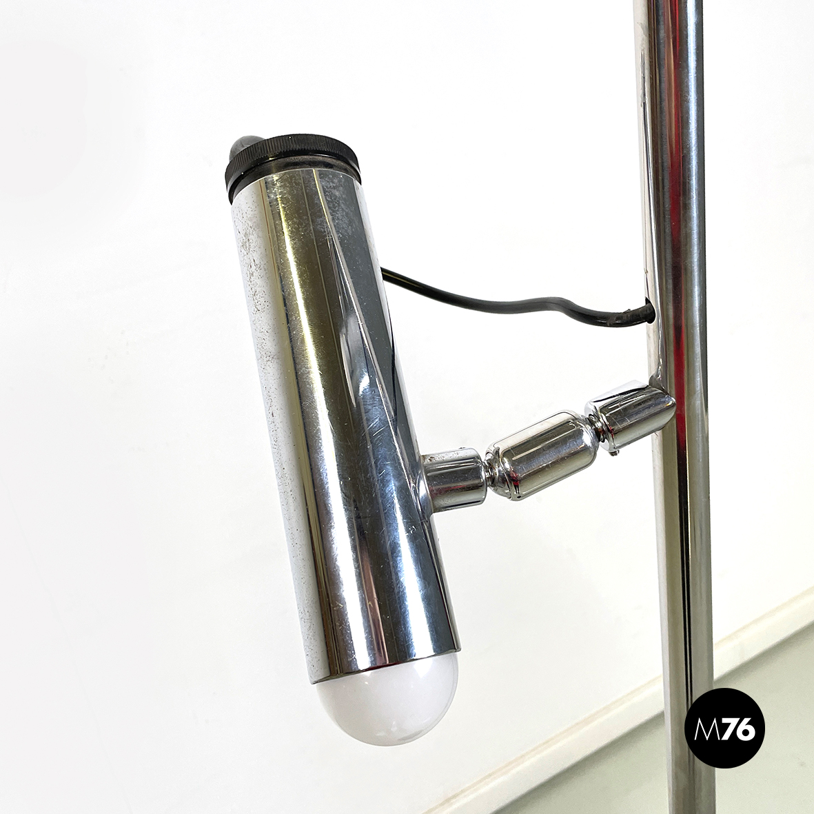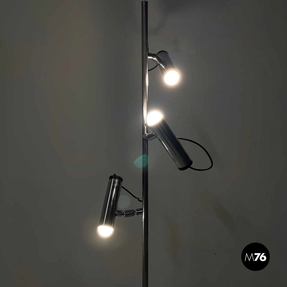 Lampada da terra a tre luci orientabili a base tonda in metallo verniciato nero. La struttura centrale è composta da un tondino verticale di metallo cromato. I diffusori cilindrici anche essi in metallo cromato sono collegati alla struttura grazie a dei bracci orientabili.
