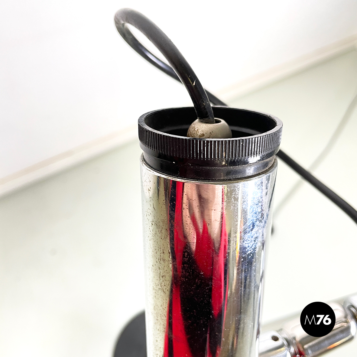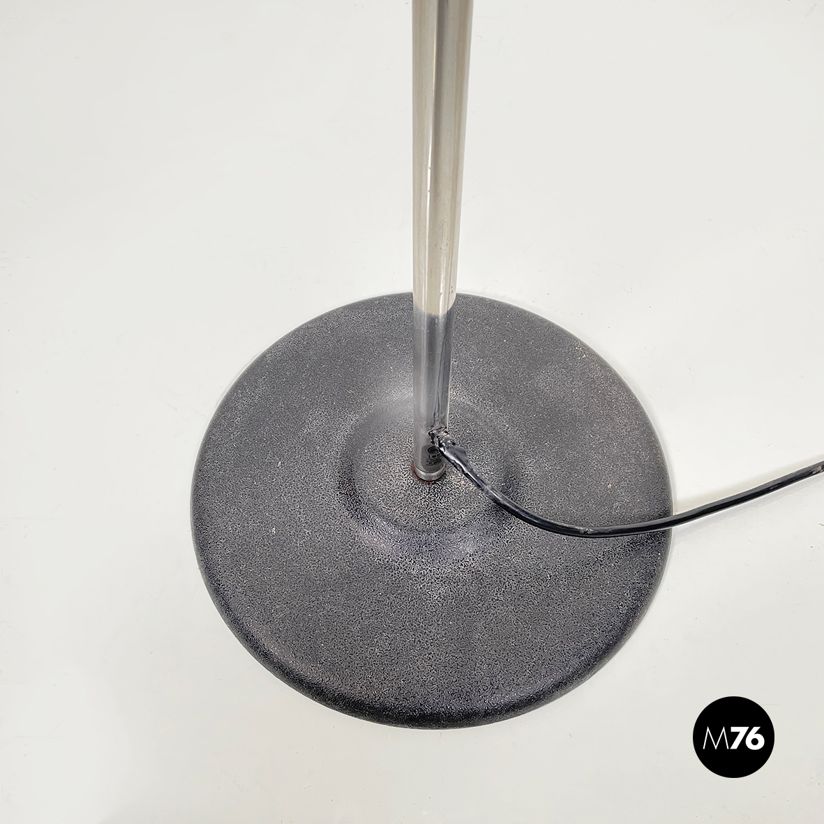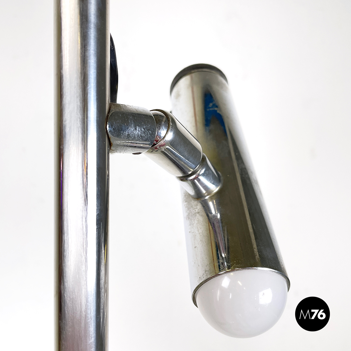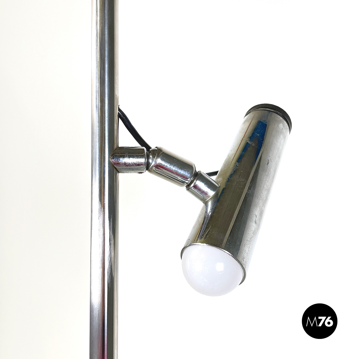 Lampada da terra a tre luci orientabili a base tonda in metallo verniciato nero. La struttura centrale è composta da un tondino verticale di metallo cromato. I diffusori cilindrici anche essi in metallo cromato sono collegati alla struttura grazie a dei bracci orientabili.