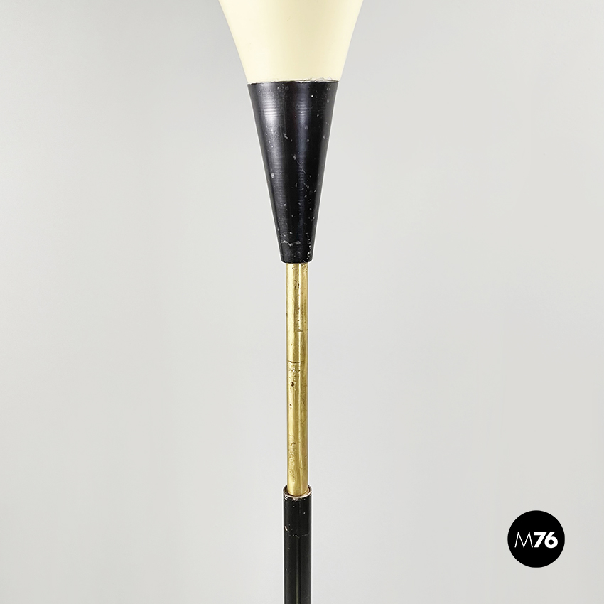 Lampada da terra con diffusore dalla forma conica in metallo bianco-beige. Nella parte superiore è presente una sfera in ottone decorativa. La struttura centrale è in tubolare di metallo verniciato nero con inserti in ottone. La base è tonda in ottone.
