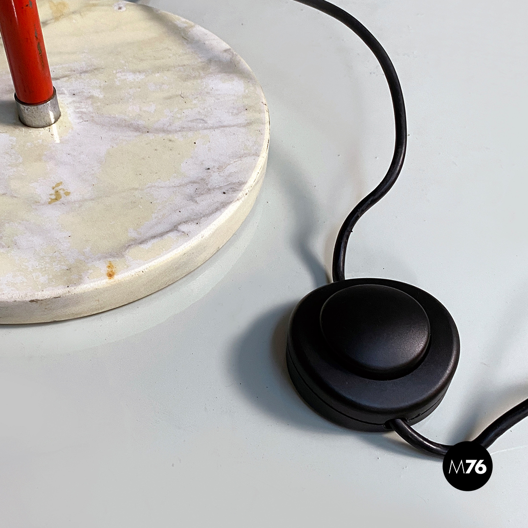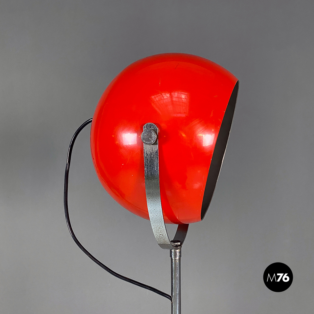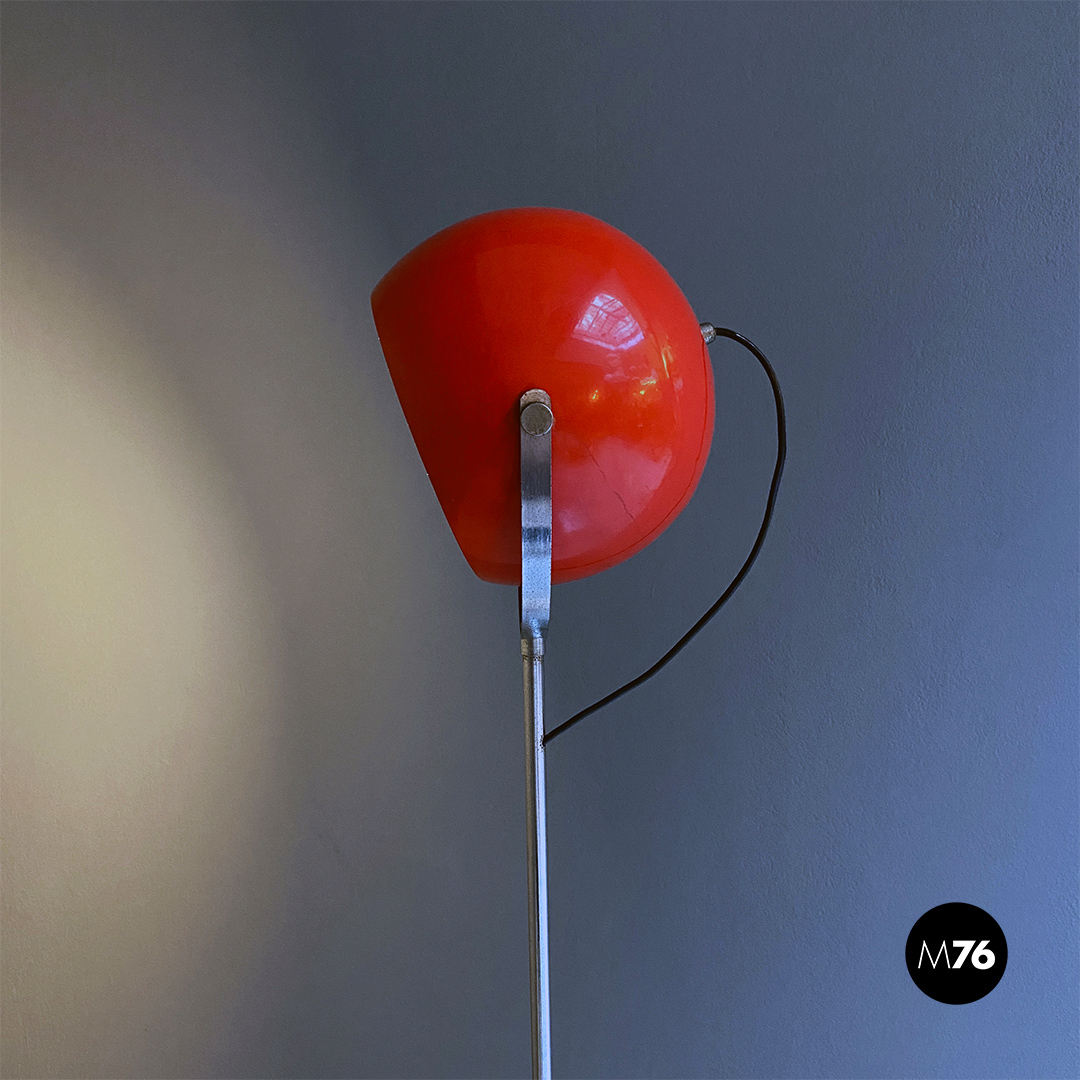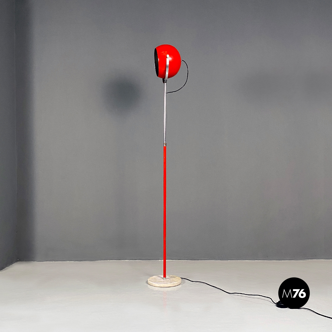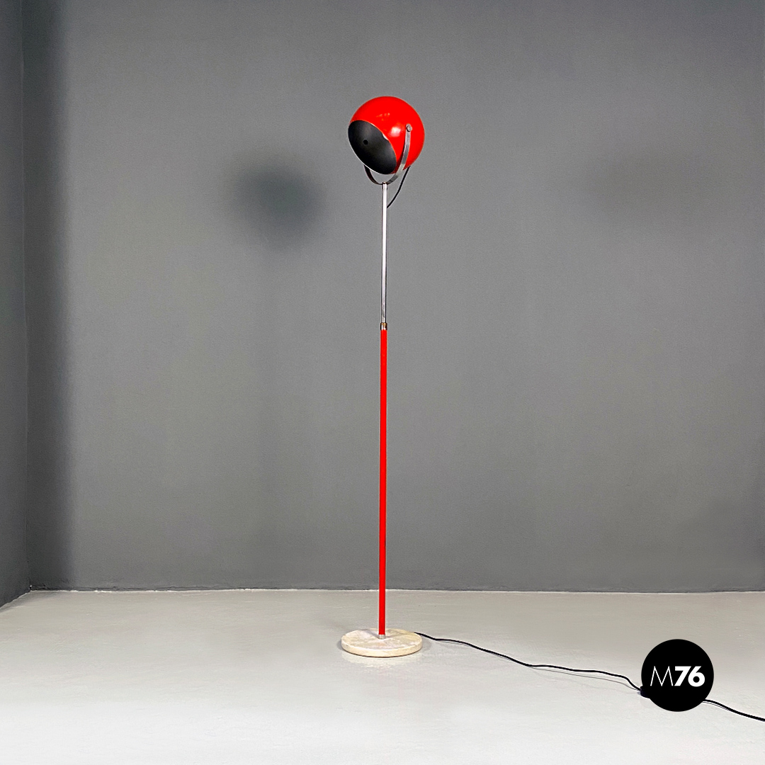 Lampada da terra con base tonda in marmo stelo in metallo rosso con parte terminale in acciaio cromato a cui è ancorato il diffusore a sfera orientabile sempre in metallo rosso con finitura interna color argento satinato.