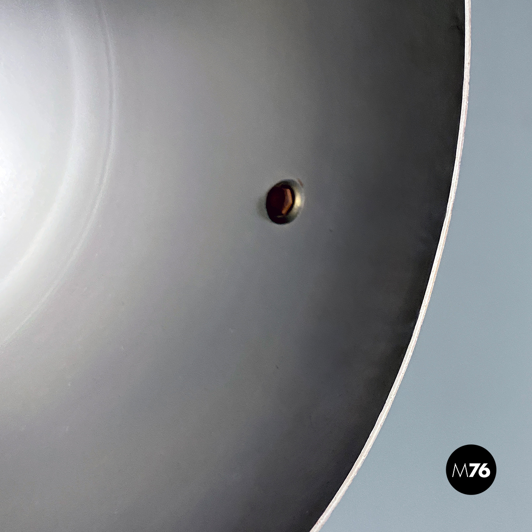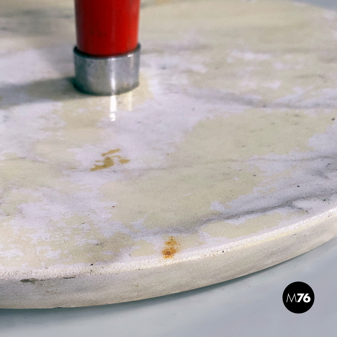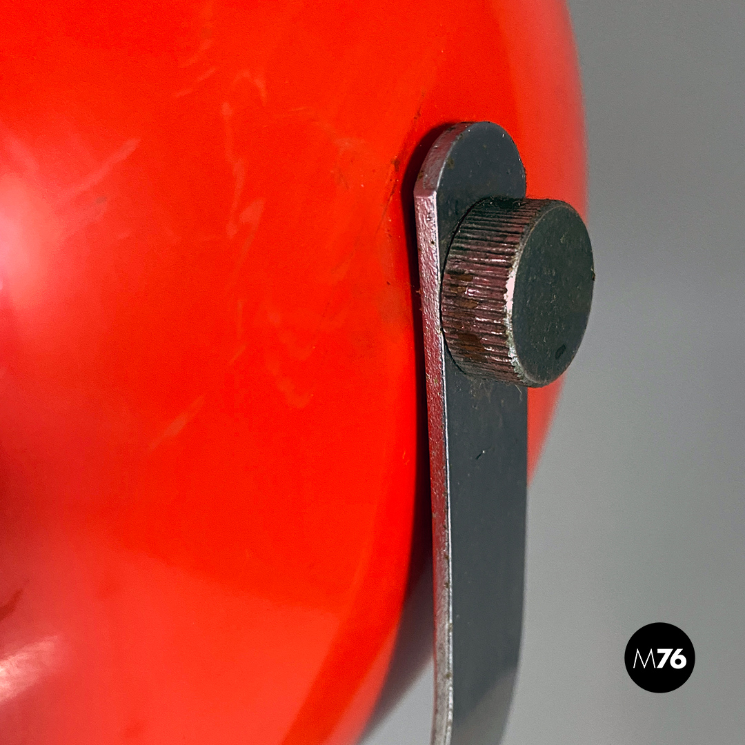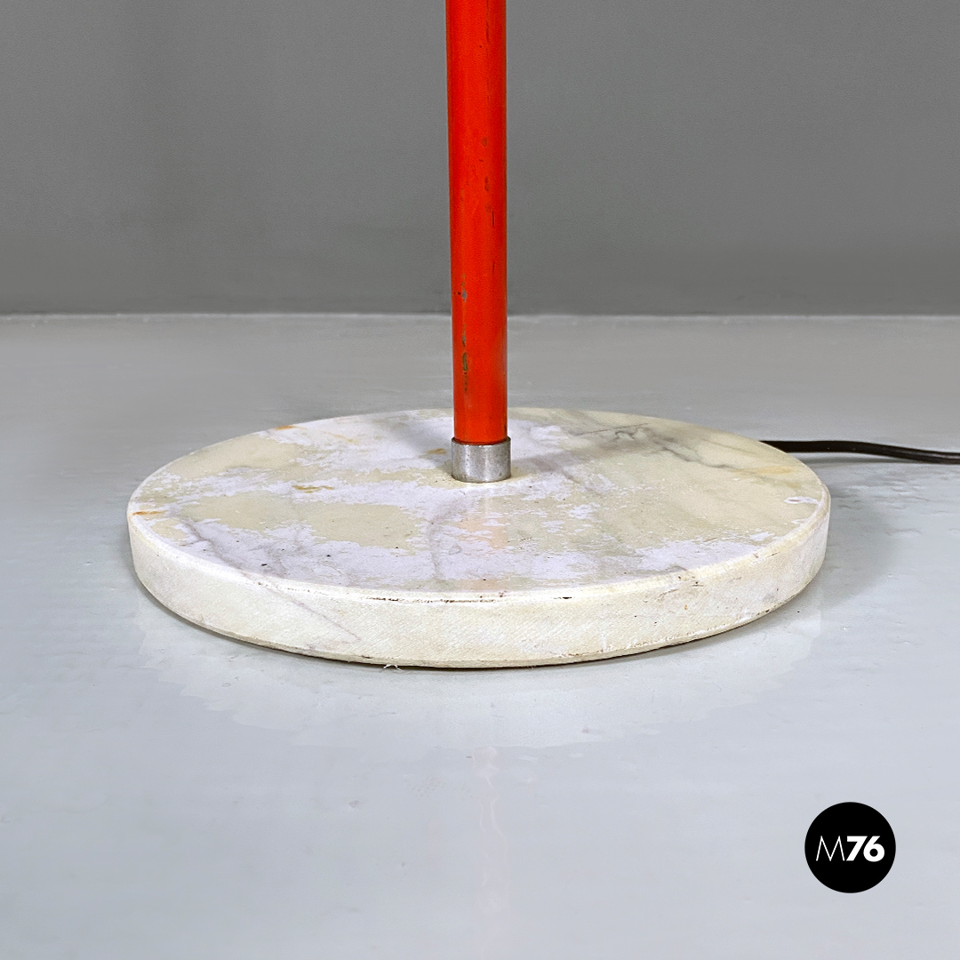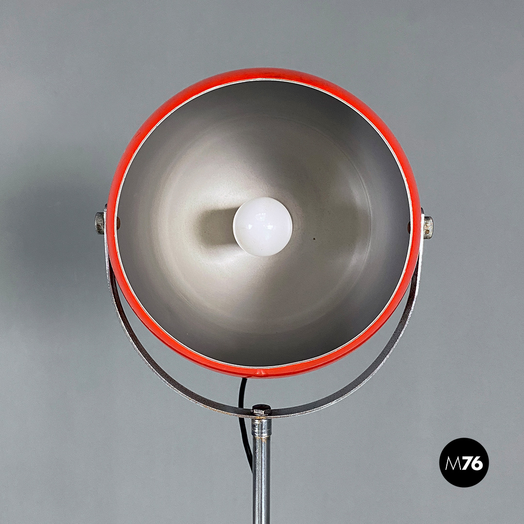 Lampada da terra con base tonda in marmo stelo in metallo rosso con parte terminale in acciaio cromato a cui è ancorato il diffusore a sfera orientabile sempre in metallo rosso con finitura interna color argento satinato.