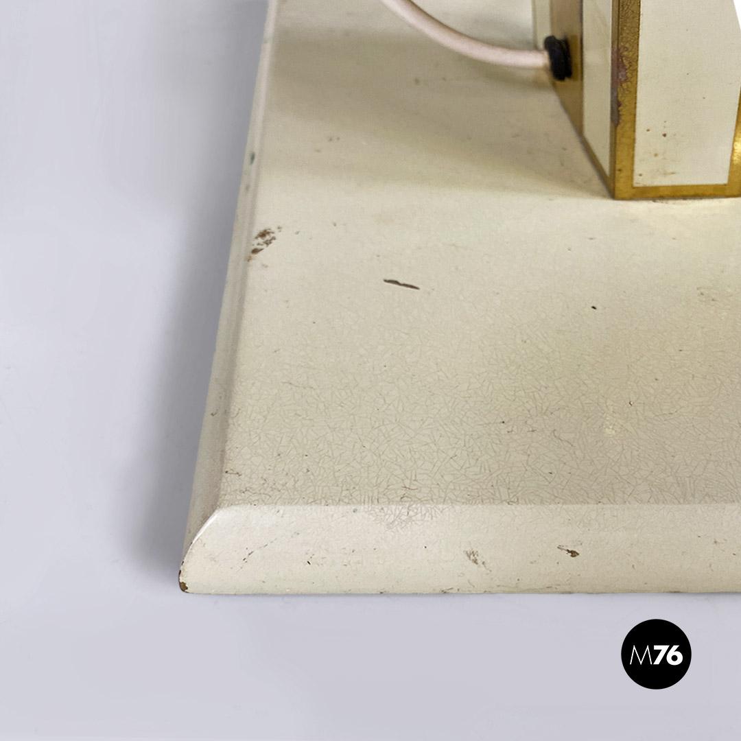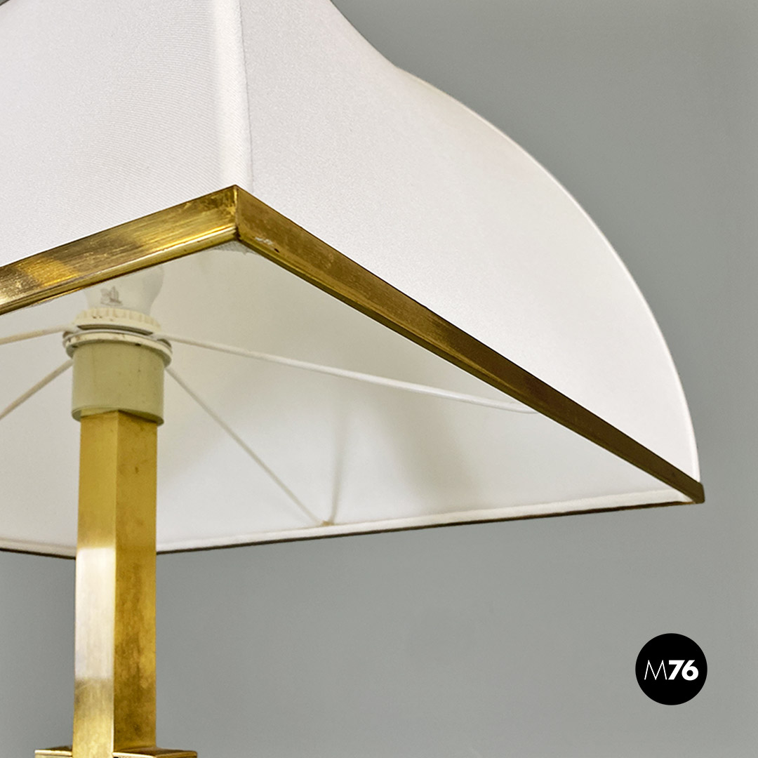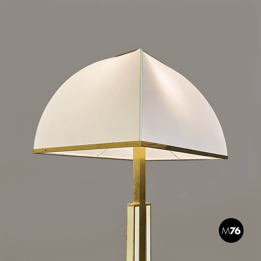 Lampada da terra con struttura in ottone e metallo bianco panna con base in marmo paralume in tessuto a cupola a base rettangolare.