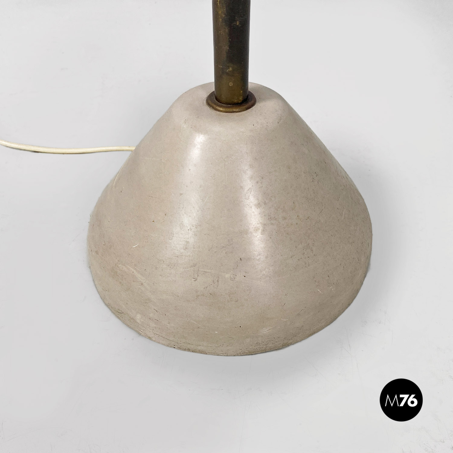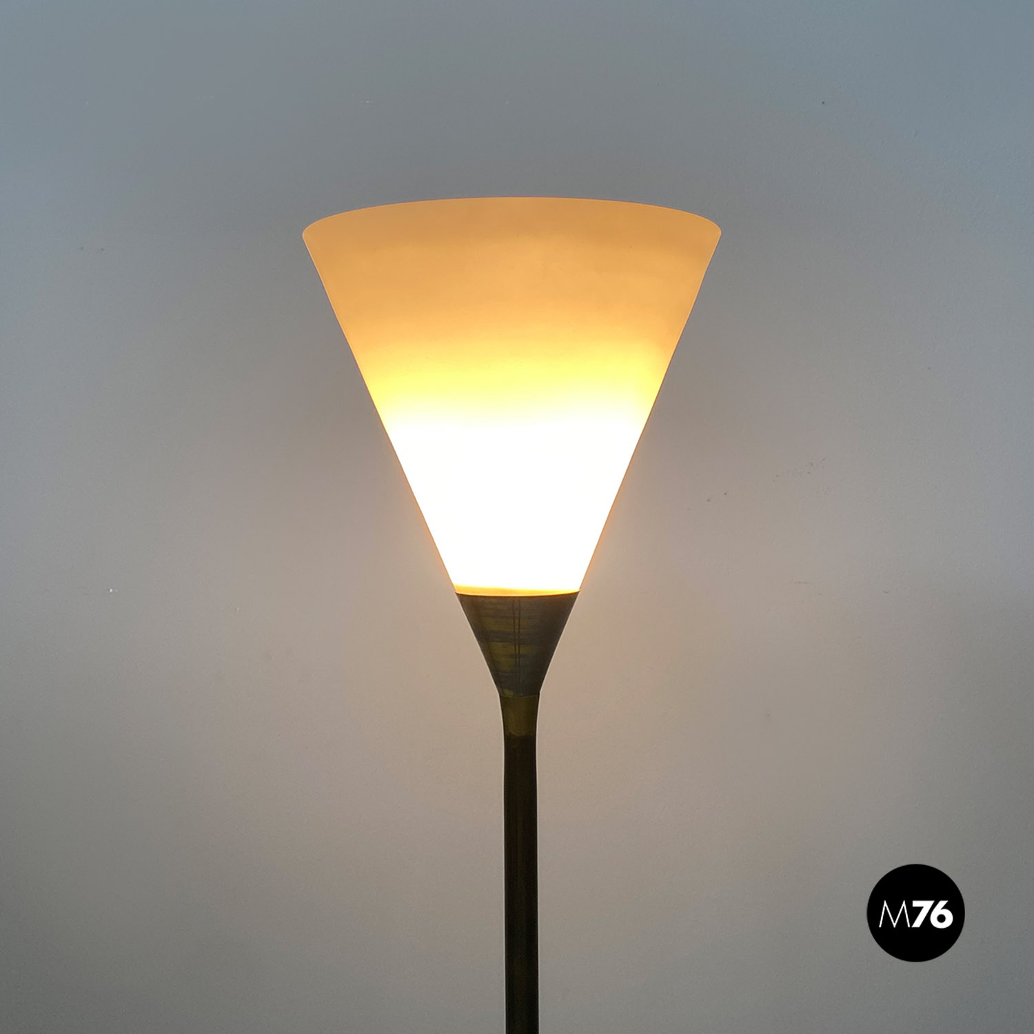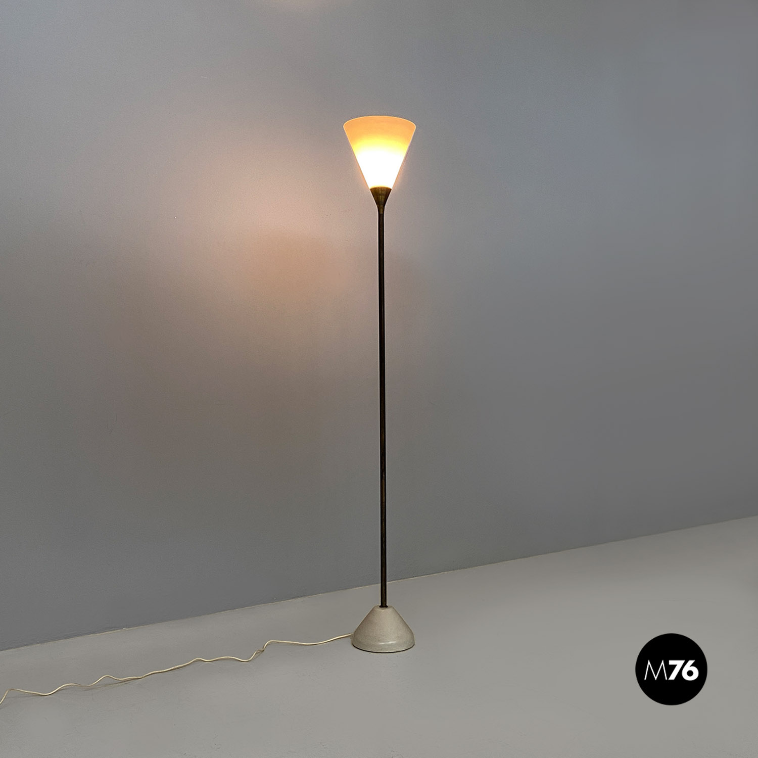 Lampada da terra con stelo e il cono su cui è posto il paralume in ottone. Base in fusione di ghisa laccata bianca. Il vetro è originale triplex bianco opaco all’esterno e bianco lucido all’interno per ottenere una migliore riflessione della luce.