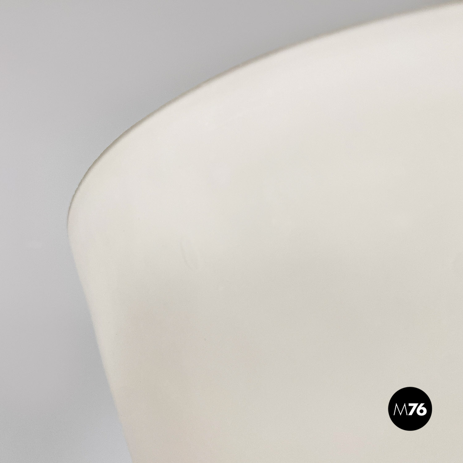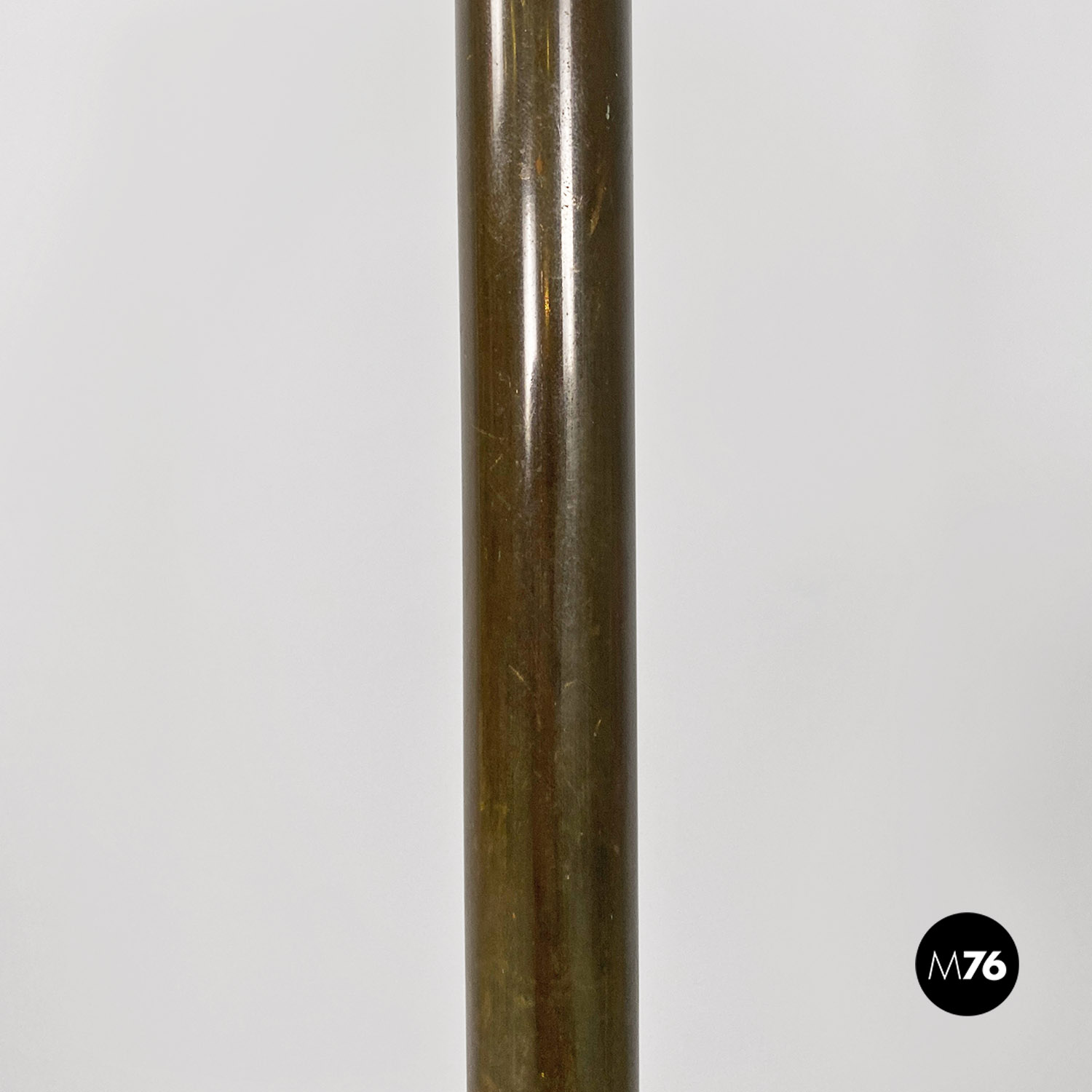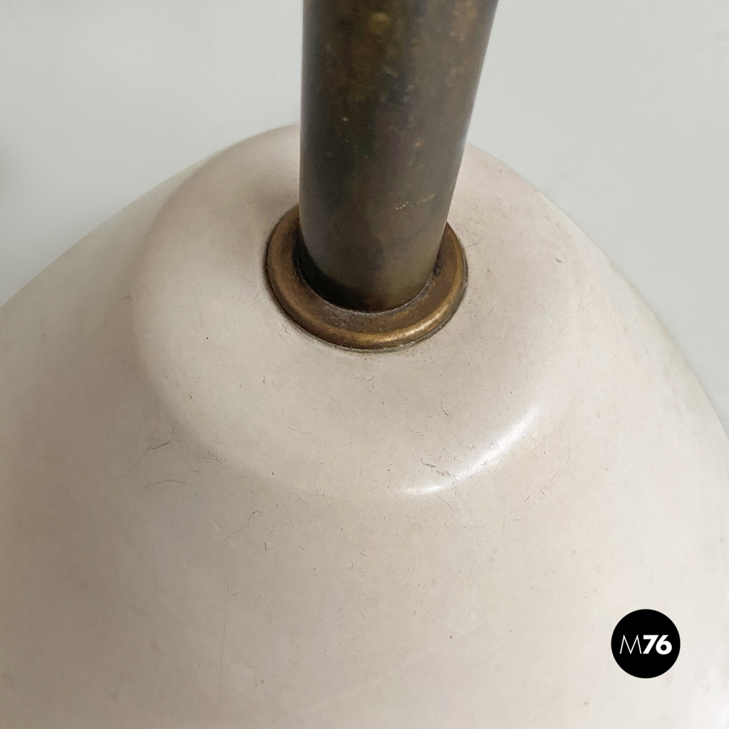 Lampada da terra con stelo e il cono su cui è posto il paralume in ottone. Base in fusione di ghisa laccata bianca. Il vetro è originale triplex bianco opaco all’esterno e bianco lucido all’interno per ottenere una migliore riflessione della luce.