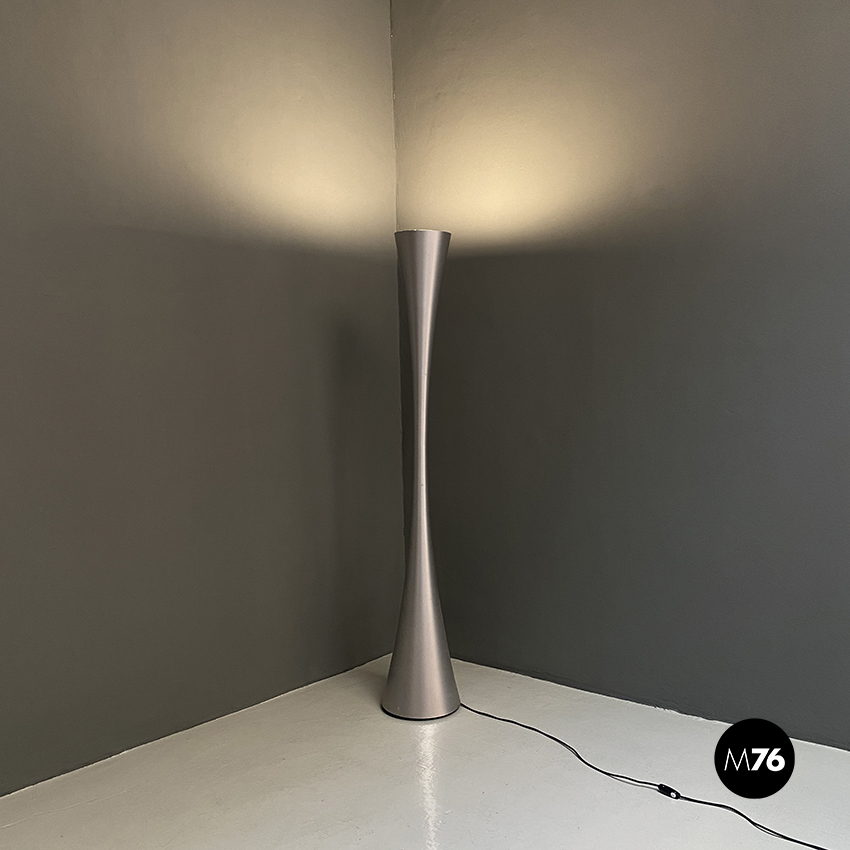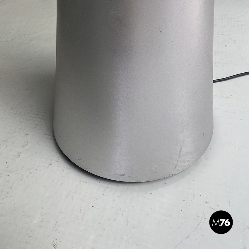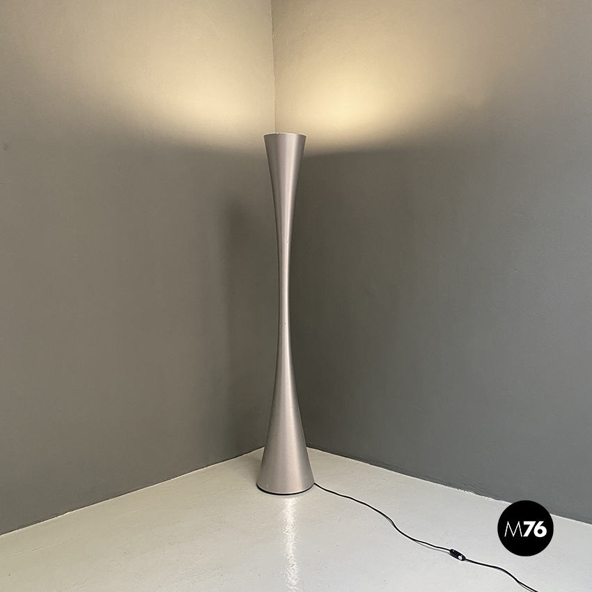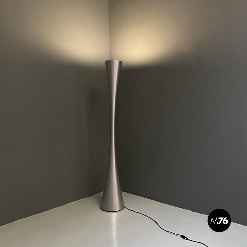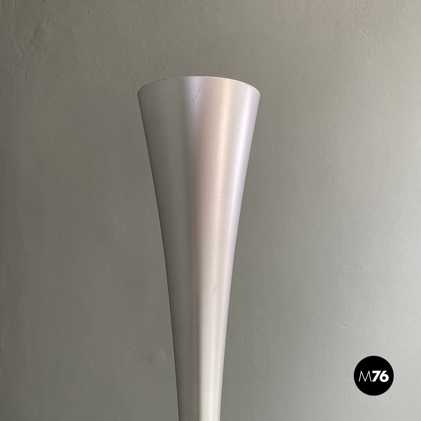 Lampada da terra svasata con struttura in plastica color argento ed emissione a luce indiretta.