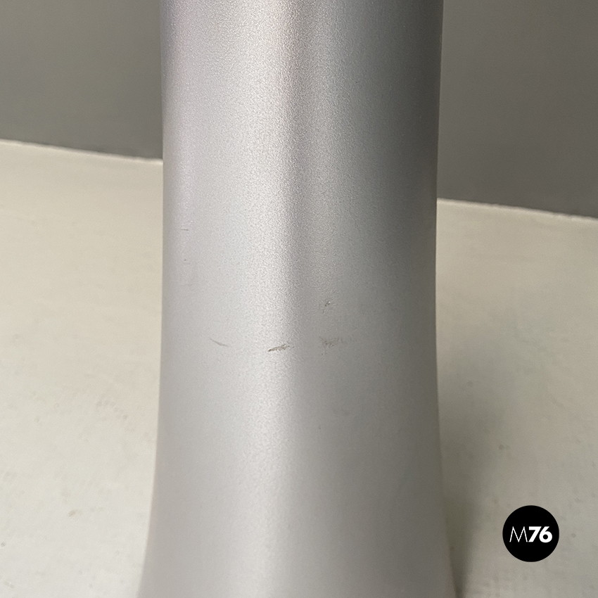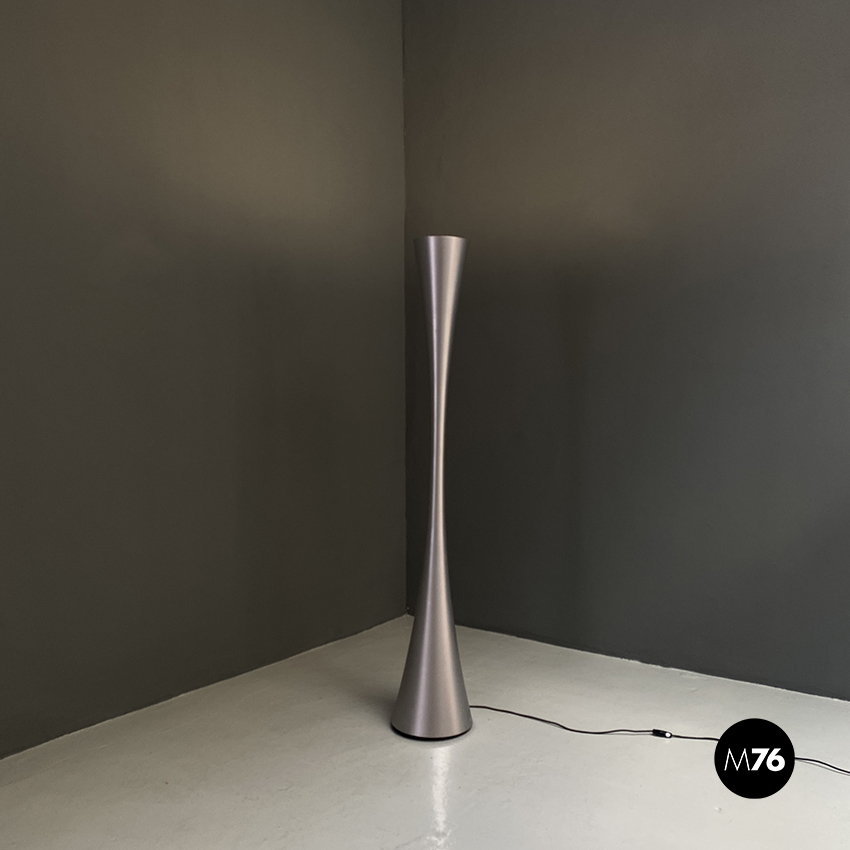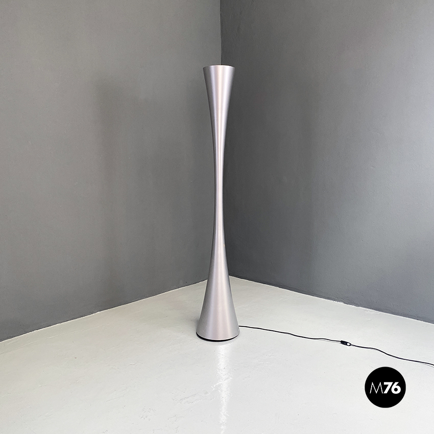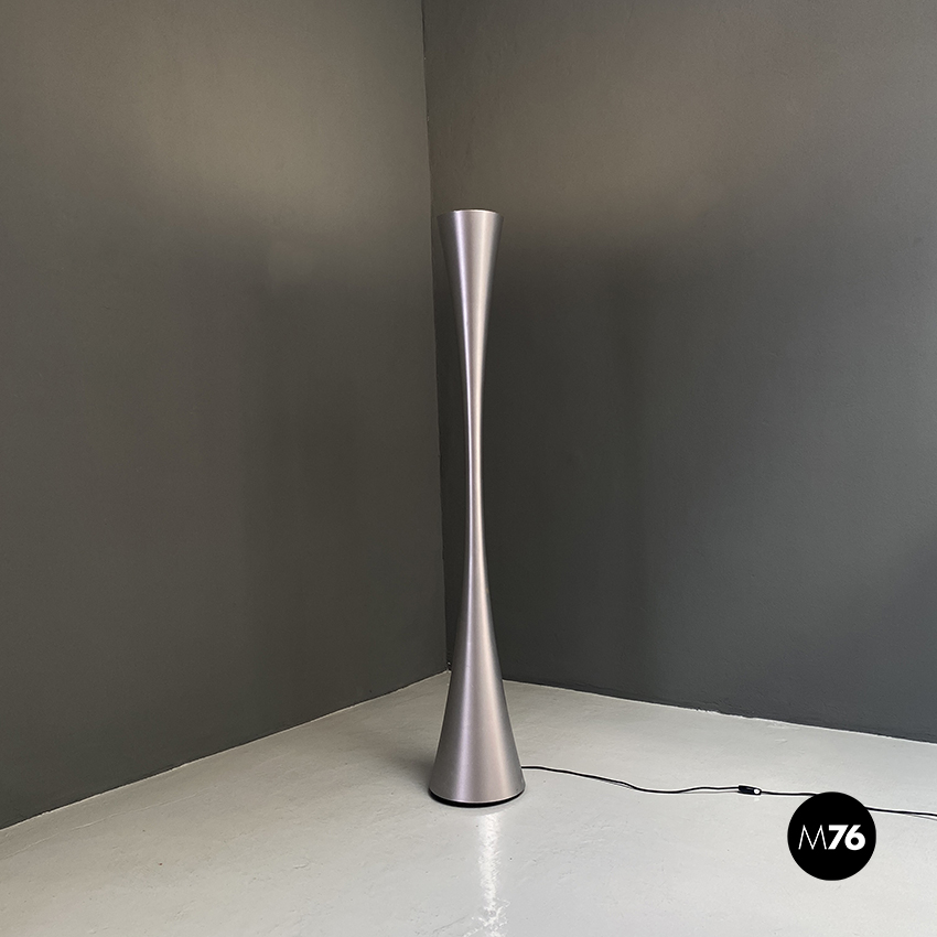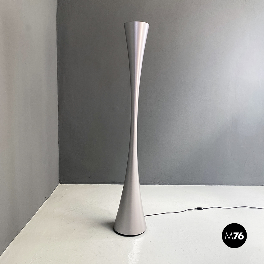 Lampada da terra svasata con struttura in plastica color argento ed emissione a luce indiretta.