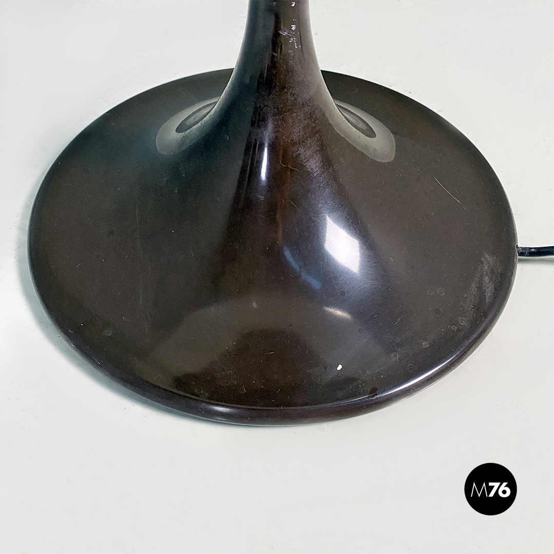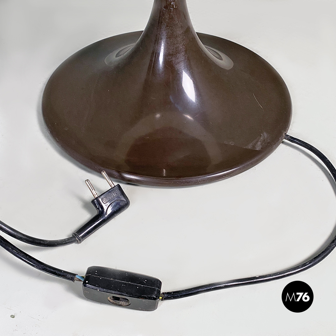 Lampada da tavolo o da terra con base di forma “tulip” in plastica marrone e diffusore a sfera in vetro opalino.