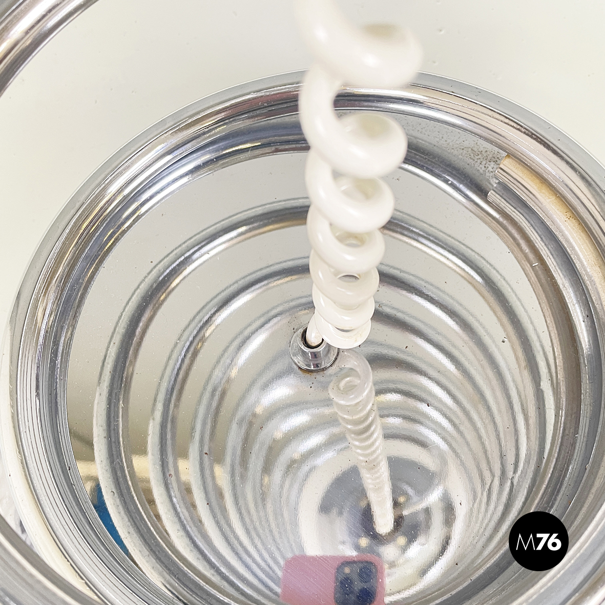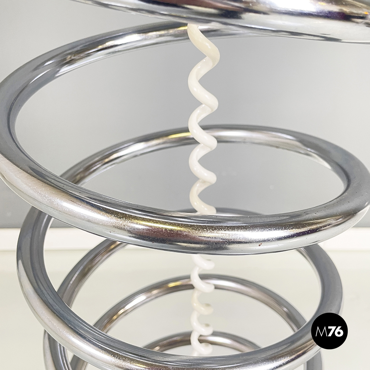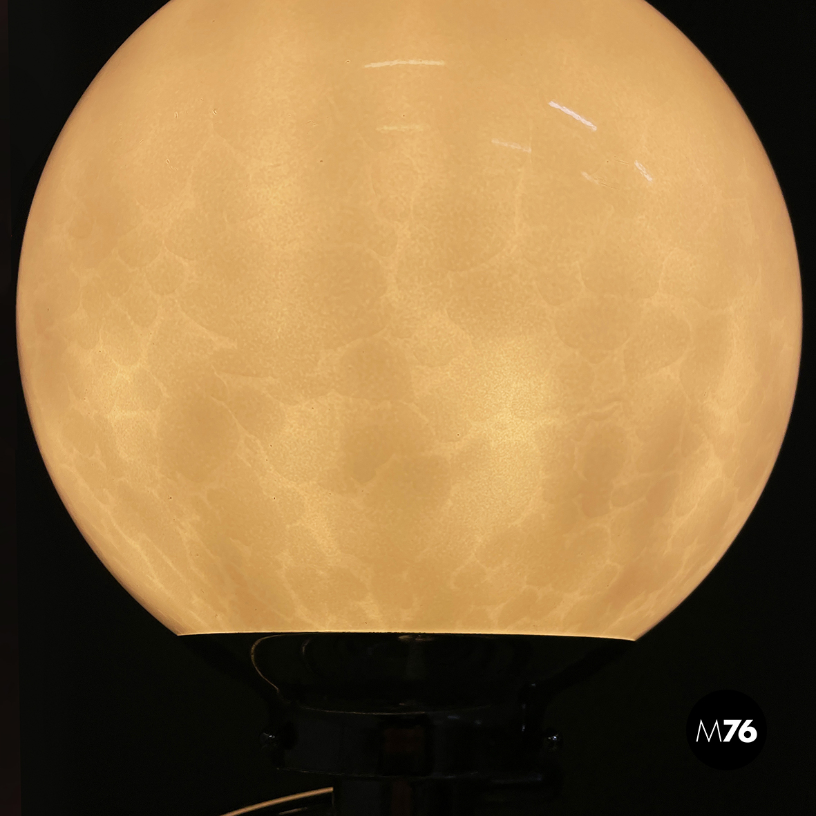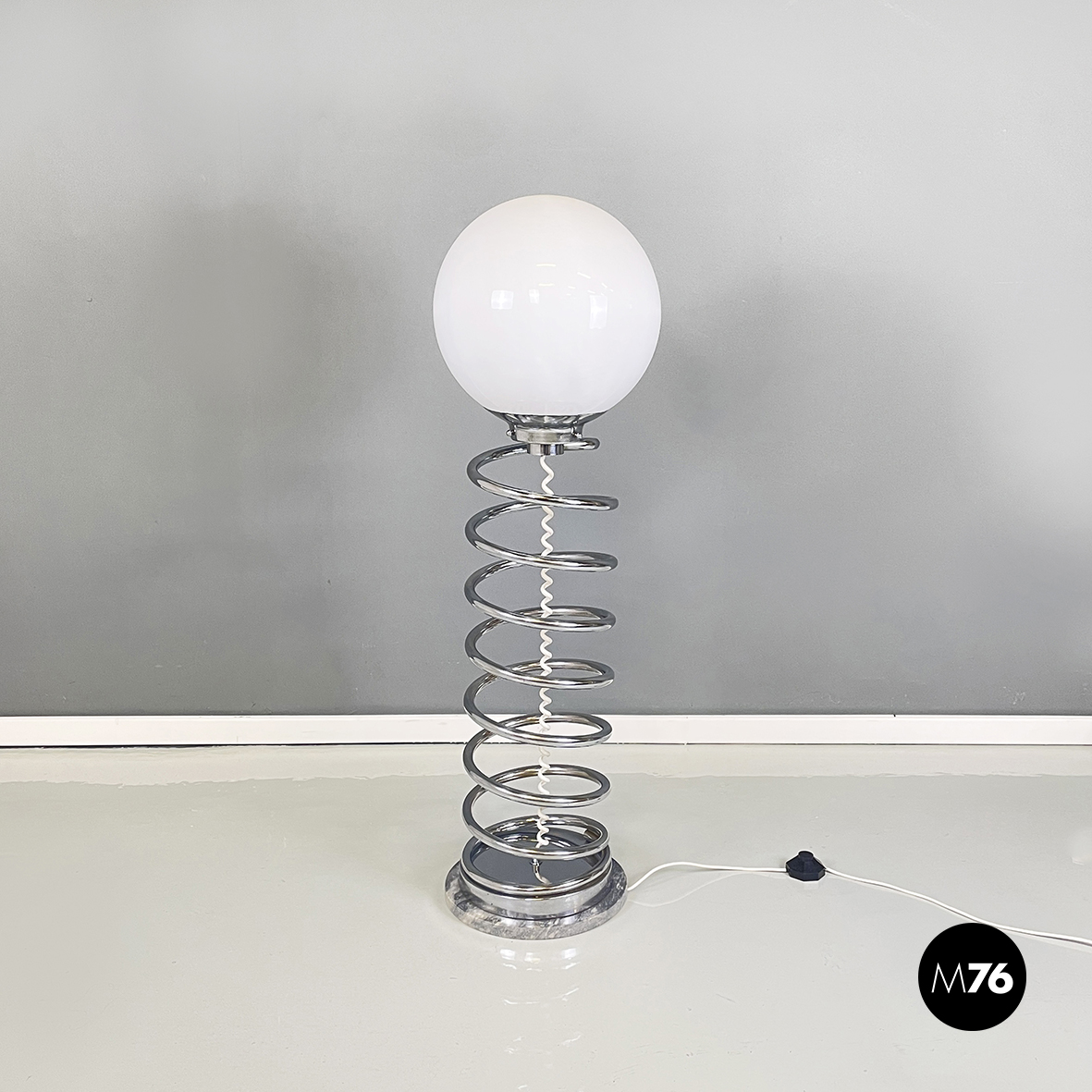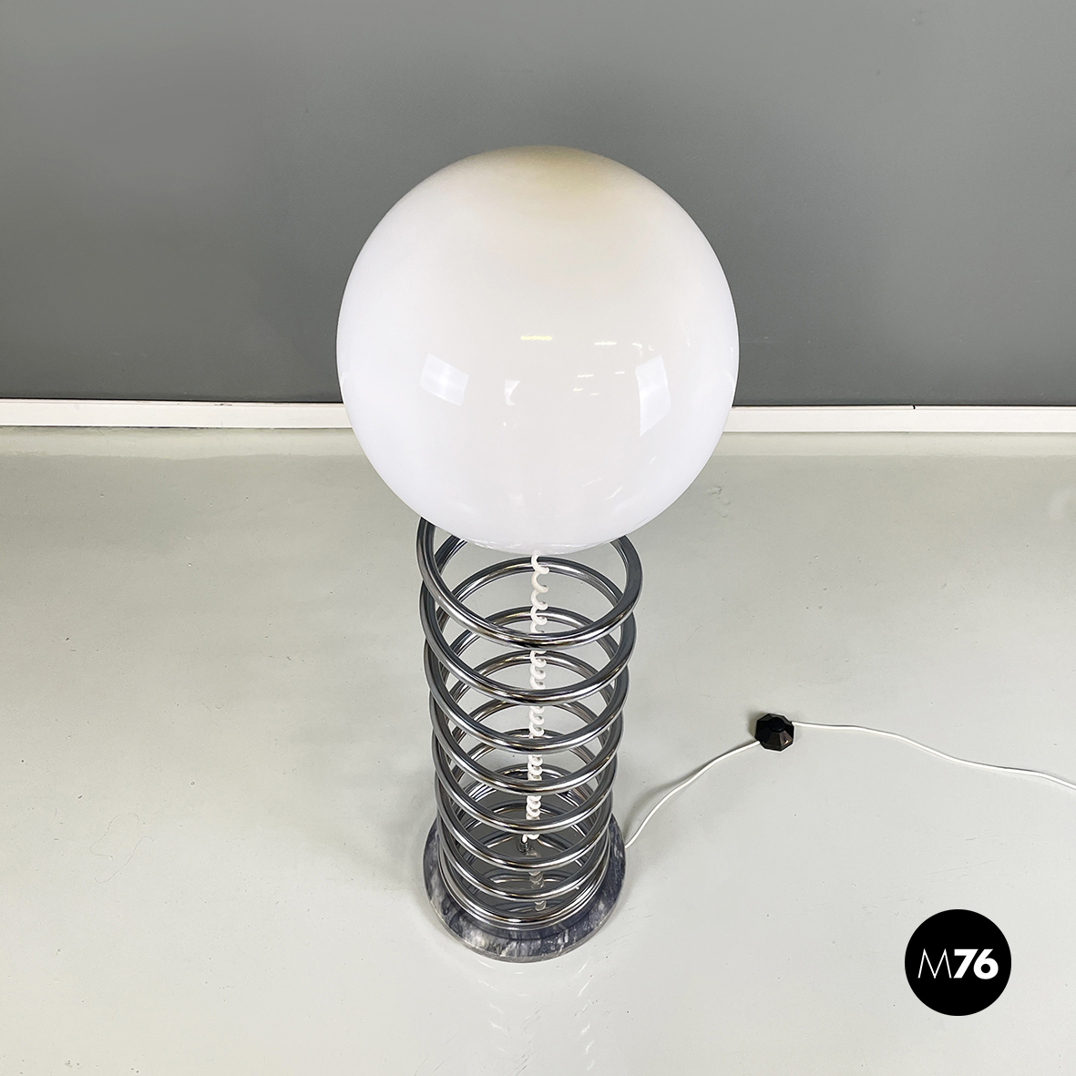 Lampada da terra con diffusore sferico in vetro opalino con decorazione interna visibile solo da accesa. La struttura centrale è in tubolare di metallo a forma di molla. Base tonda in marmo grigio.