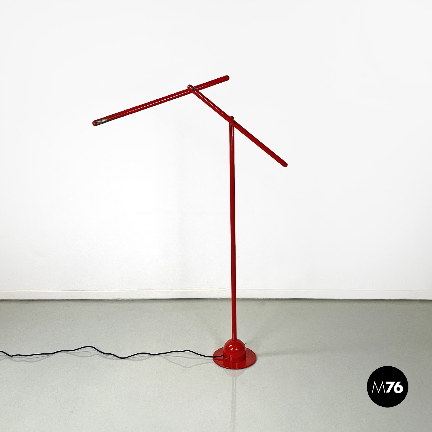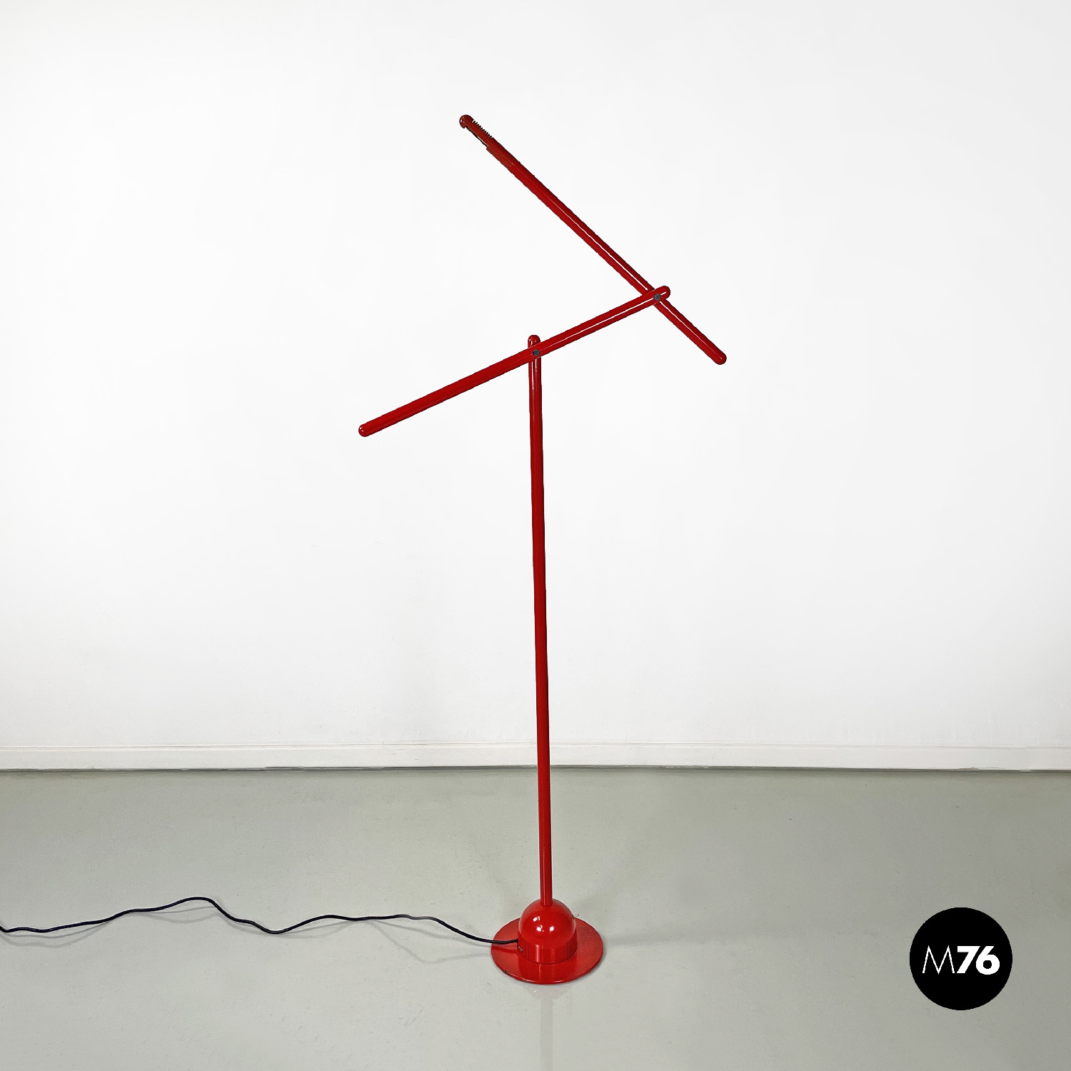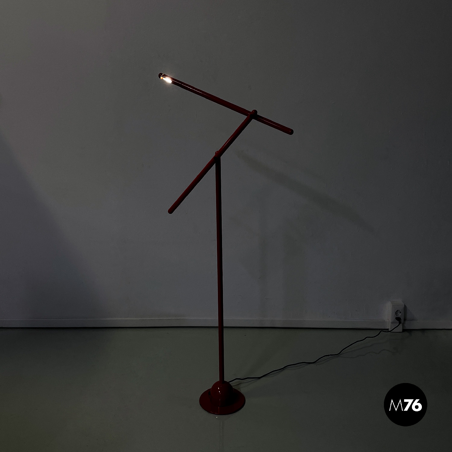 Lampada da terra modello Mira a base tonda. La struttura è composta da uno stelo a sezione circolare principale a cui sono collegate due braccia orientabili. Il diffusore trova nella parte finale del secondo braccio ed è anch’esso orientabile. La struttura è interamente in metallo laccato rosso con finitura lucida l’interruttore si trova alla base.