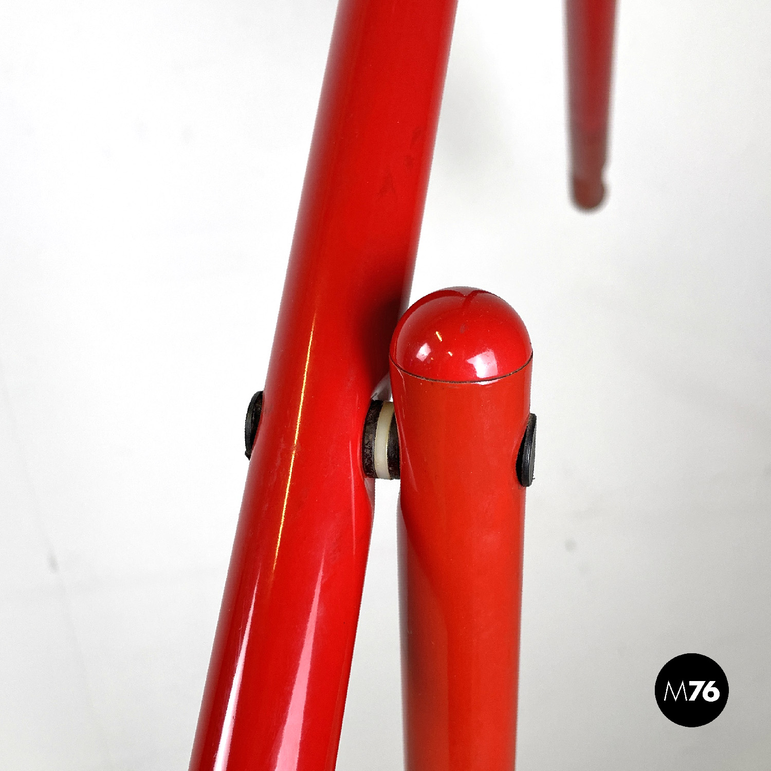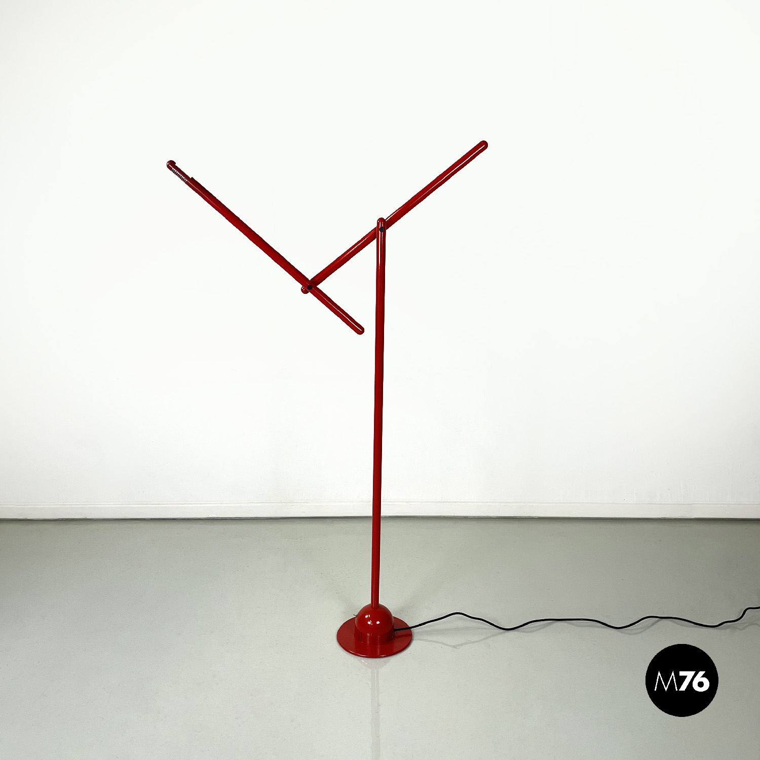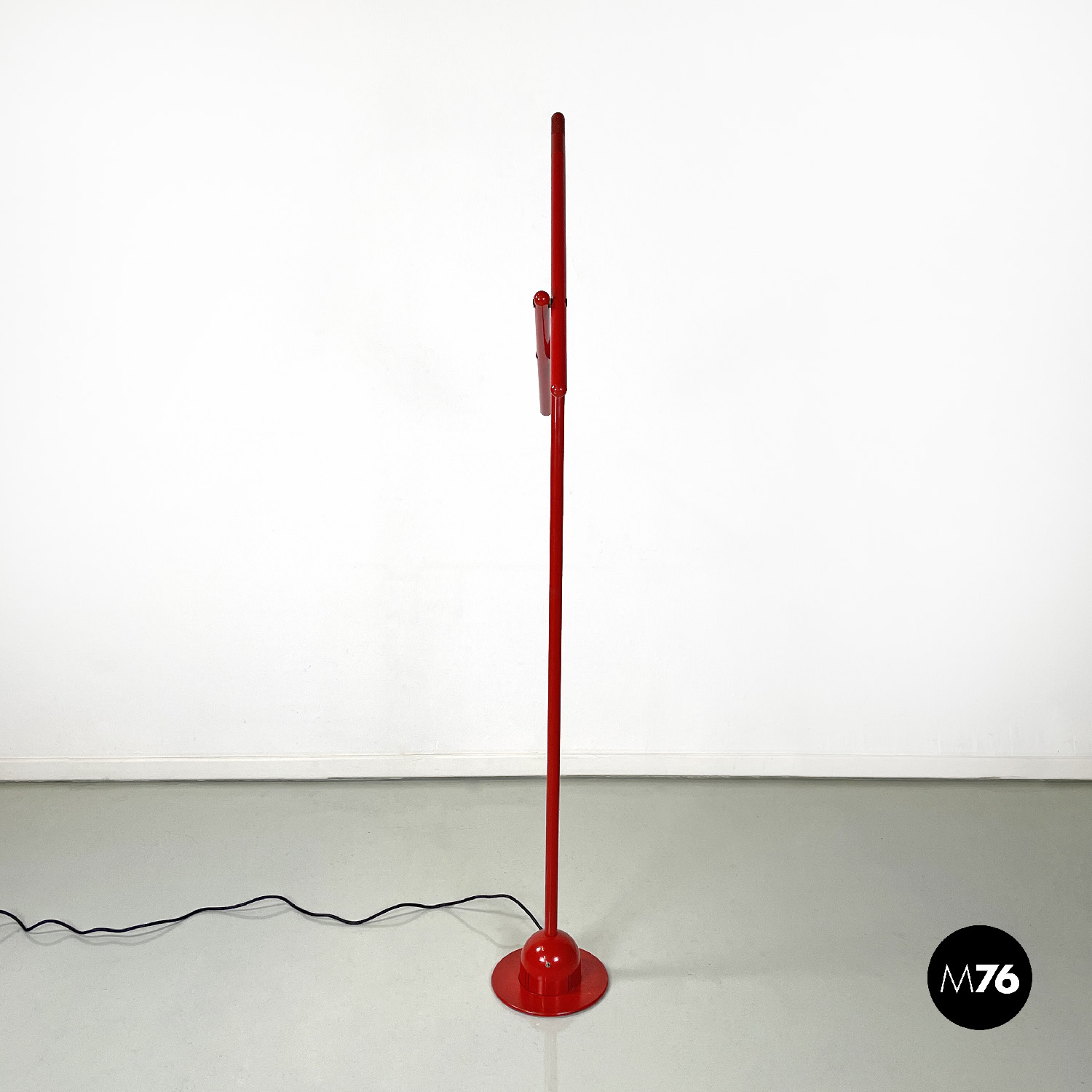 Lampada da terra modello Mira a base tonda. La struttura è composta da uno stelo a sezione circolare principale a cui sono collegate due braccia orientabili. Il diffusore trova nella parte finale del secondo braccio ed è anch’esso orientabile. La struttura è interamente in metallo laccato rosso con finitura lucida l’interruttore si trova alla base.