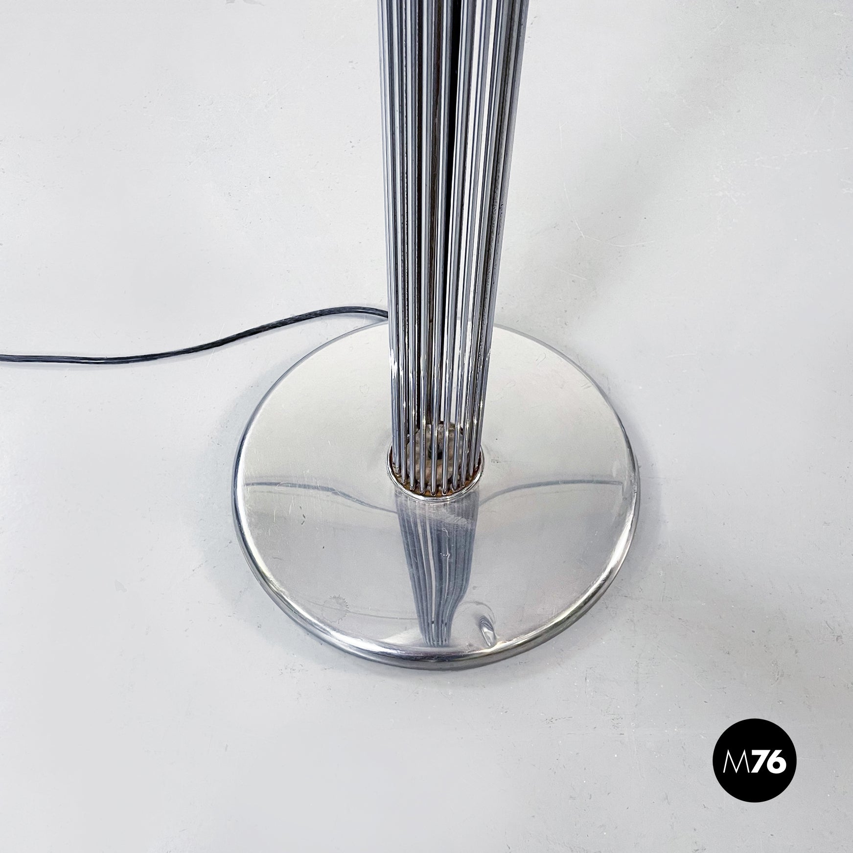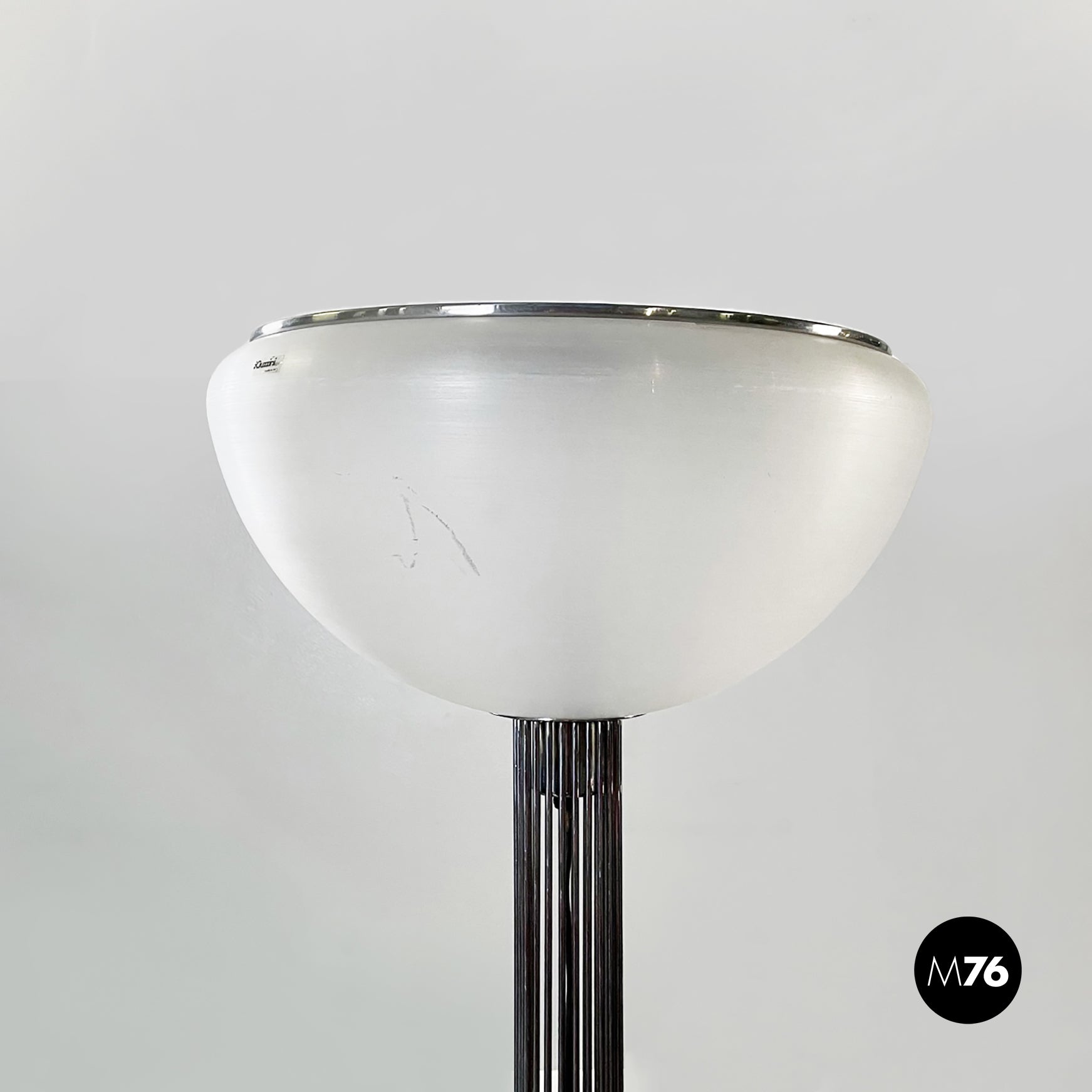 Lampada da terra modello Moana con base tonda e struttura tubolare in acciaio cromato e paralume in plastica bianca opaca.