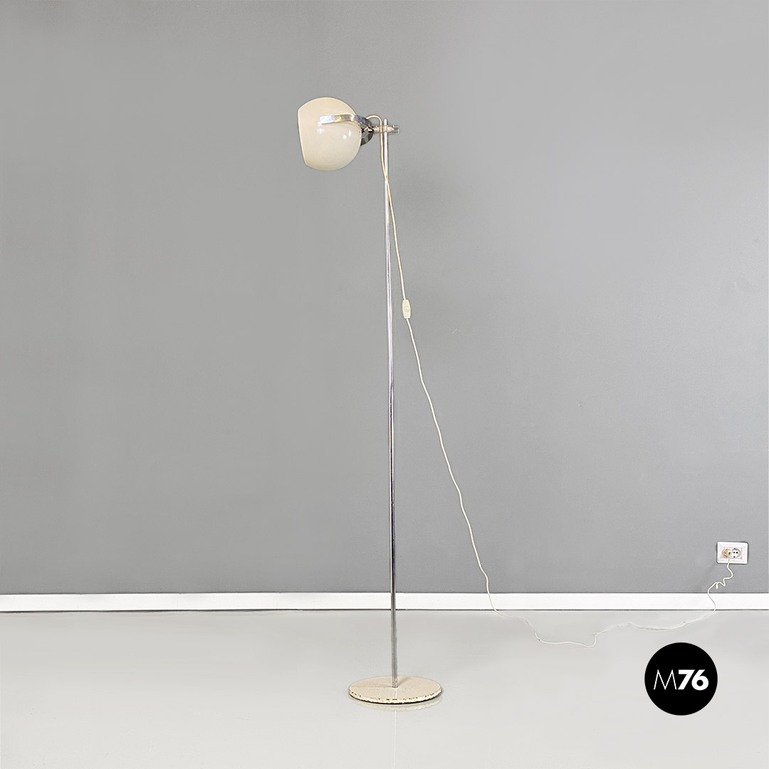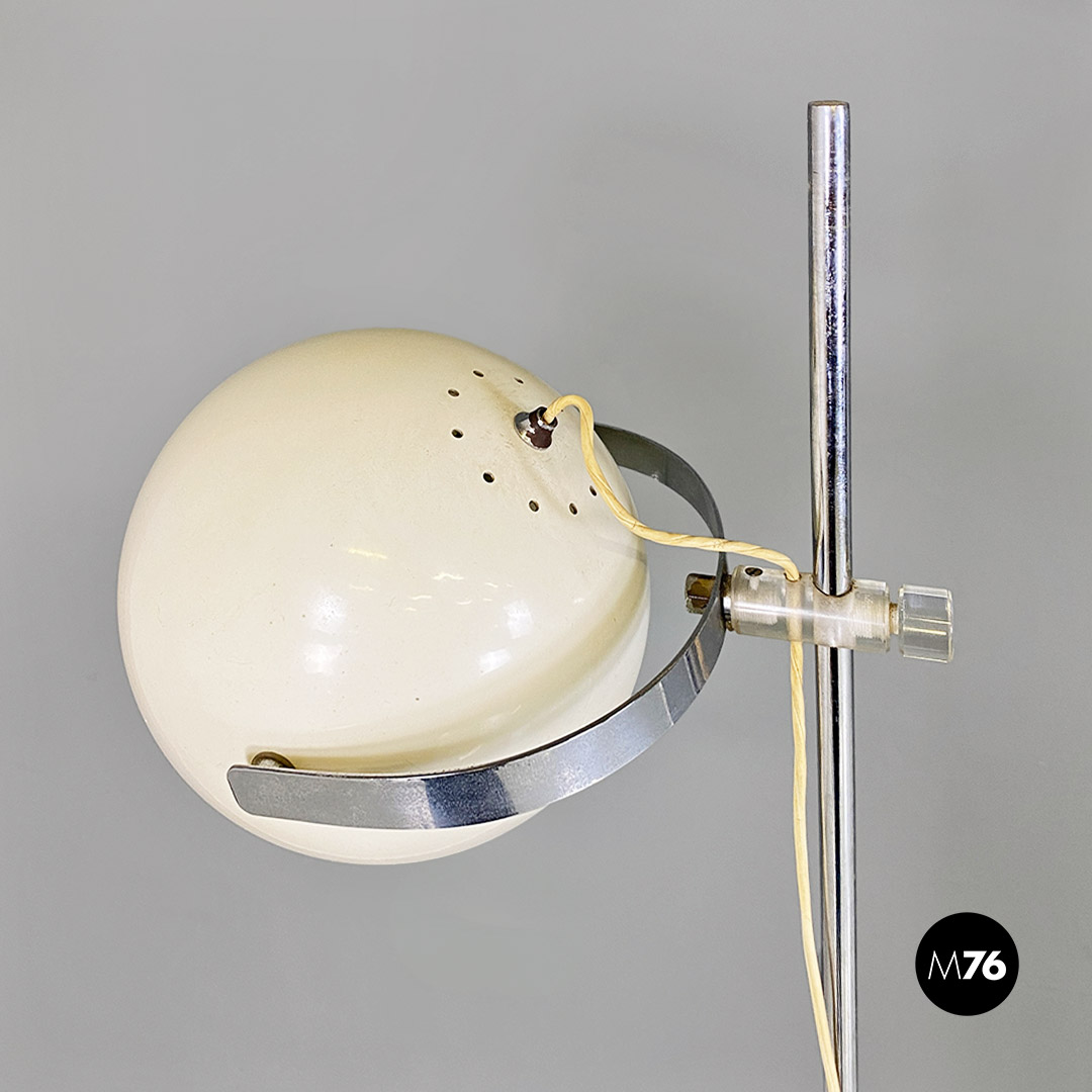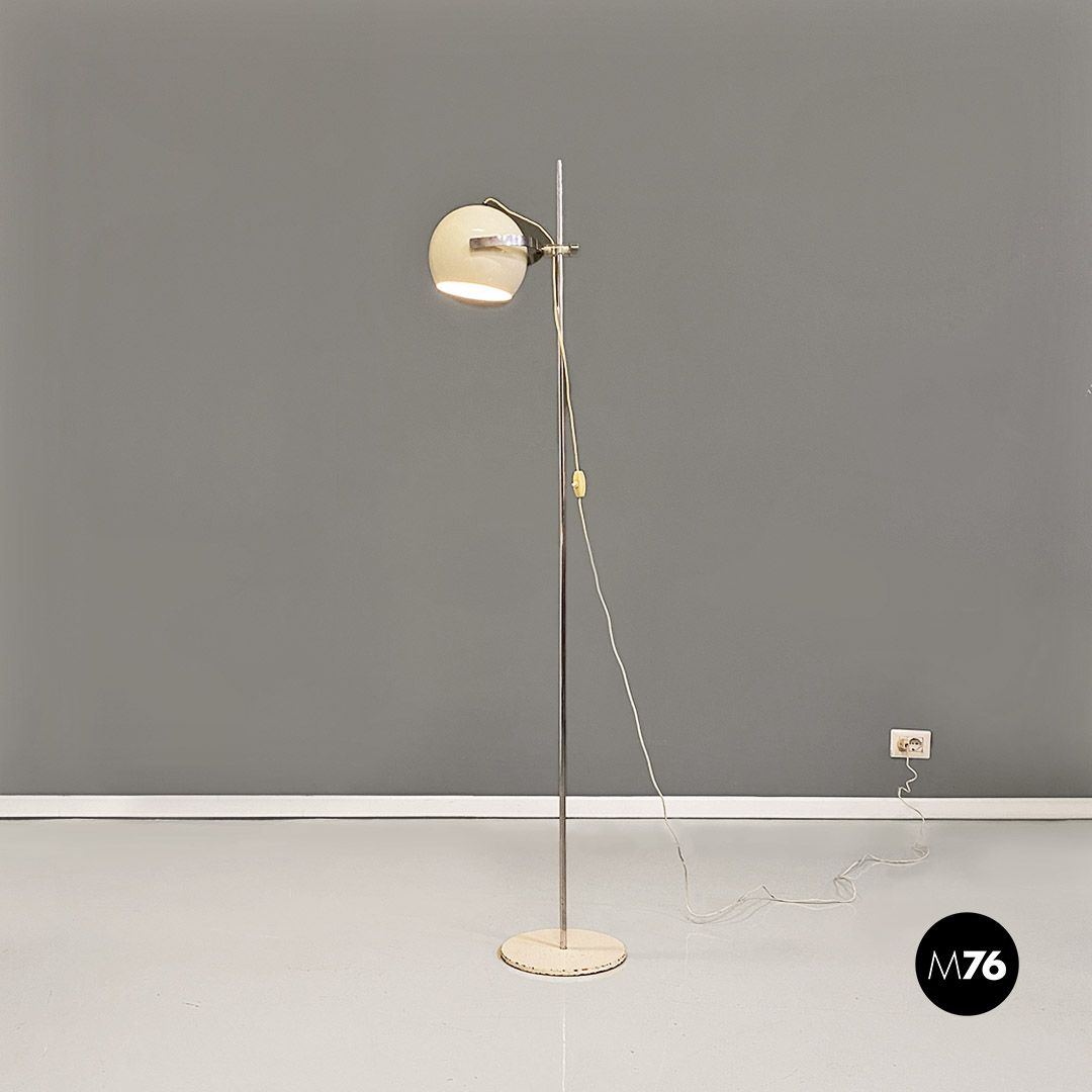 Lampada da terra orientabile con paralume sferico in metallo verniciato bianco con diffusore regolabile grazie ad un particolare aggancio in plexiglass e con stelo in acciaio cromato che appoggia su una base tonda in metallo verniciato bianco.