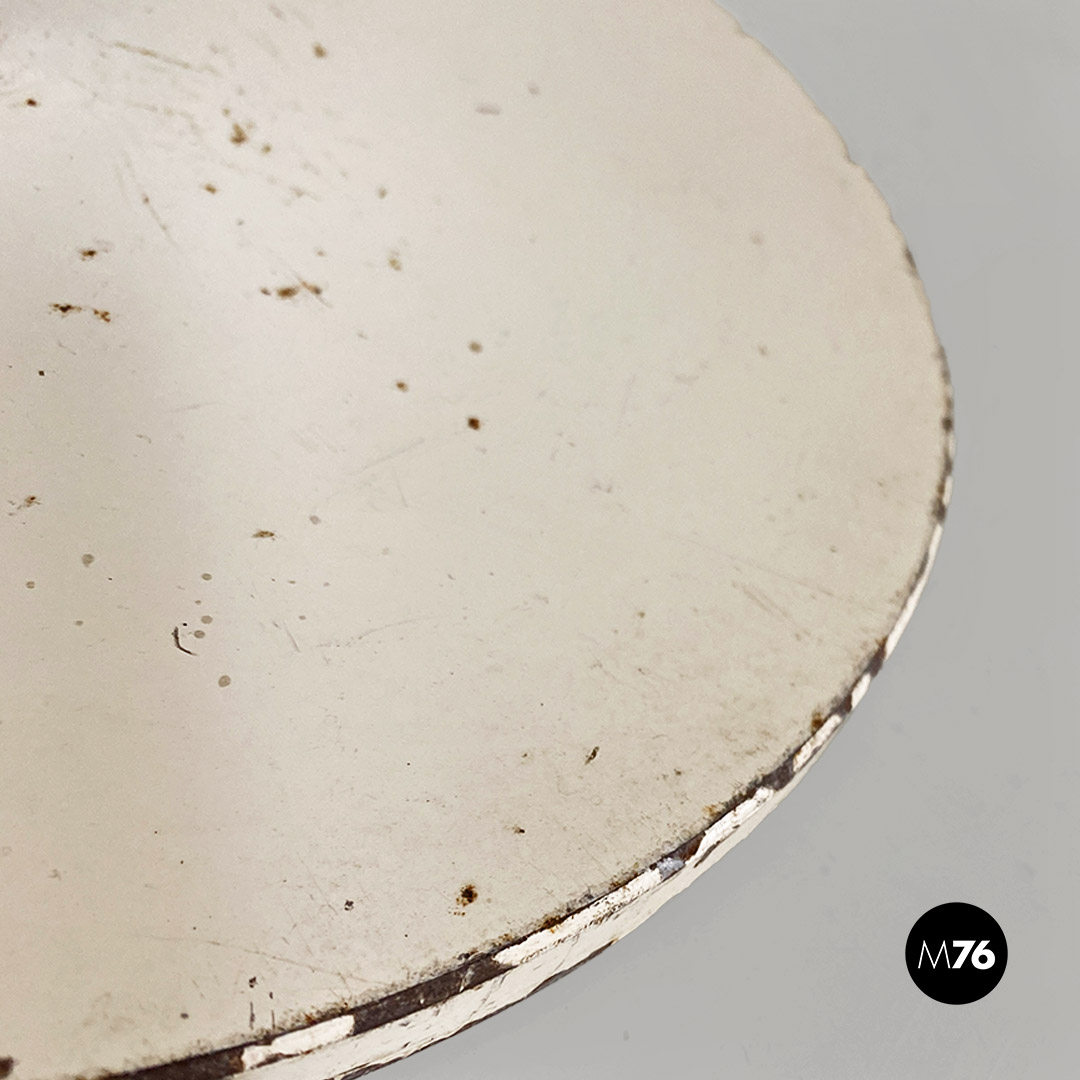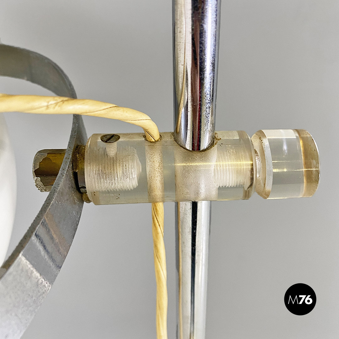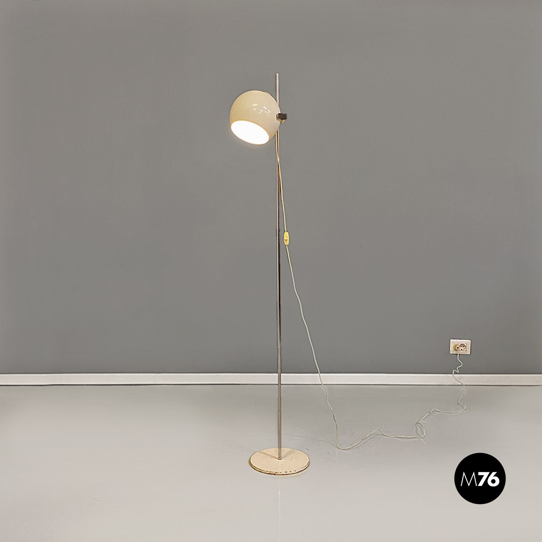 Lampada da terra orientabile con paralume sferico in metallo verniciato bianco con diffusore regolabile grazie ad un particolare aggancio in plexiglass e con stelo in acciaio cromato che appoggia su una base tonda in metallo verniciato bianco.