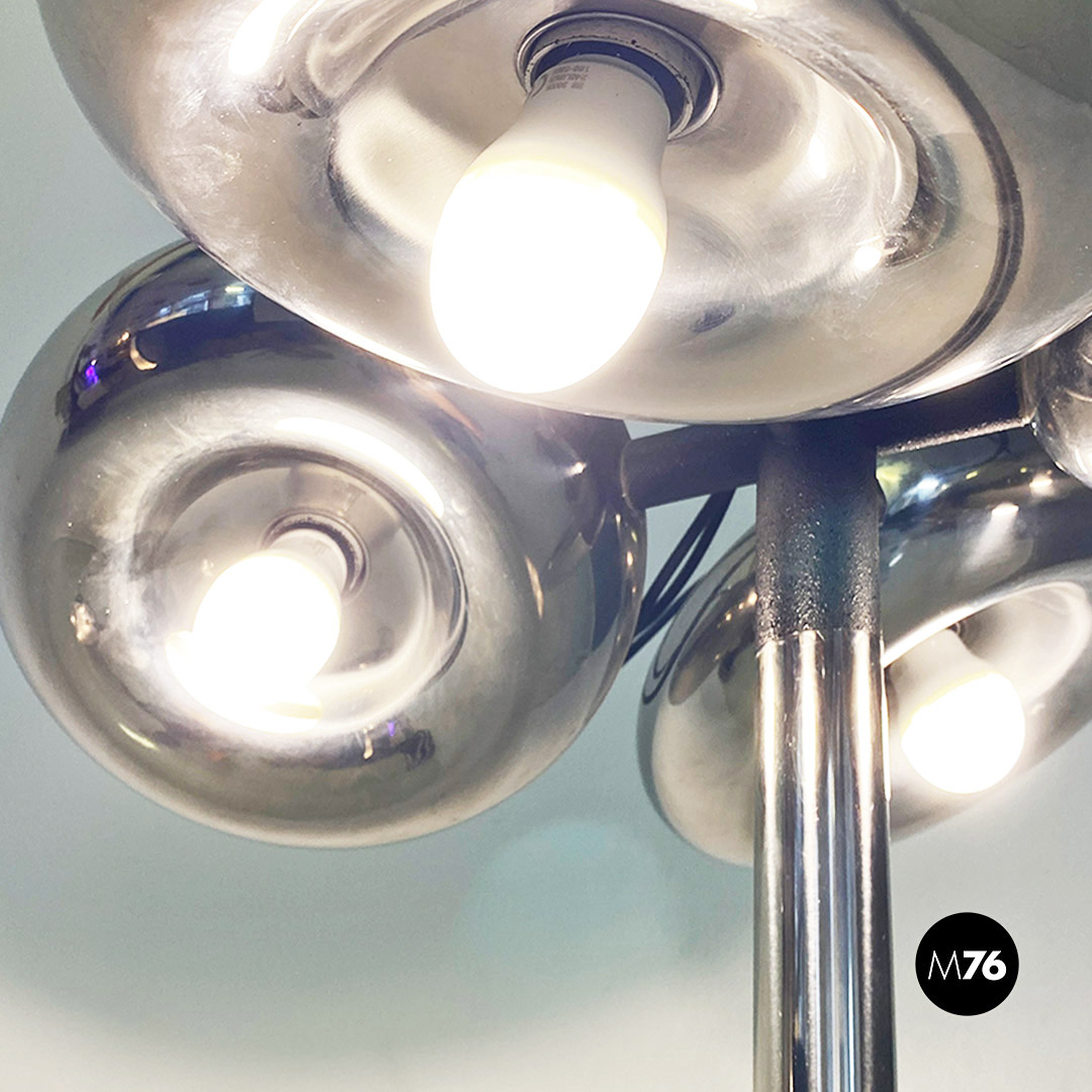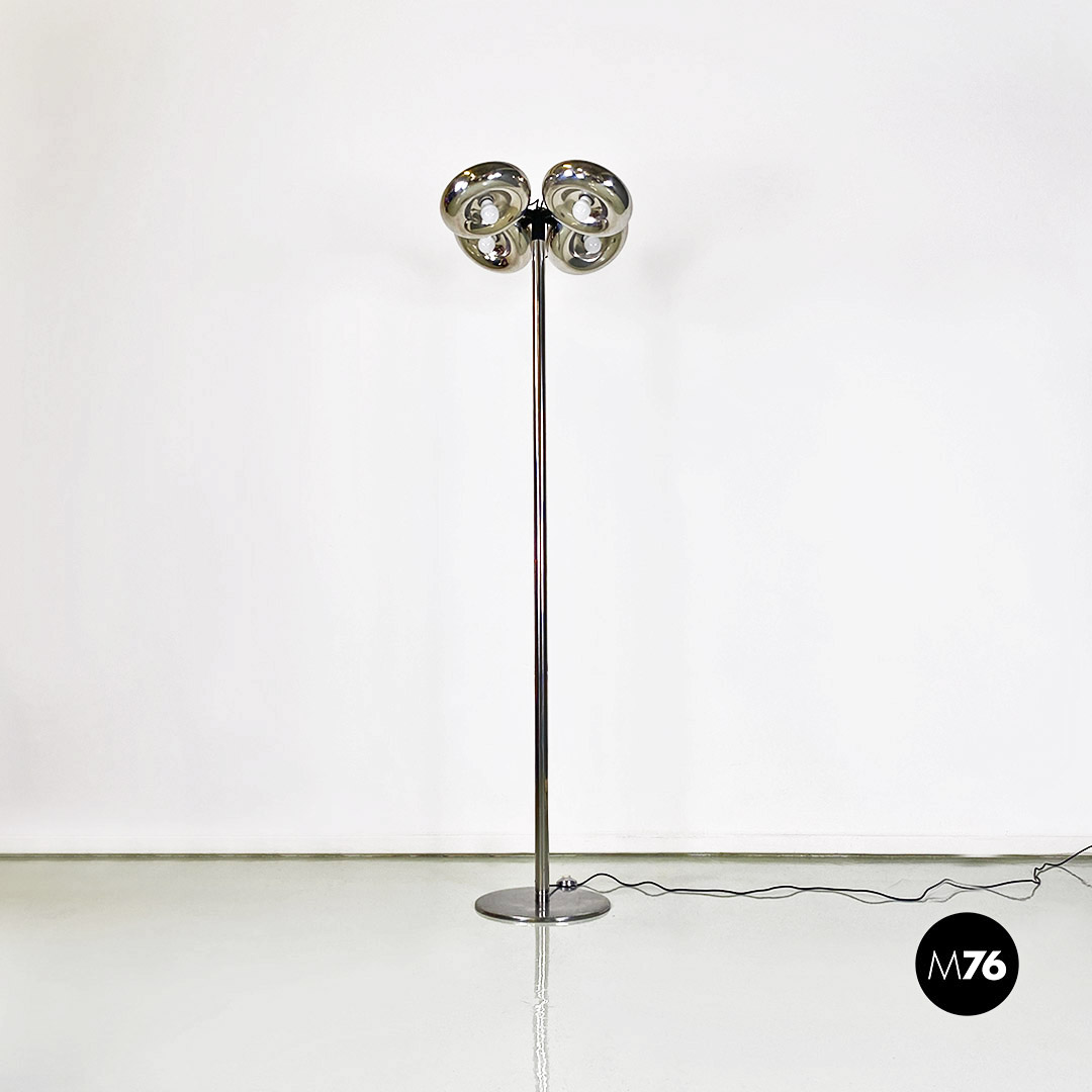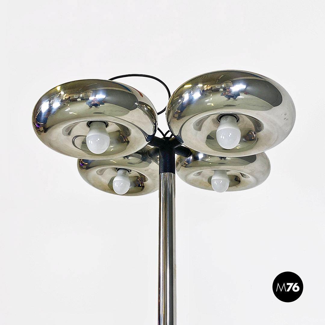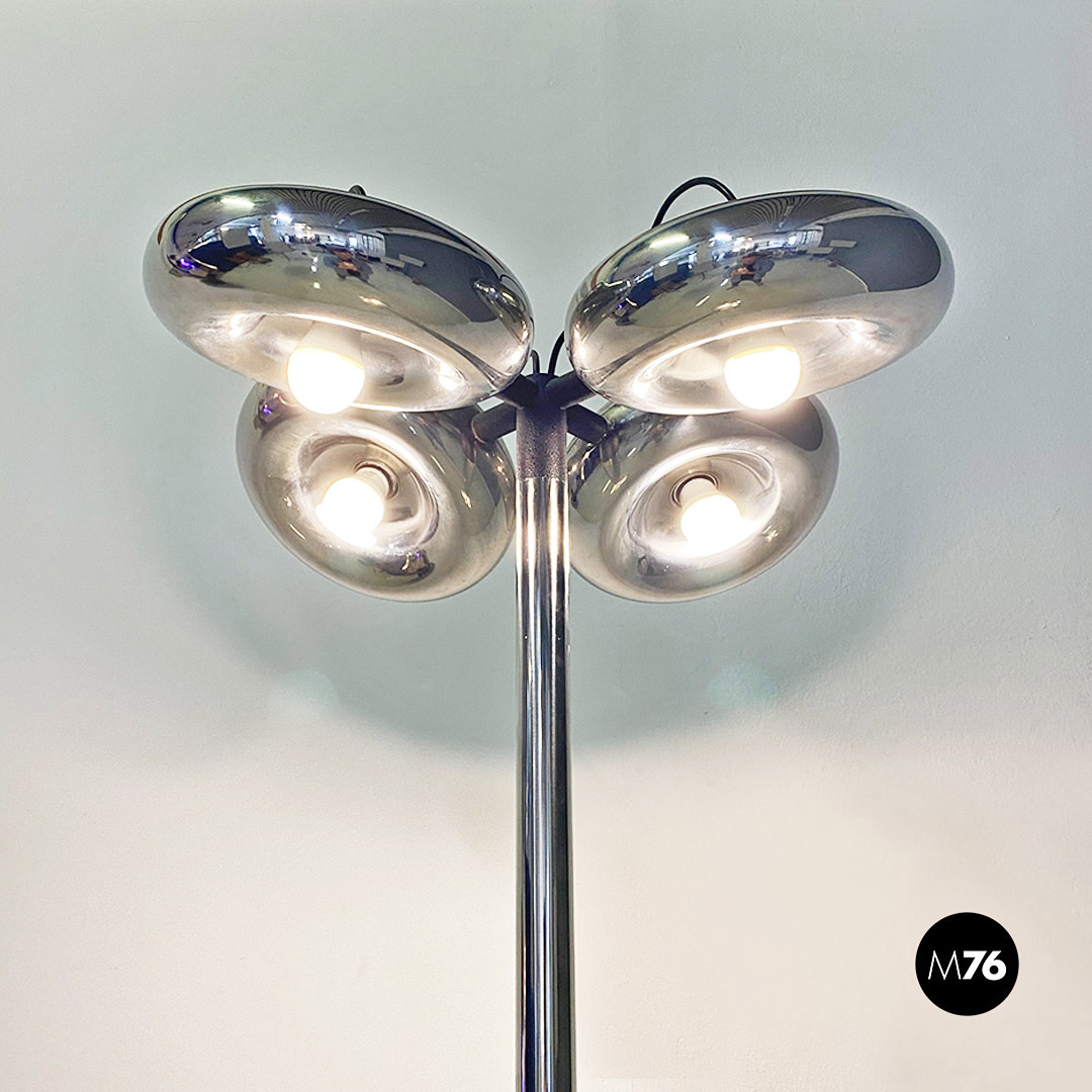 Lampada da terra interamente in acciaio cromato con quattro punti luce.