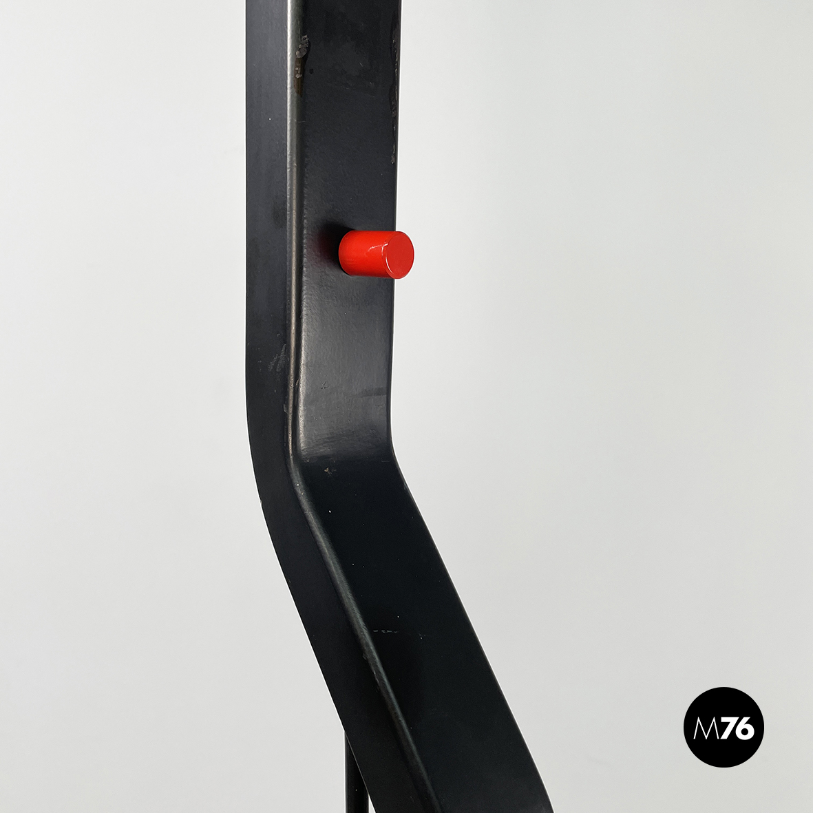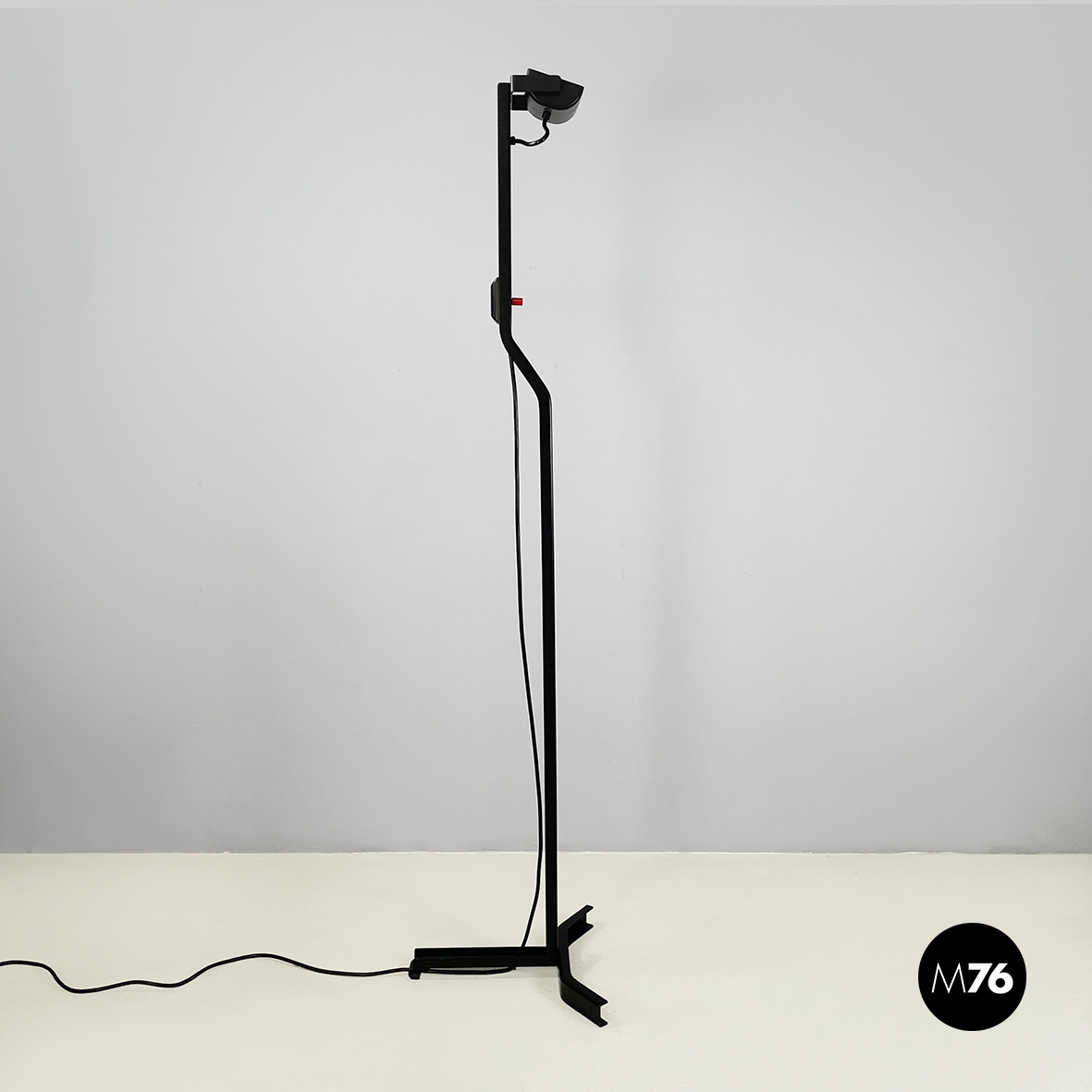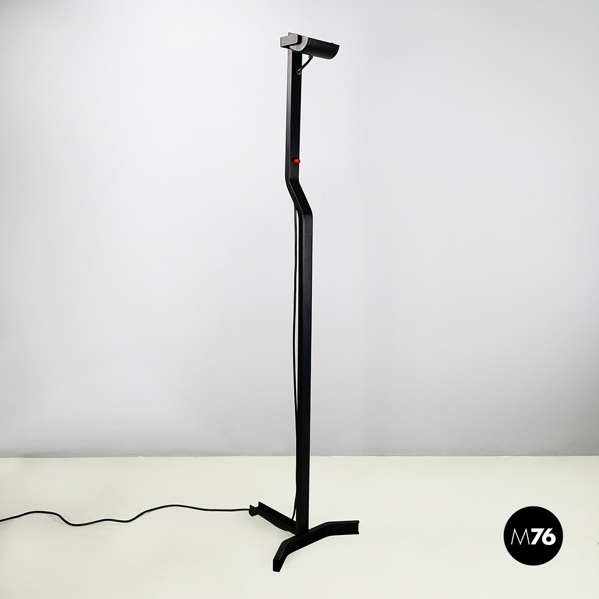 Lampada da terra modello Sirio con diffusore orientabile interamente in metallo nero. La struttura centrale è composta da una lamina in metallo incurvata a C. Al centro della struttura è presente l’interruttore dimmerabile cilindrico e rosso. La base è composta da tre zampe.