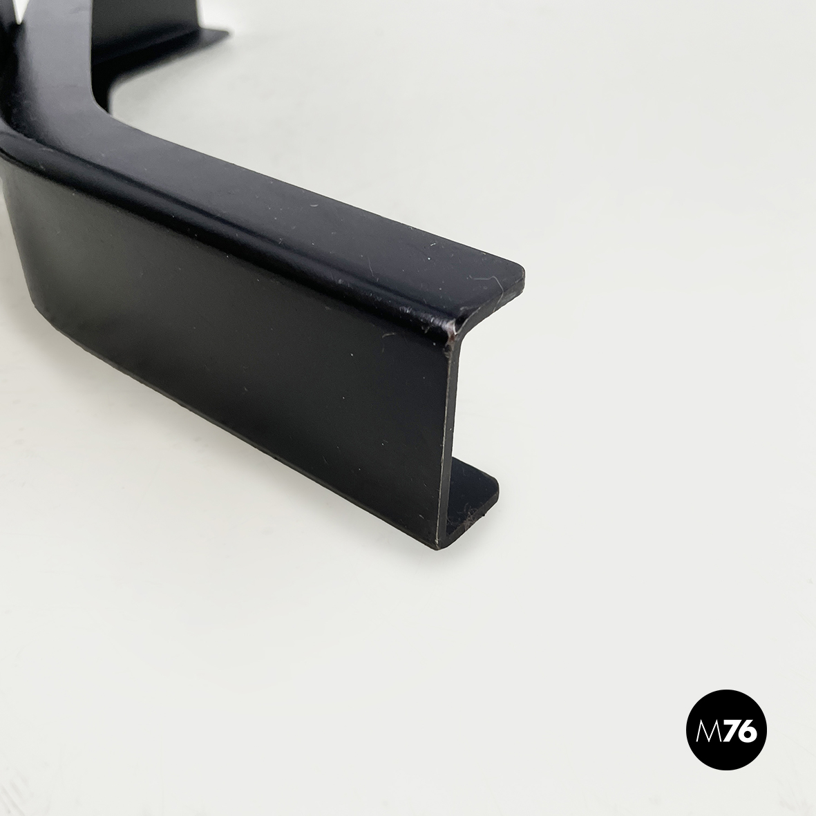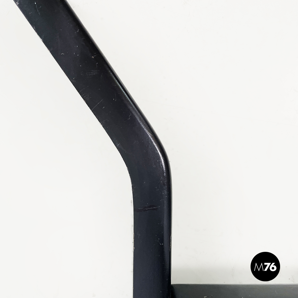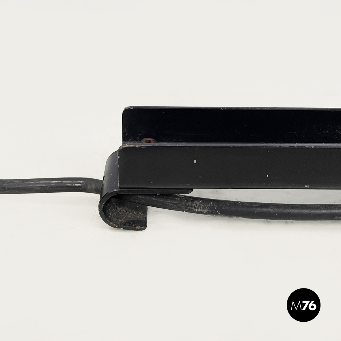 Lampada da terra modello Sirio con diffusore orientabile interamente in metallo nero. La struttura centrale è composta da una lamina in metallo incurvata a C. Al centro della struttura è presente l’interruttore dimmerabile cilindrico e rosso. La base è composta da tre zampe.