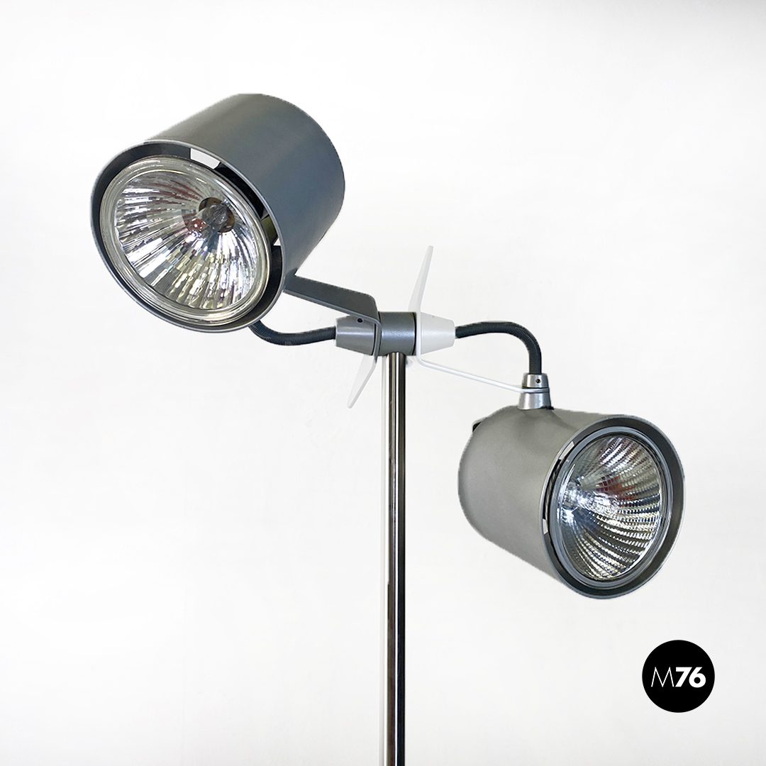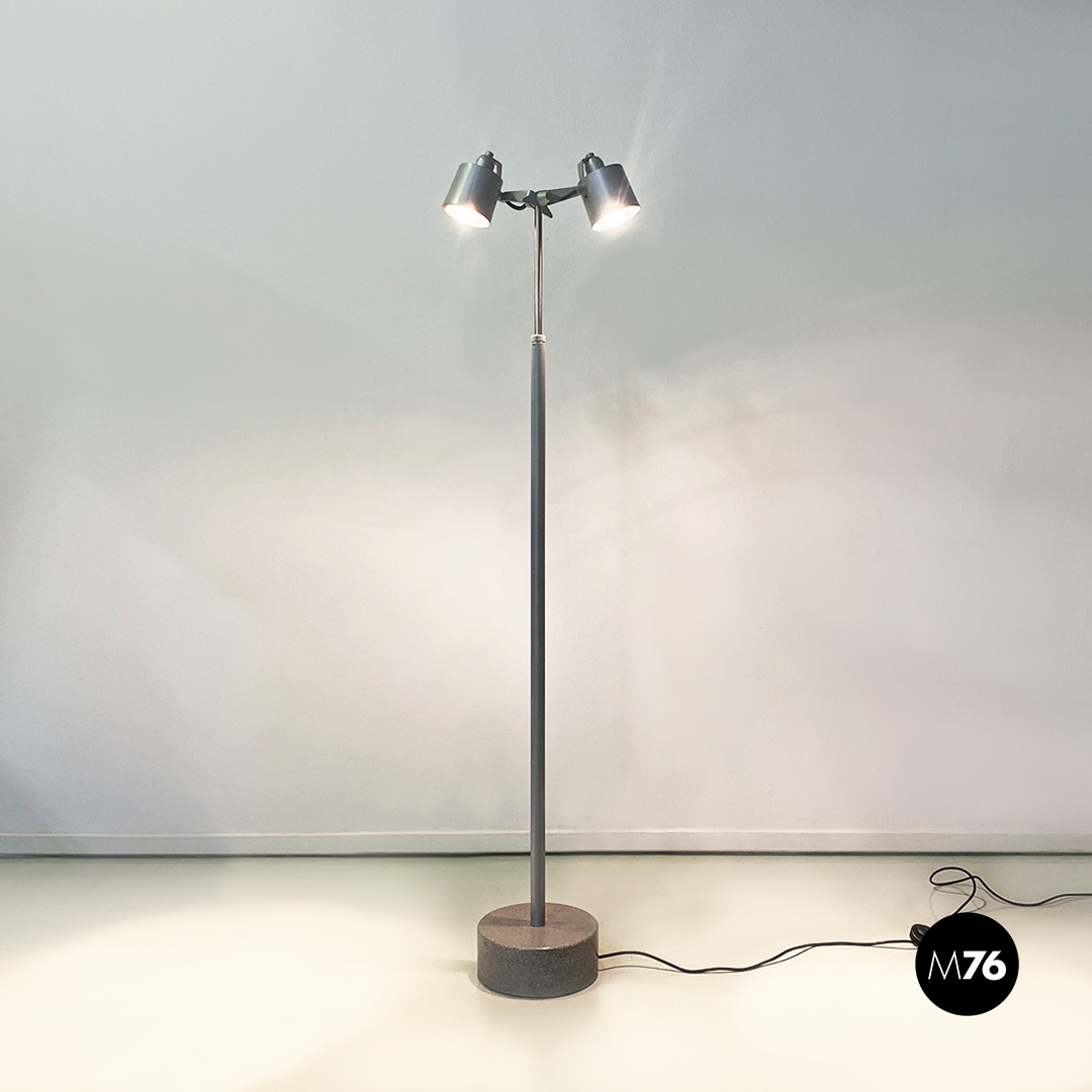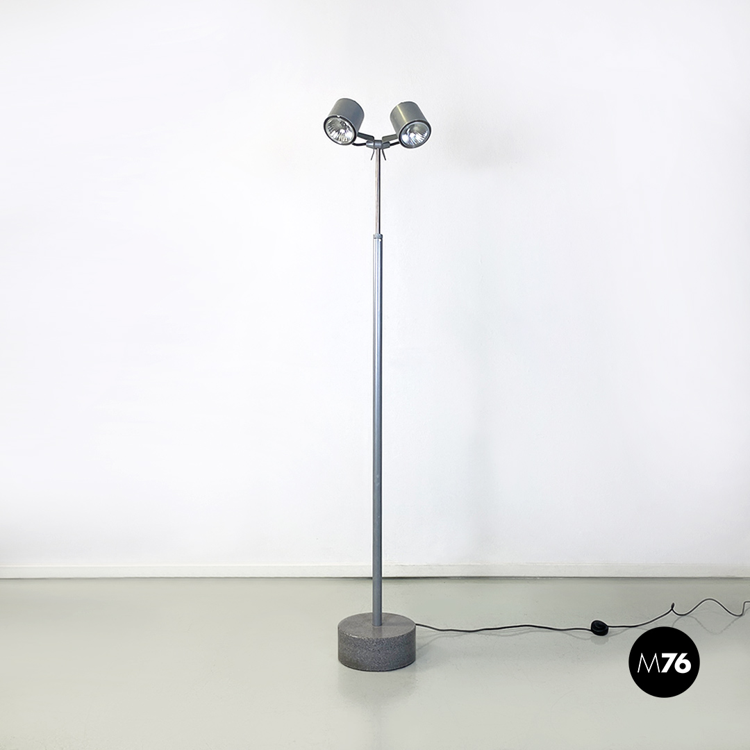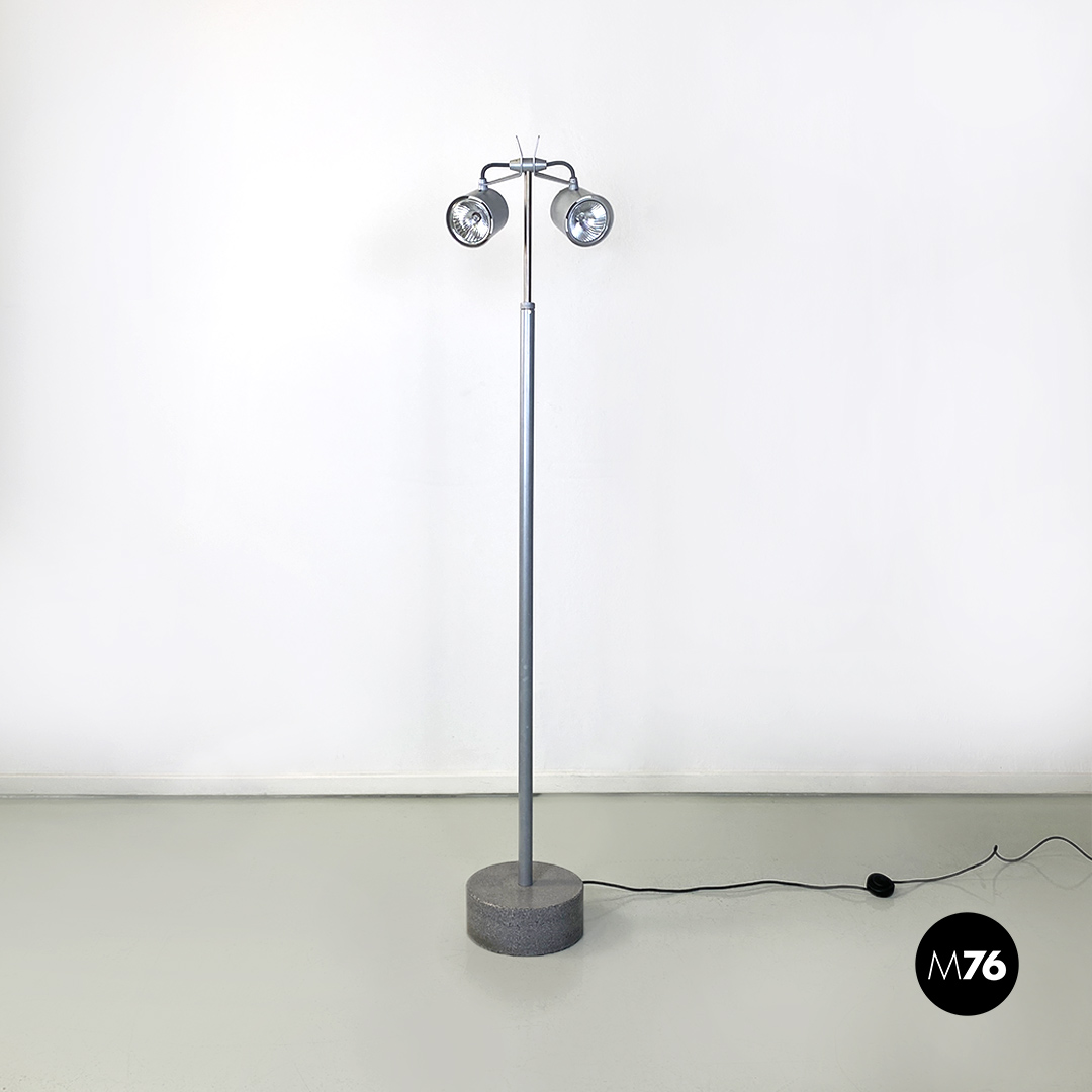 Lampada da terra modello Stadium con struttura con base in marmo Bardiglio grigio di forma tonda su cui è ancorato uno stelo in metallo sempre a sezione tonda con finitura argento opaco. Nella parte alta sono posti due faretti orientabili in lamiera d’acciaio di forma cilindrica con attacchi E27.