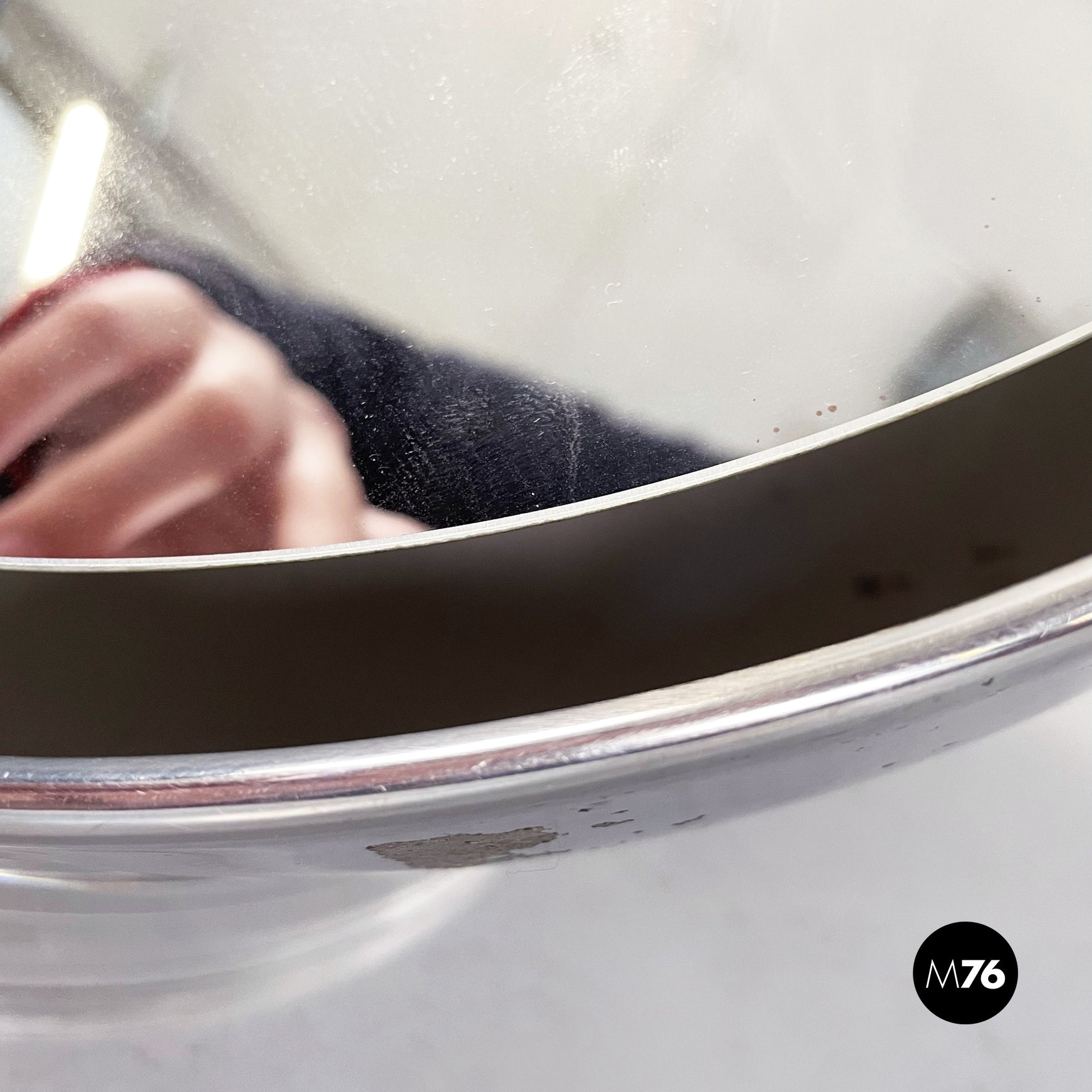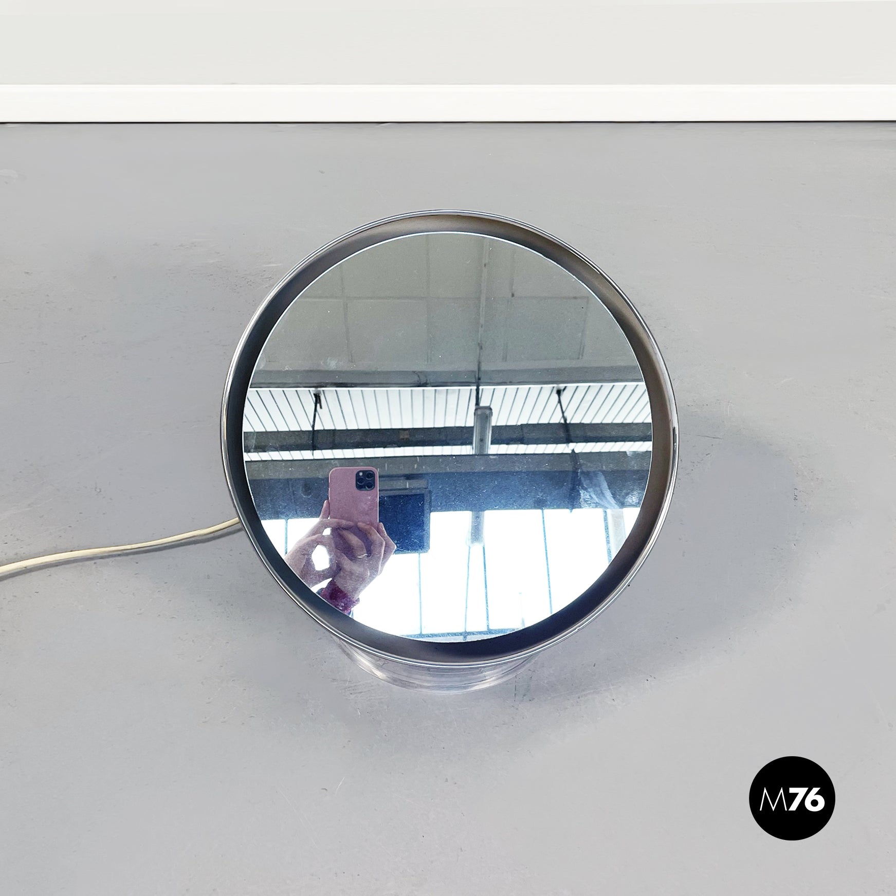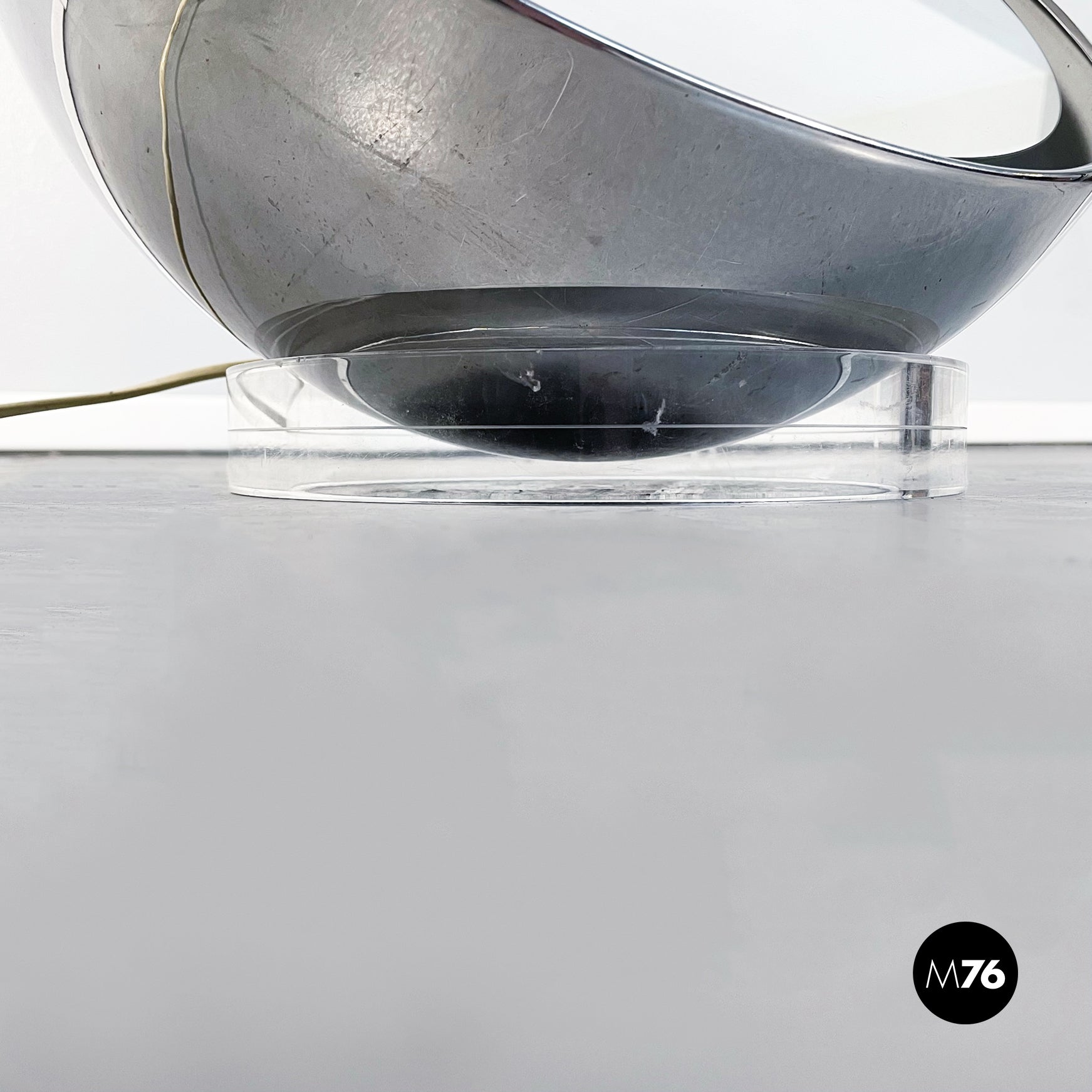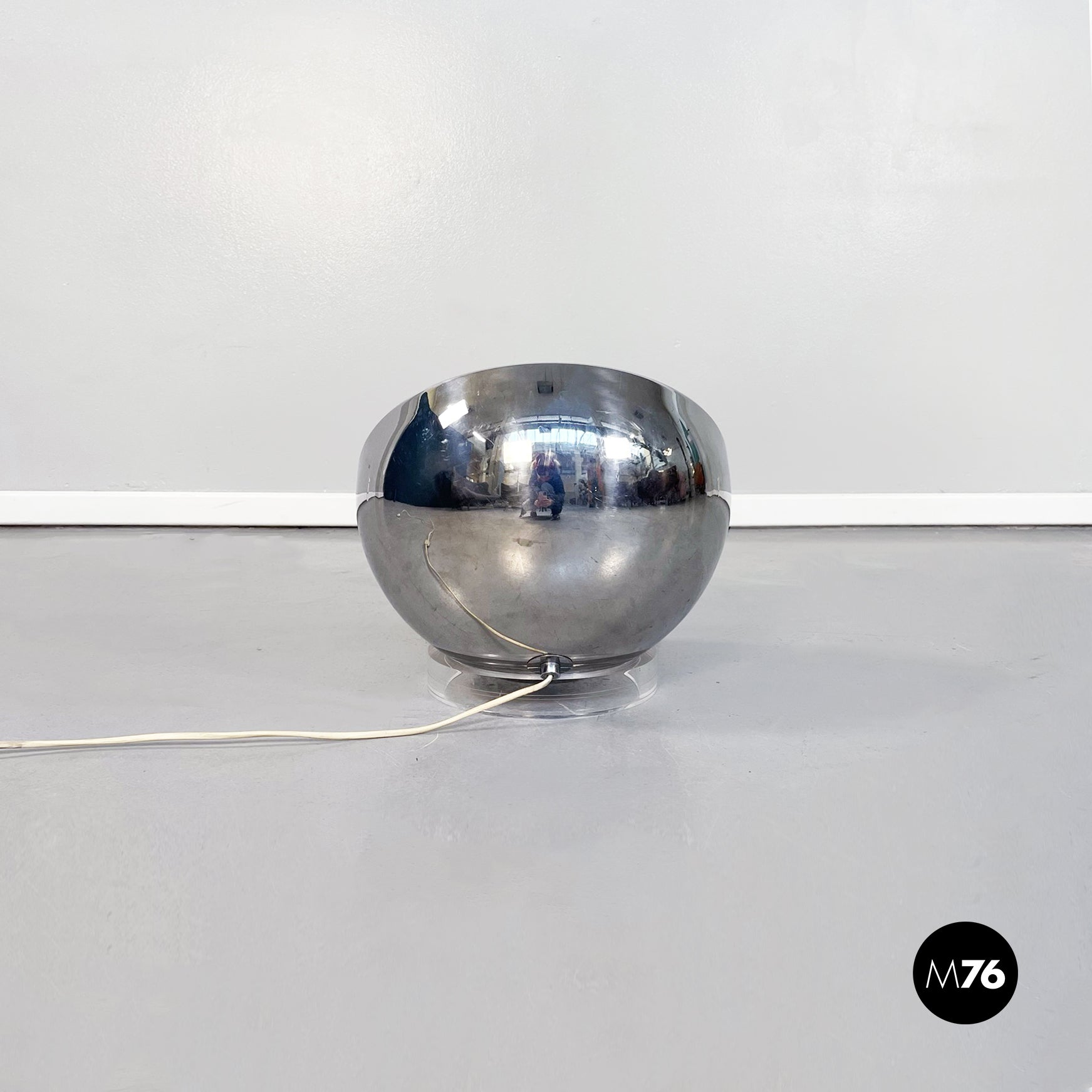 Lampada-specchio da tavolo di forma semi-sferica in acciaio con base circolare in plastica. Lo specchio è sospeso nel mezzo della semisfera ed è retroilluminato dalla lampada interna. La struttura è appoggiata su un anello circolare spesso in plastica trasparente.