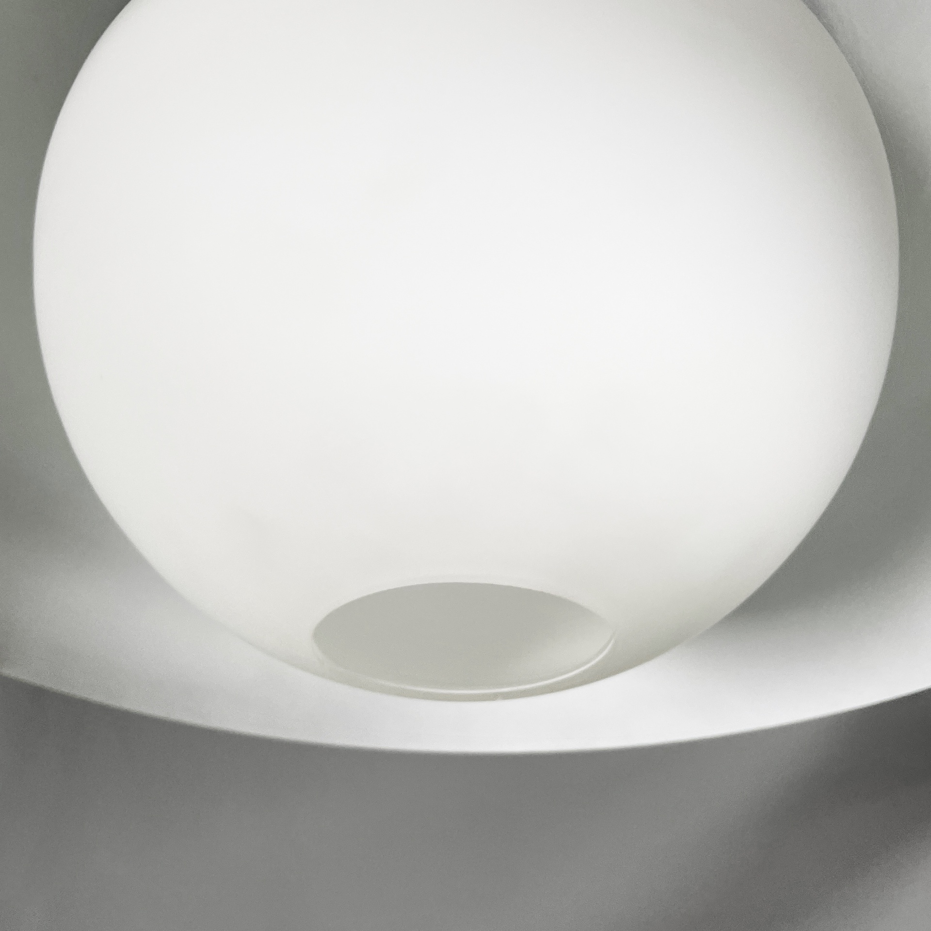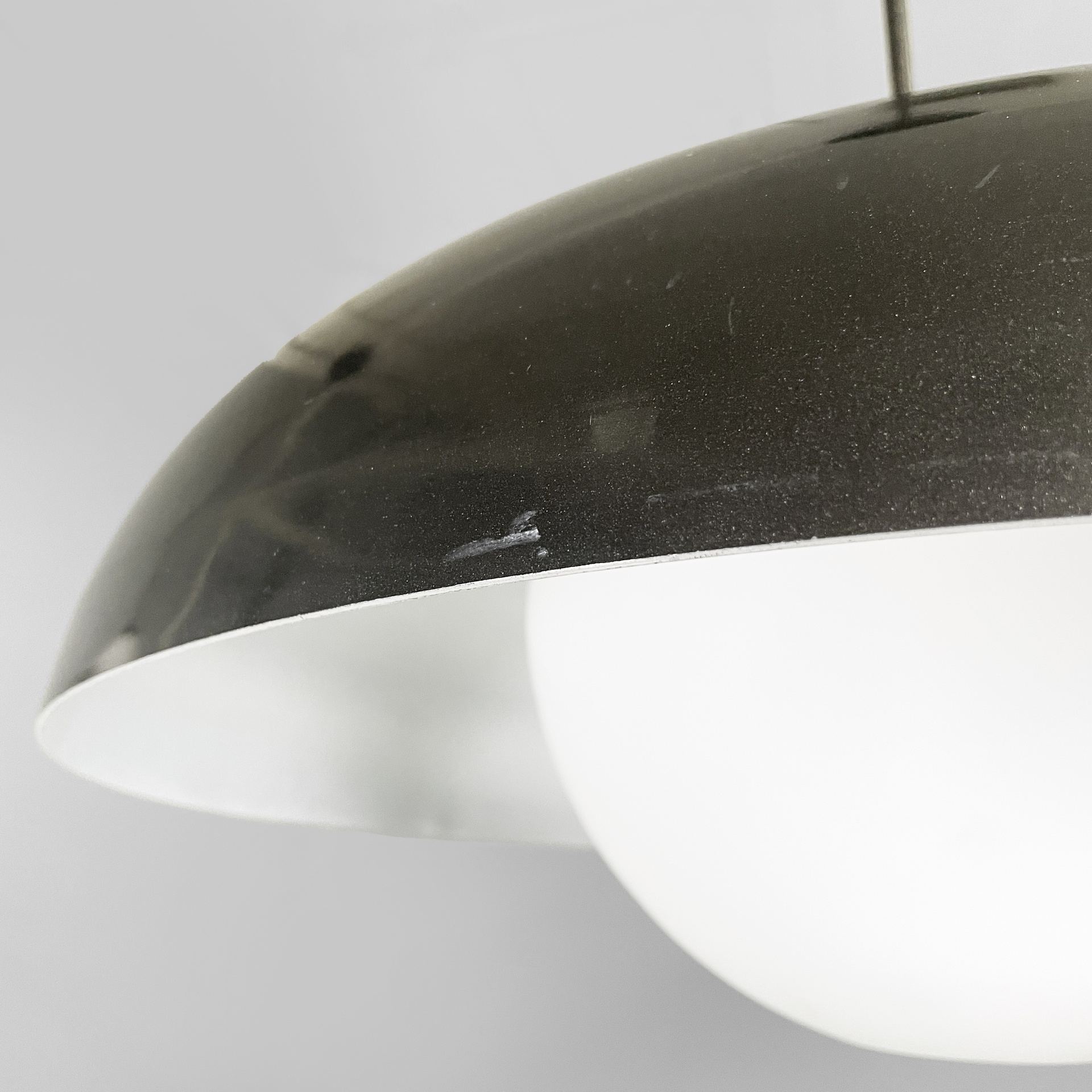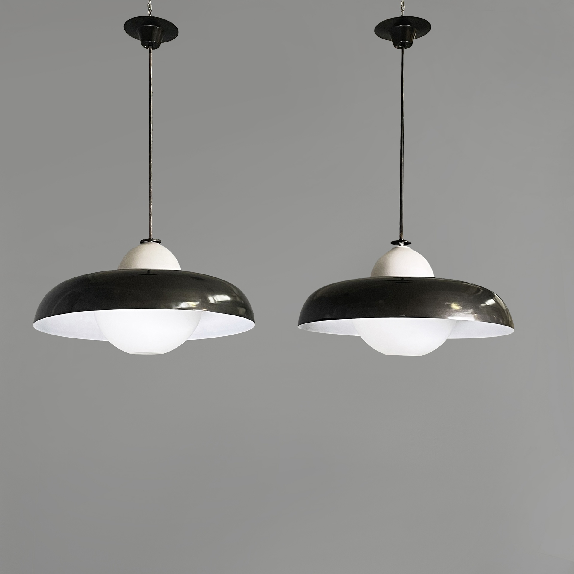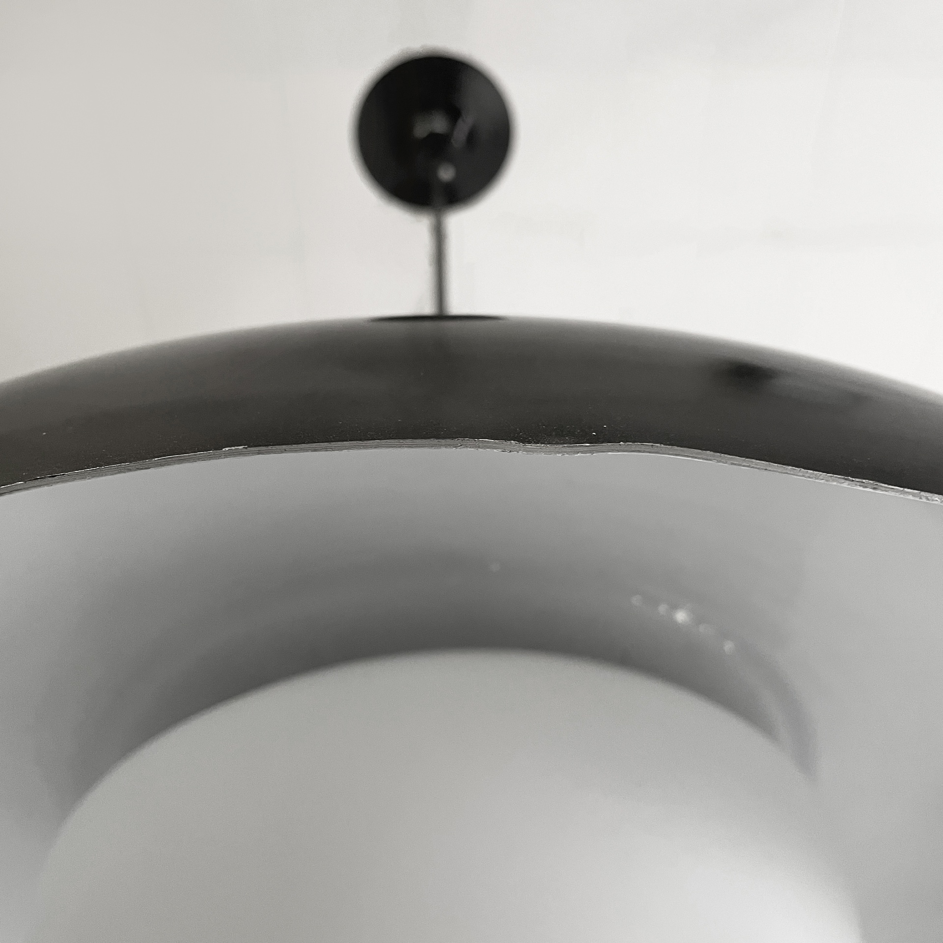 Coppia di lampadari modello LS8 con diffusore tondeggiante in vetro opalino, il quale presenta nel mezzo un paralume curvato in metallo verniciato bianco internamente e nero esternamente. Nella parte inferiore del diffusore è presente un foro decorativo. L’asta è in tondino di metallo. Attacco al soffitto in metallo nero.