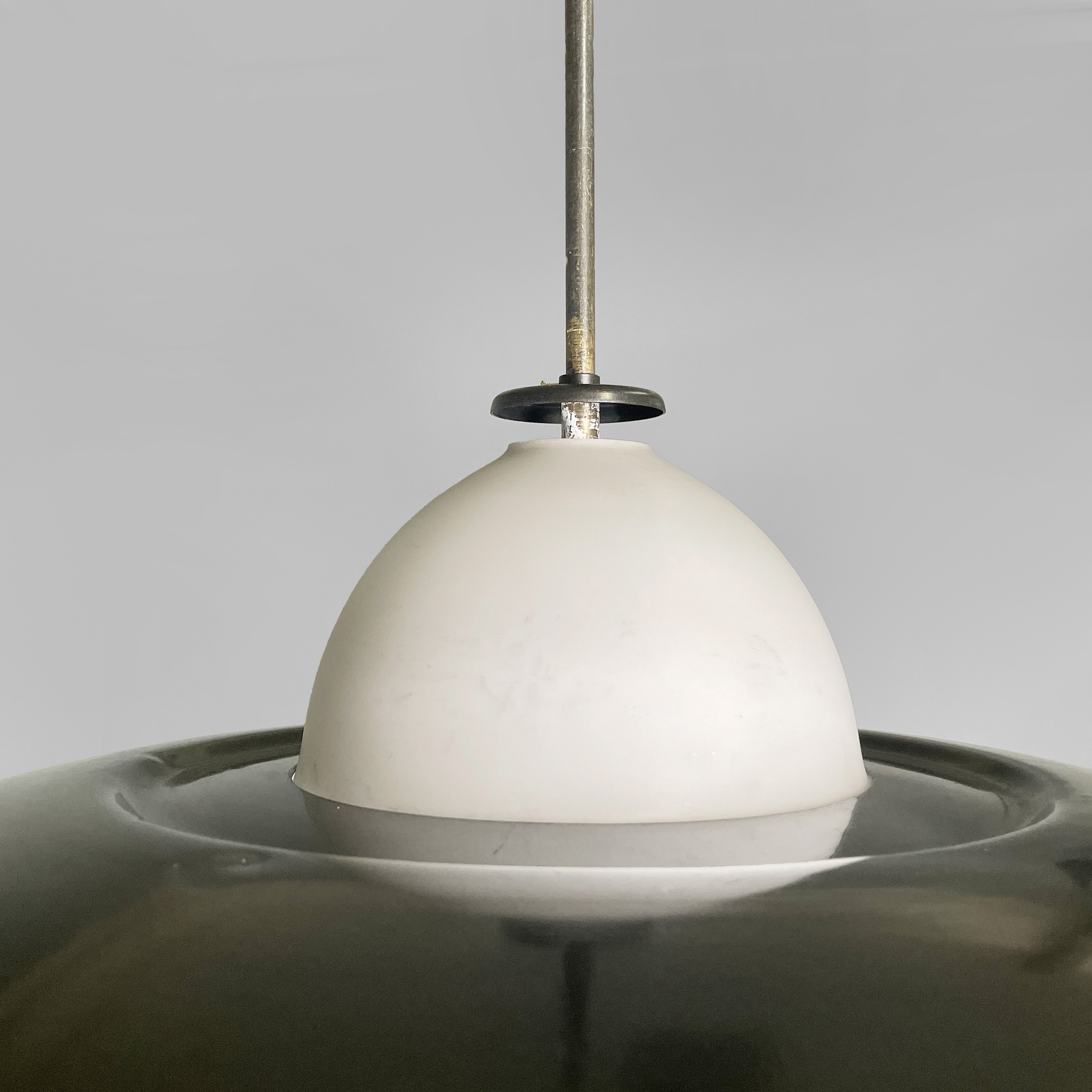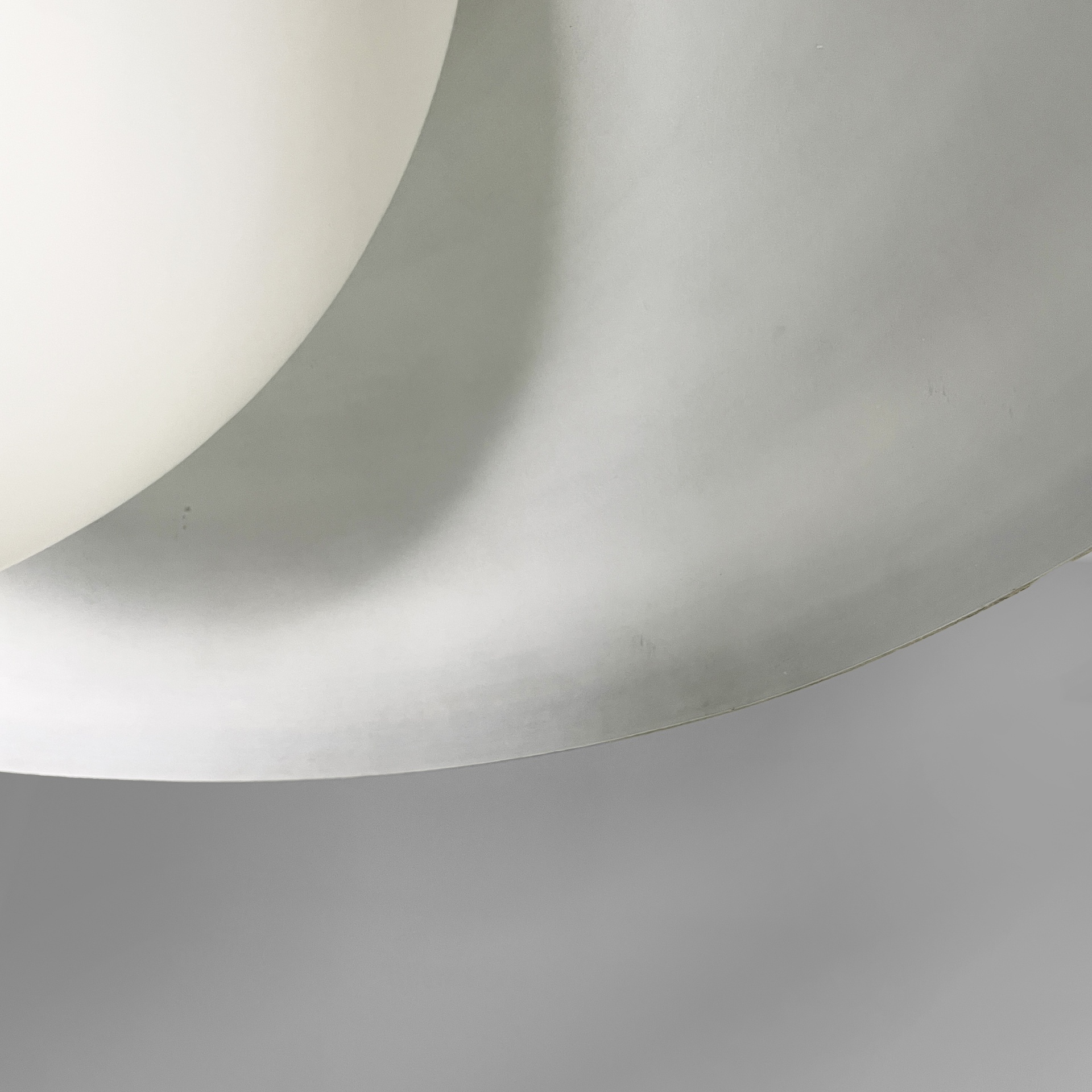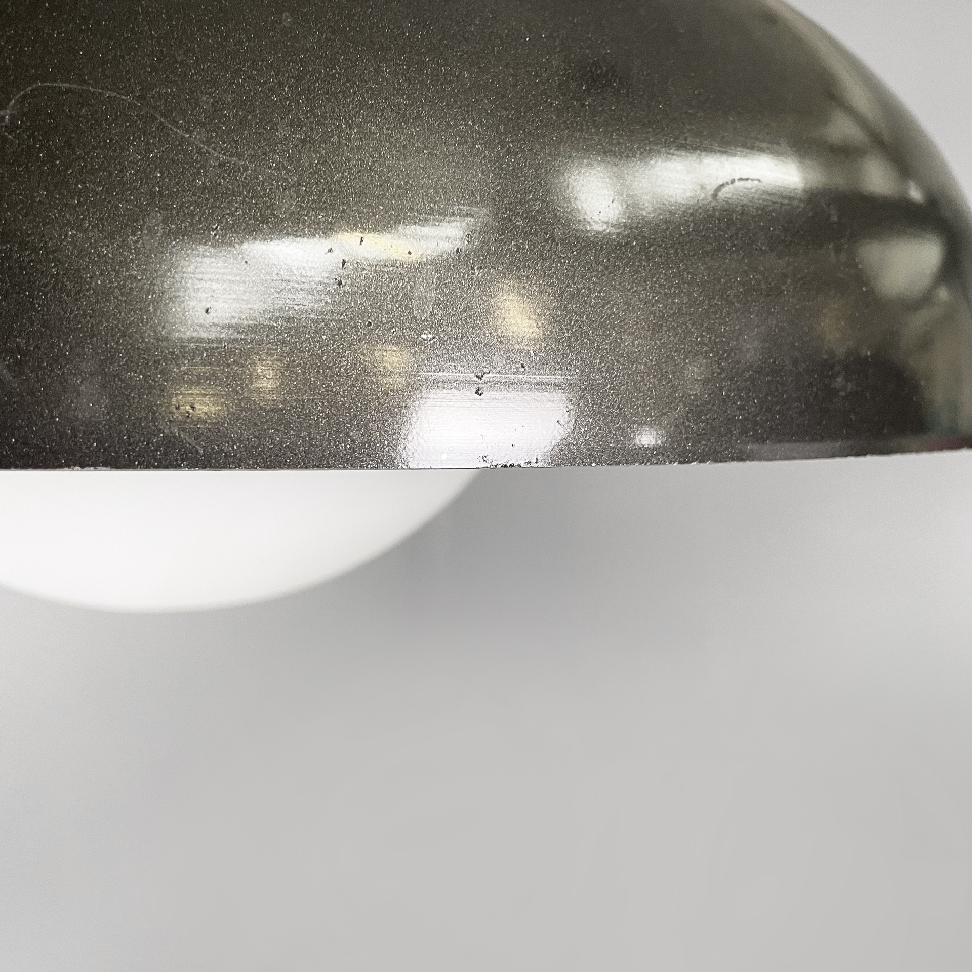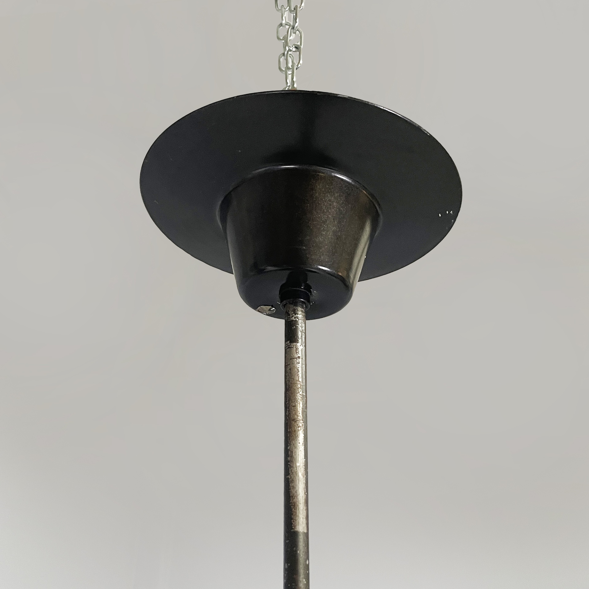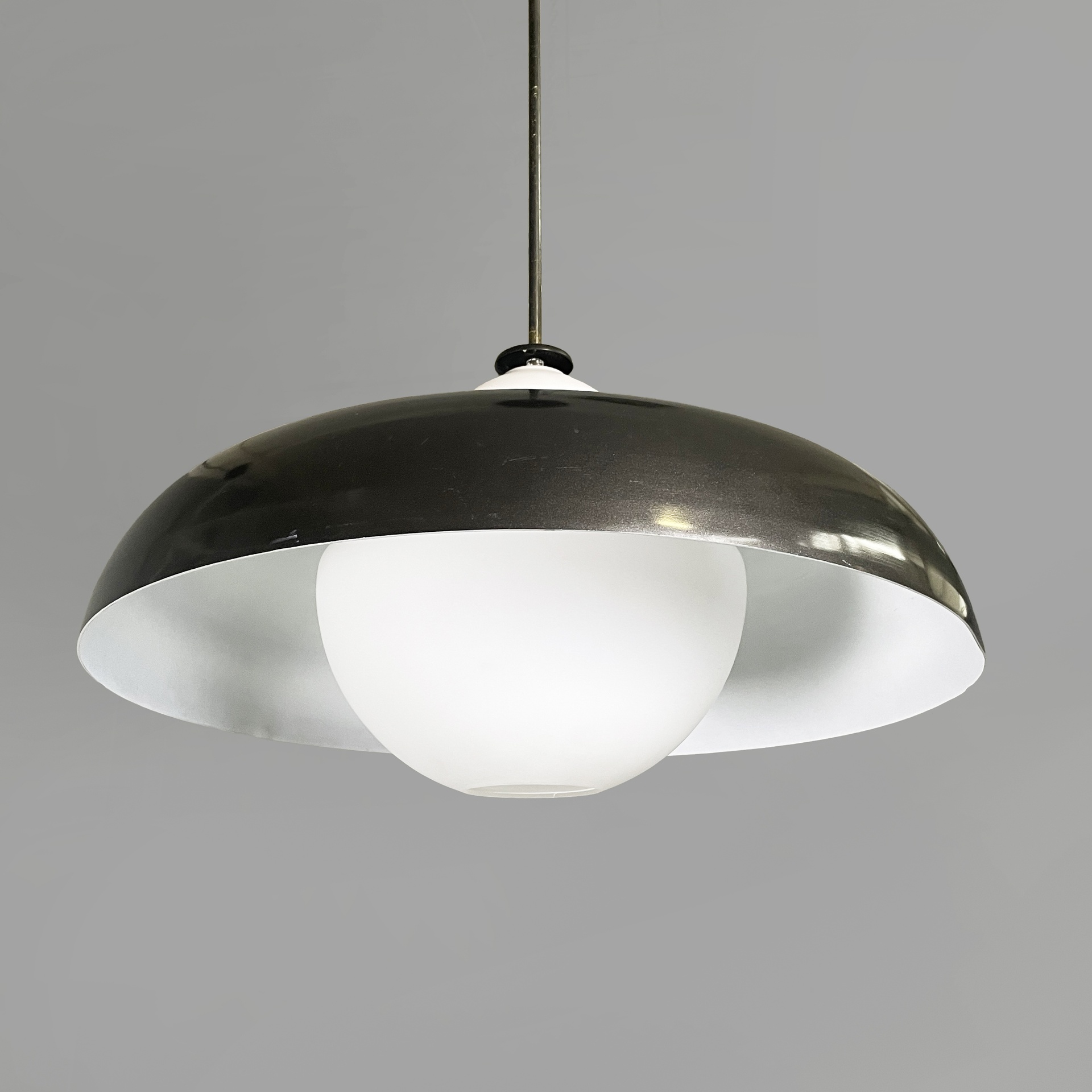 Coppia di lampadari modello LS8 con diffusore tondeggiante in vetro opalino, il quale presenta nel mezzo un paralume curvato in metallo verniciato bianco internamente e nero esternamente. Nella parte inferiore del diffusore è presente un foro decorativo. L’asta è in tondino di metallo. Attacco al soffitto in metallo nero.