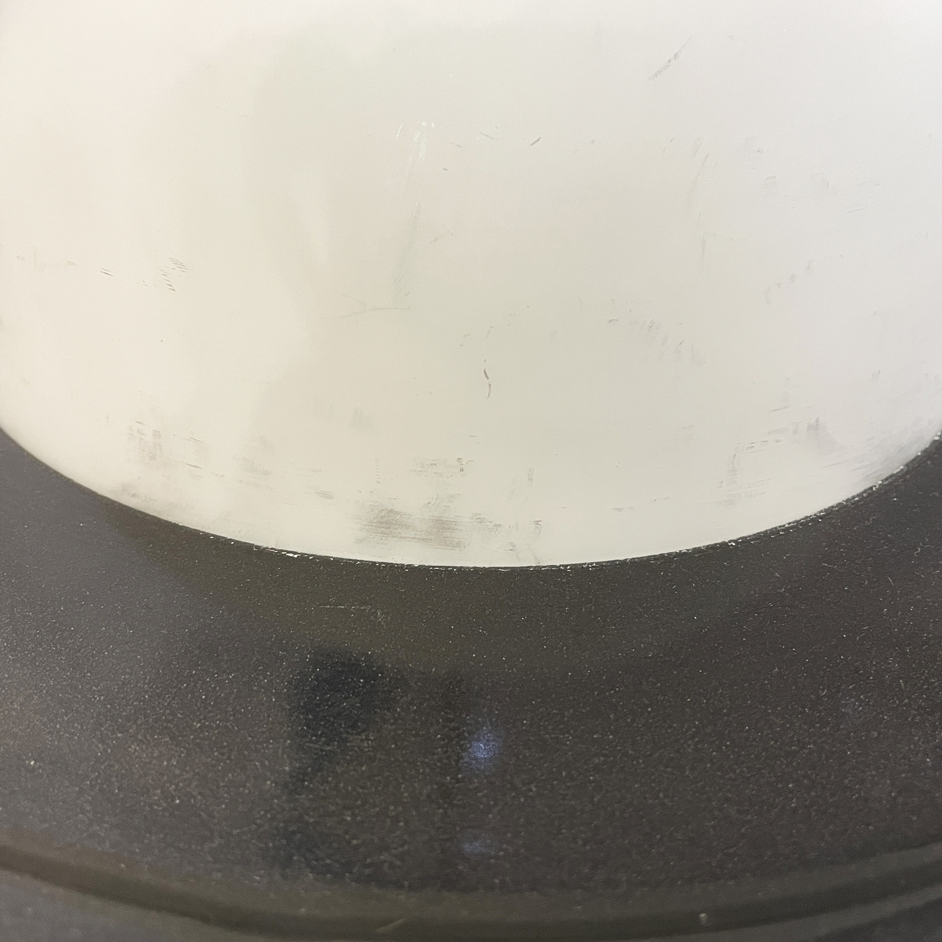 Buone condizioni. Il vetro presenta alcuni segni dati dal tempo. Il paralume in metallo presenta qualche difetto, graffi e piccole mancanze di vernice. La struttura in metallo presenta numero segni del tempo.