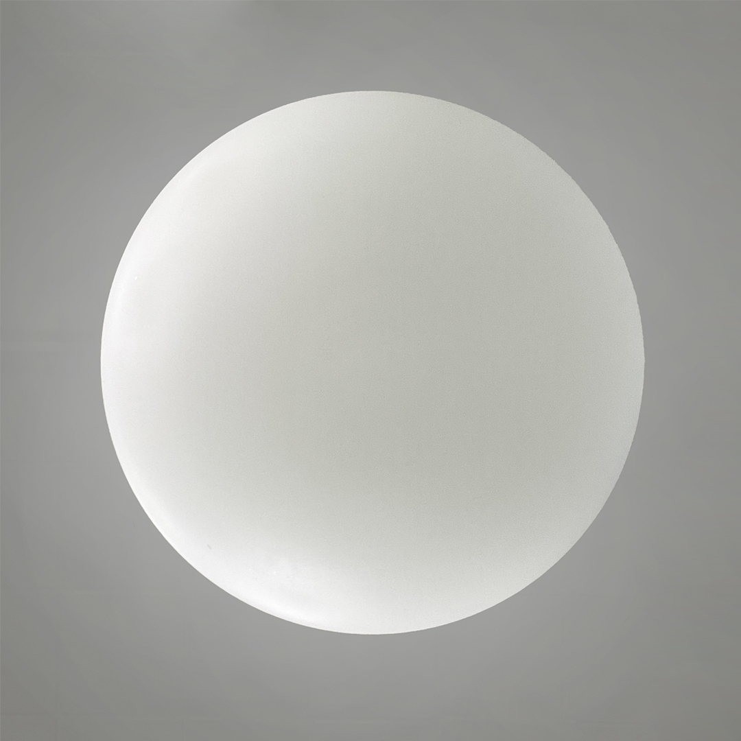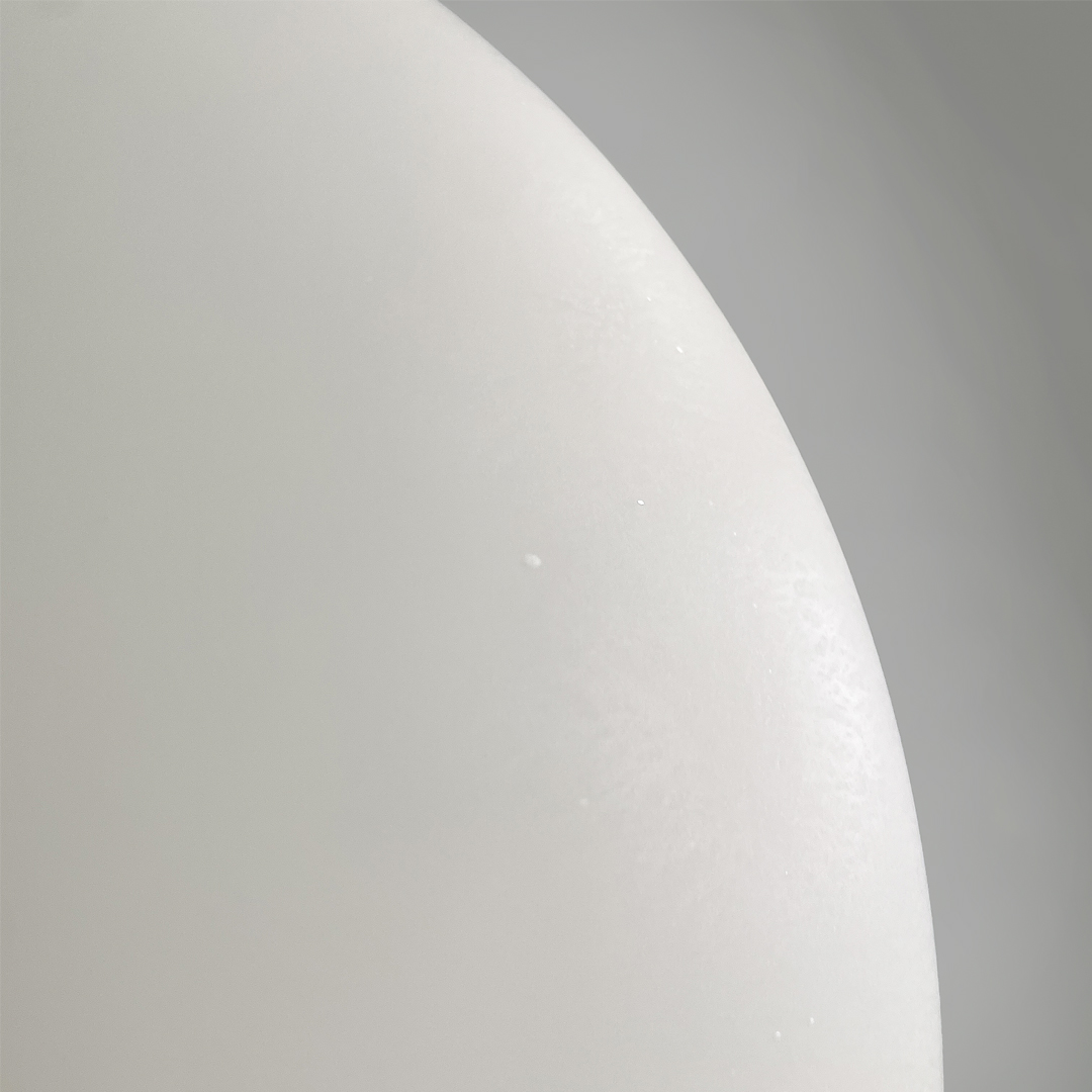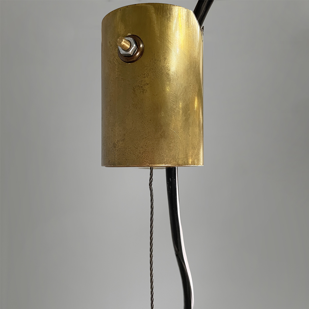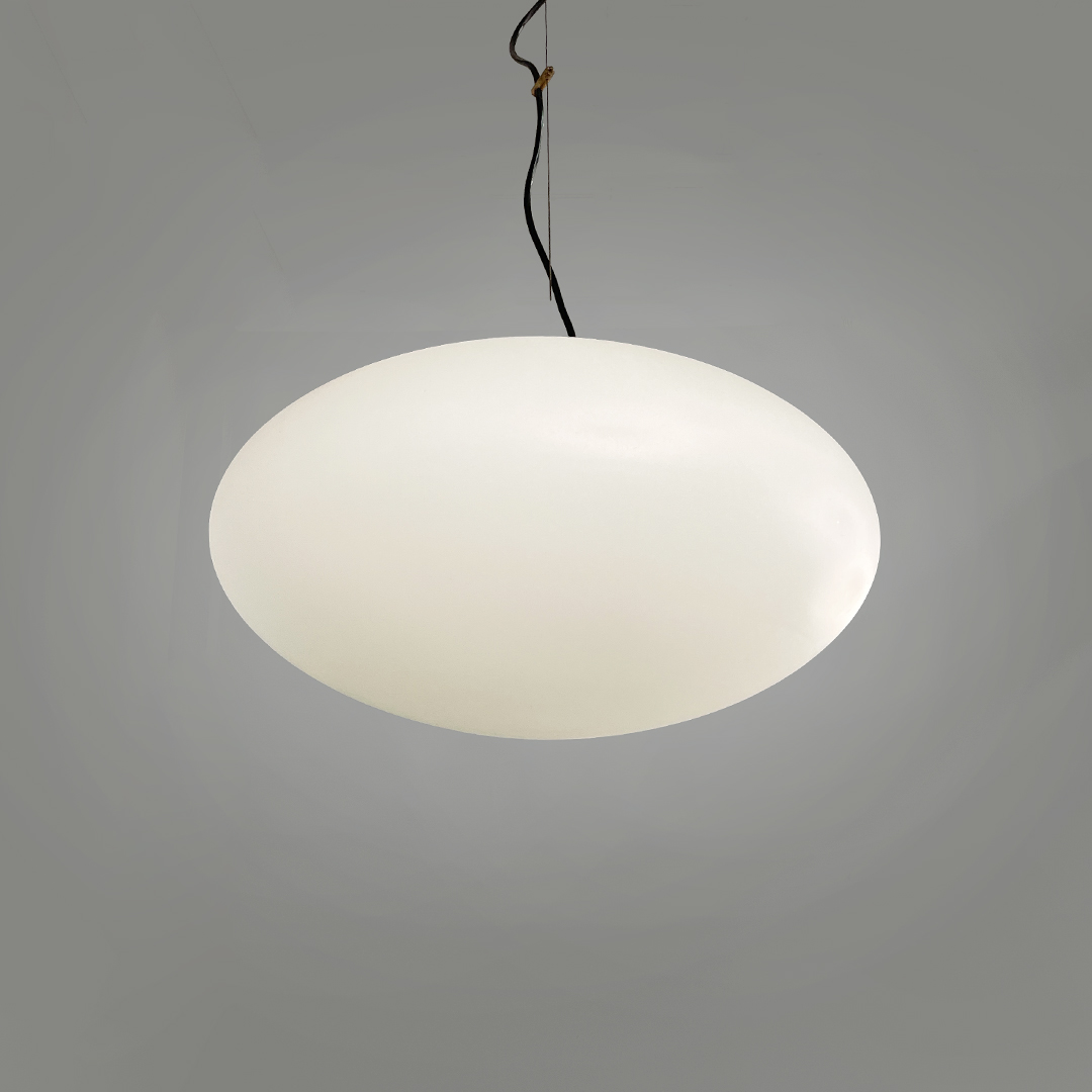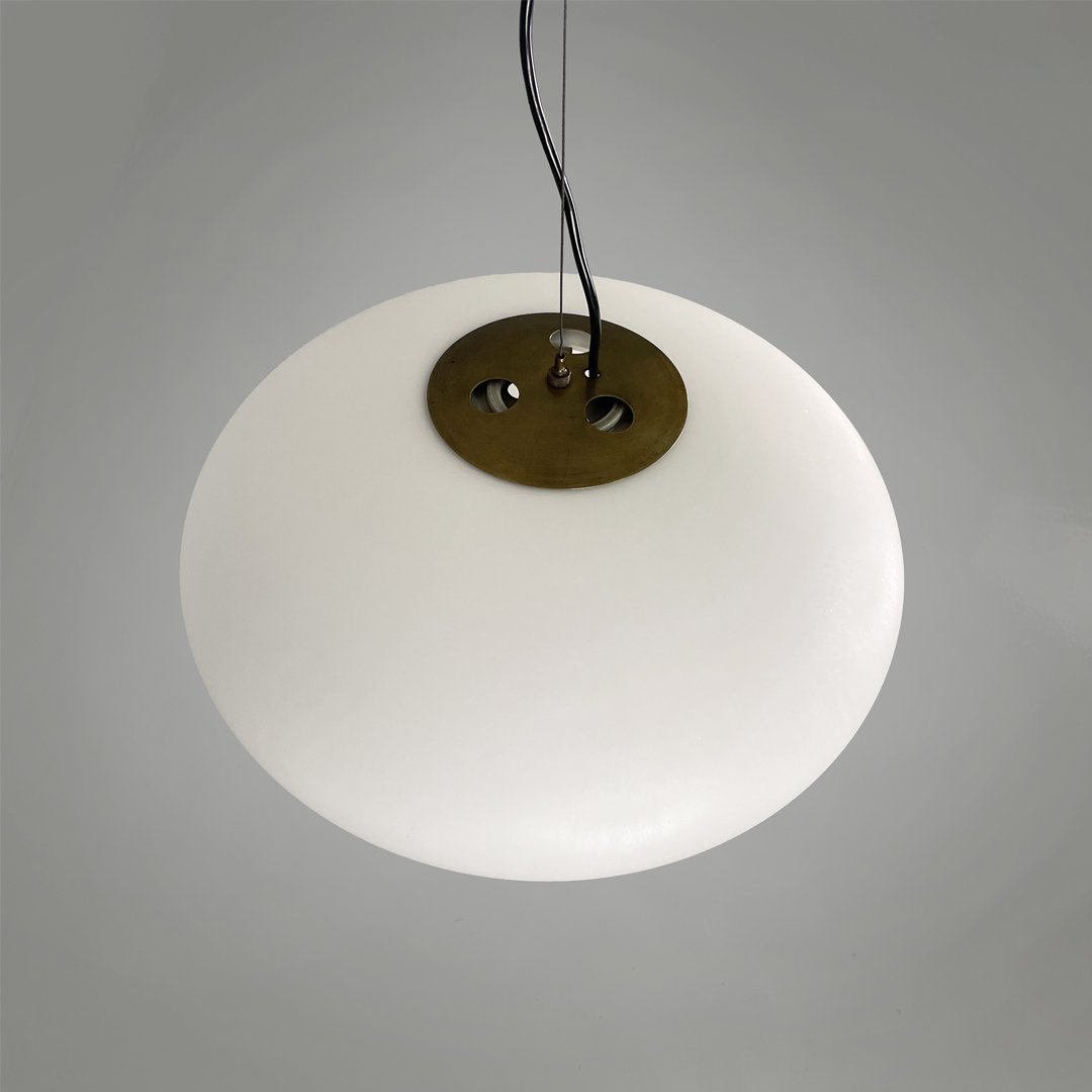 Lampadario modello 1104 a base tonda. Il diffusore è in vetro opalino. Un filo in metallo e il cavo in plastica nero sono uniti tramite un piccolo cilindro in metallo. L’attacco al soffitto è in ottone.