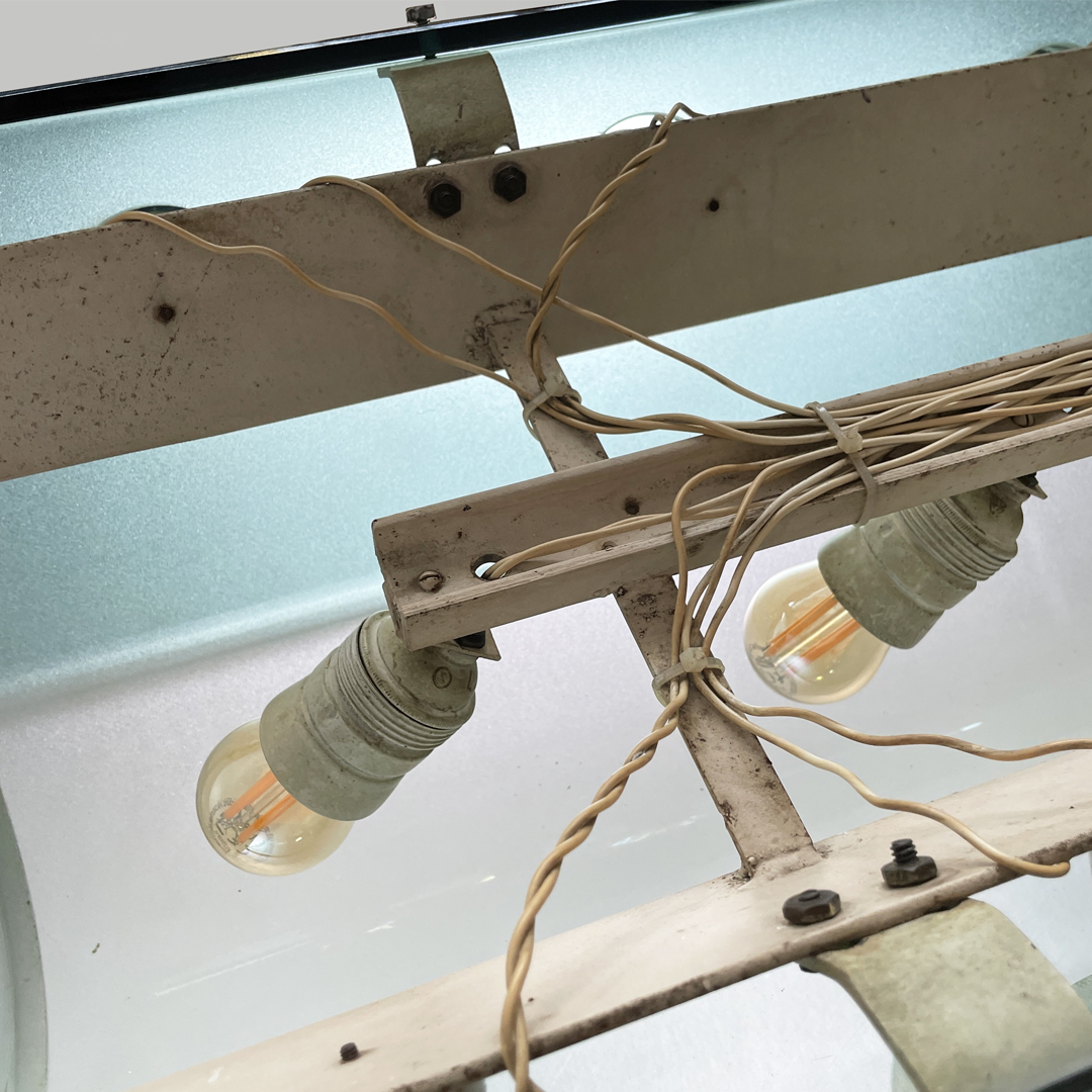 Presenta un lungo corpo a V con base arrotondata, in vetro smerigliato illuminato da sei lampadine nascoste e sormontato da due supporti a V in ottone.