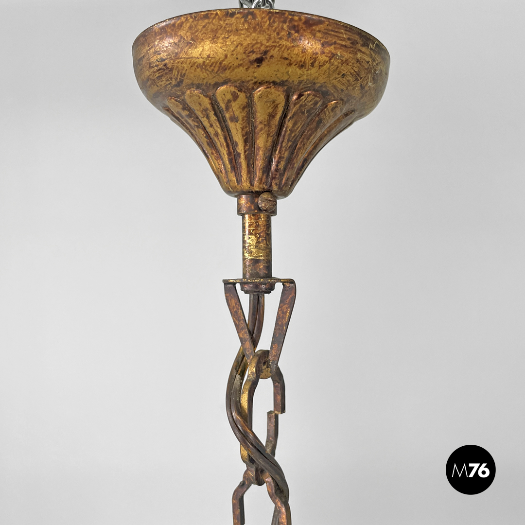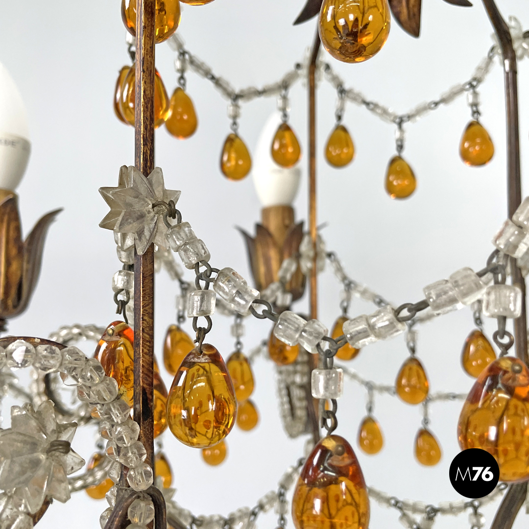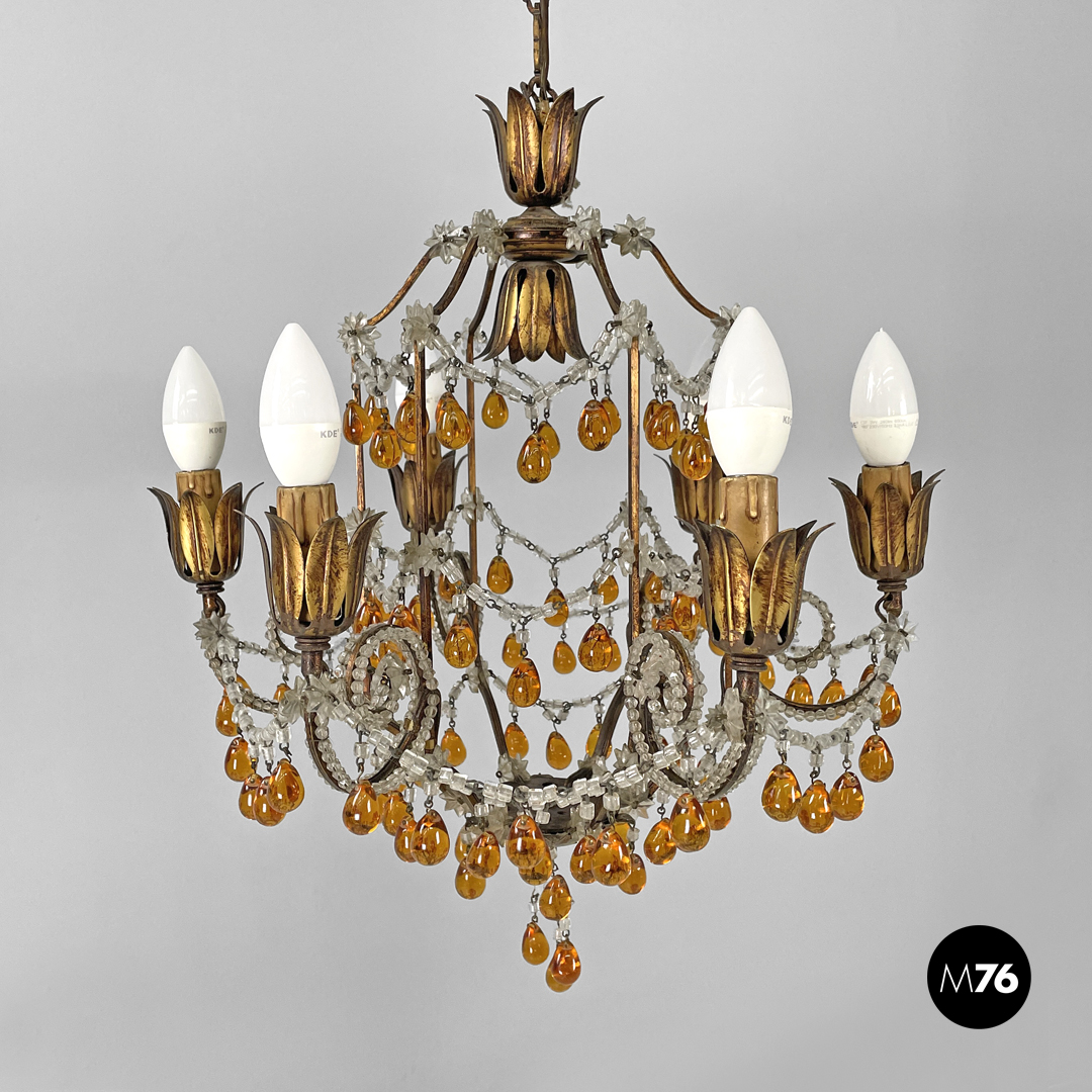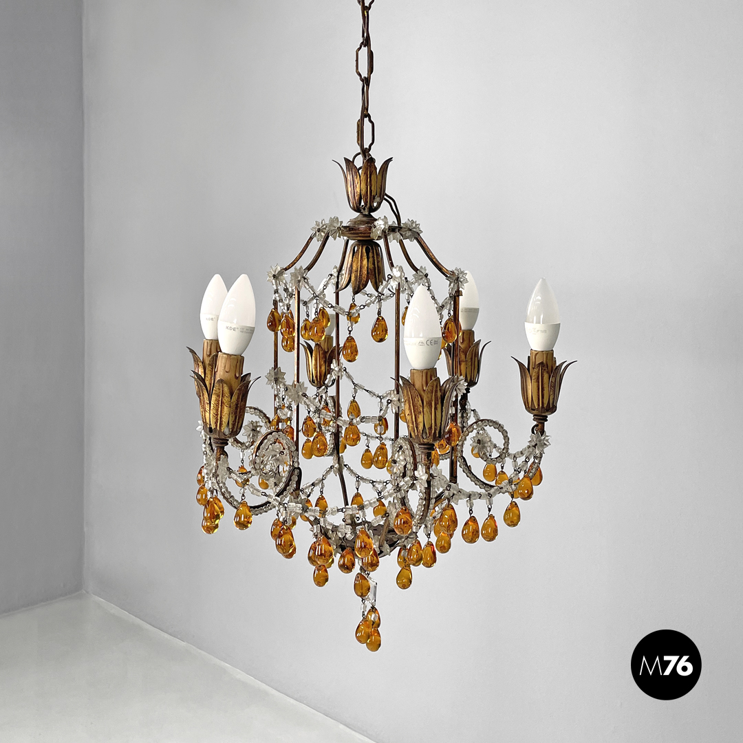 Lampadario a base tonda. La struttura è in metallo verniciato di colore oro la parte centrale è composta da sei tondini da cui si sviluppano sei bracci che si piegano e curvano verso l’alto terminando con una decorazione floreale dove poggiano i punti luce. Su tutta la struttura si articolano catenelle con perline di vetro trasparenti con gocce di vetro color ambra. L’attacco al muro è dato da una coppiglia che si collega alla struttura tramite una catena.