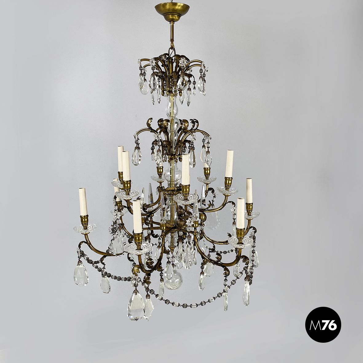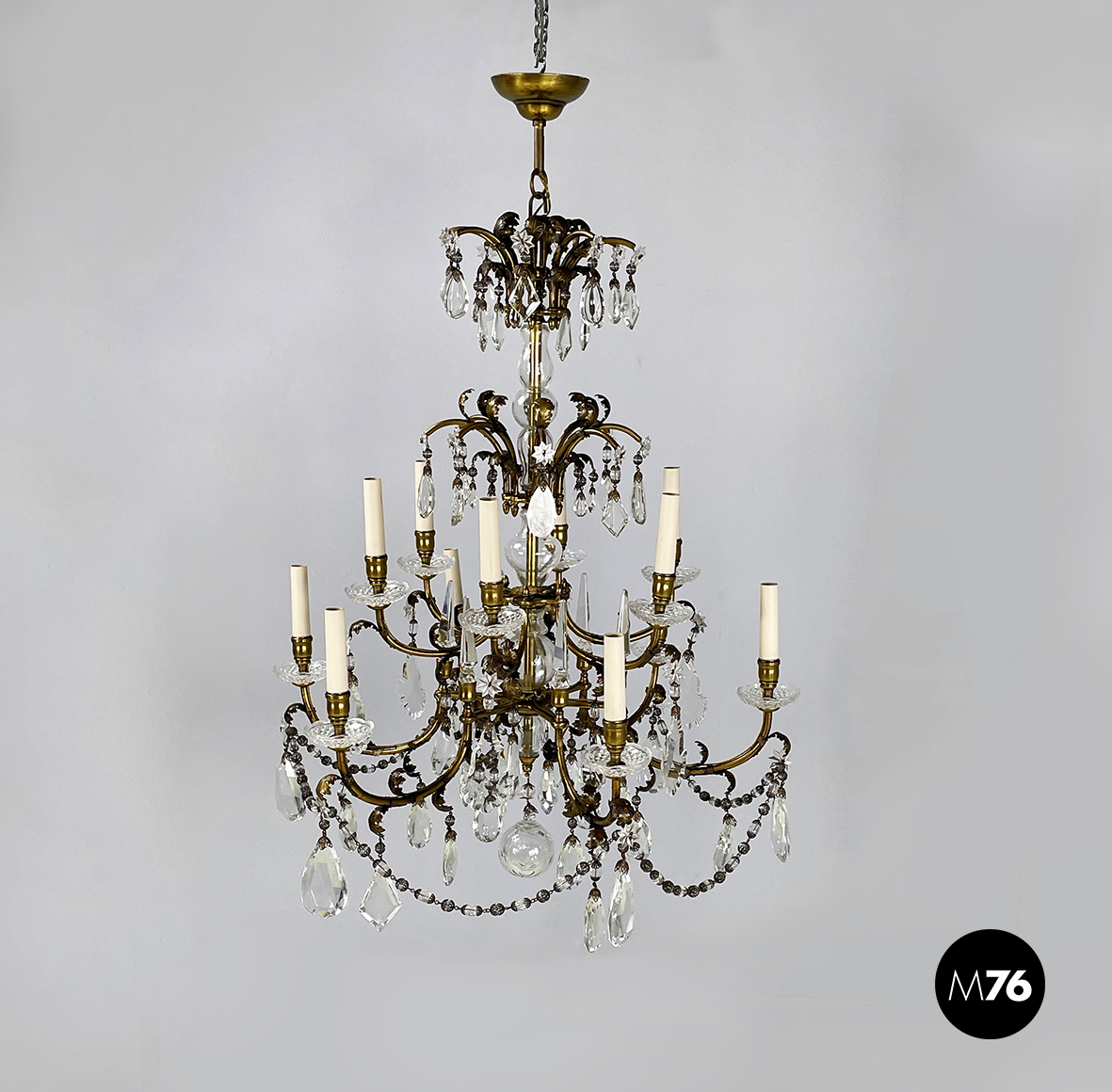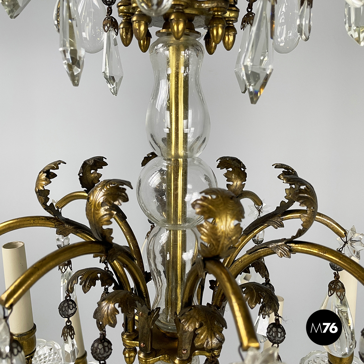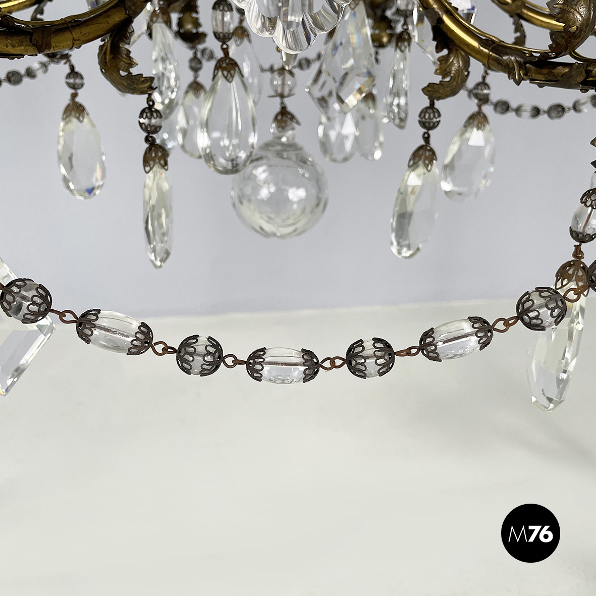 Lampadario a gocce a base tonda. La struttura in ottone è composta un tubolare di ottone centrale con dodici bracci curvi divisi su due piani di altezze differenti e bracci più corti con decorazione a foglie. Ognuno dei dodici bracci presenta un punto luce a forma di candela co. Su tutta la struttura si articolano gocce di vetro catenelle metalliche con perline di vetro tondeggianti e a forma di fiore e coppette decorative. L’attacco al soffitto è in ottone.