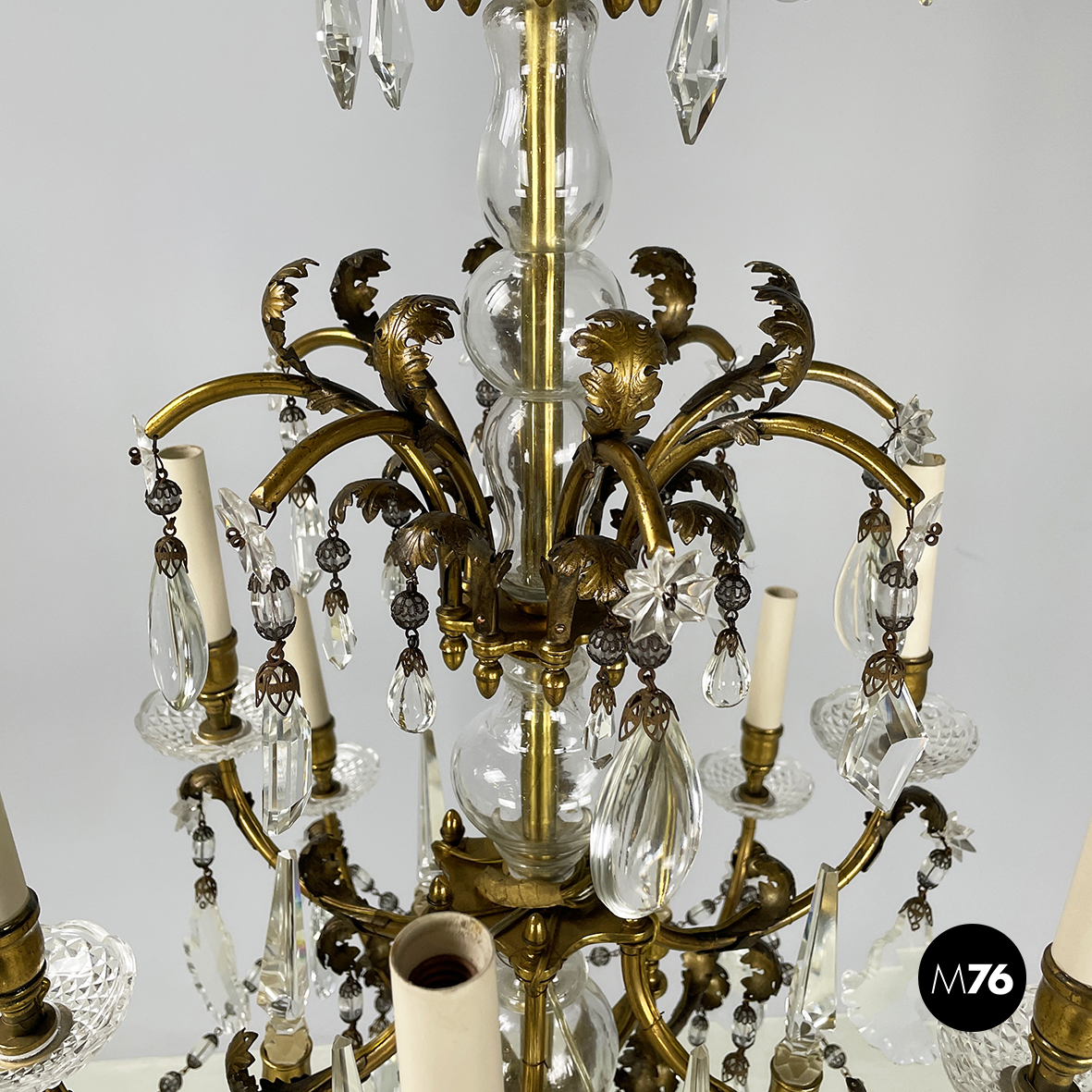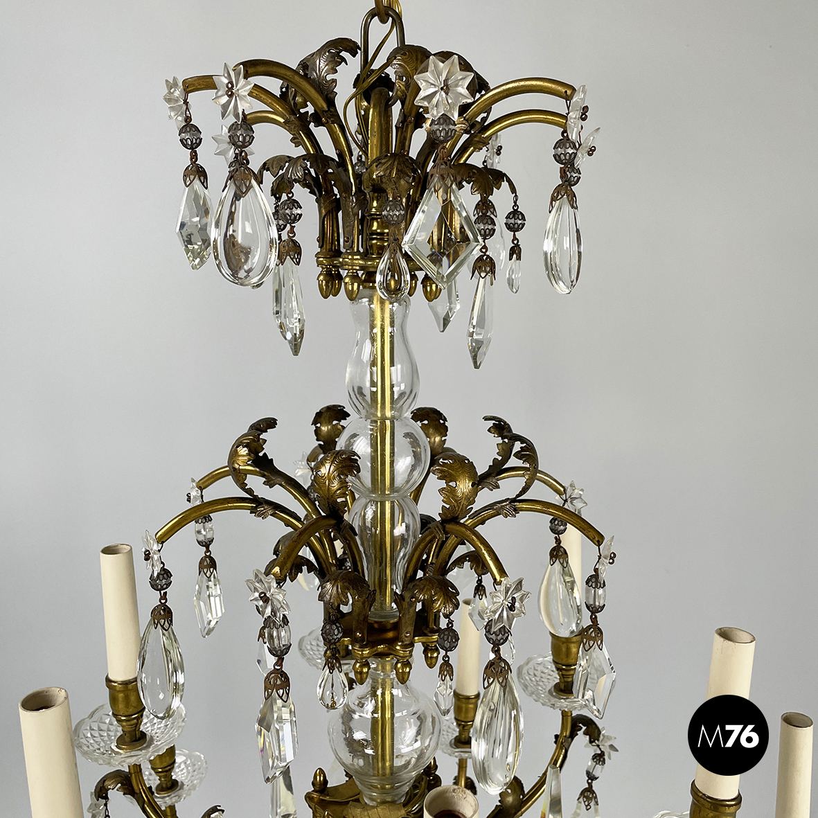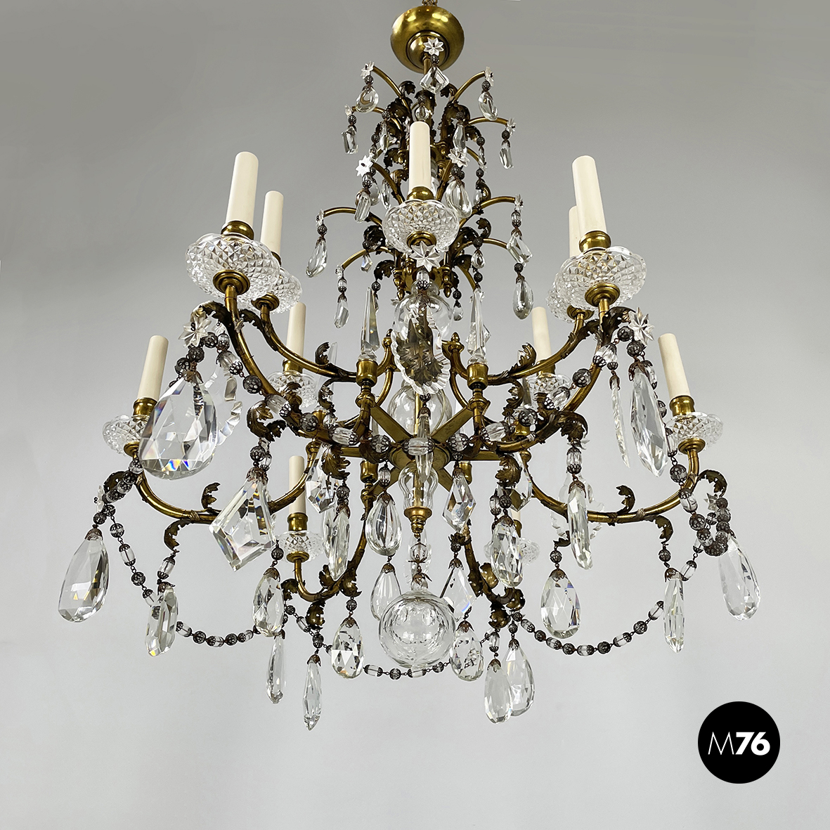 Lampadario a gocce a base tonda. La struttura in ottone è composta un tubolare di ottone centrale con dodici bracci curvi divisi su due piani di altezze differenti e bracci più corti con decorazione a foglie. Ognuno dei dodici bracci presenta un punto luce a forma di candela co. Su tutta la struttura si articolano gocce di vetro catenelle metalliche con perline di vetro tondeggianti e a forma di fiore e coppette decorative. L’attacco al soffitto è in ottone.